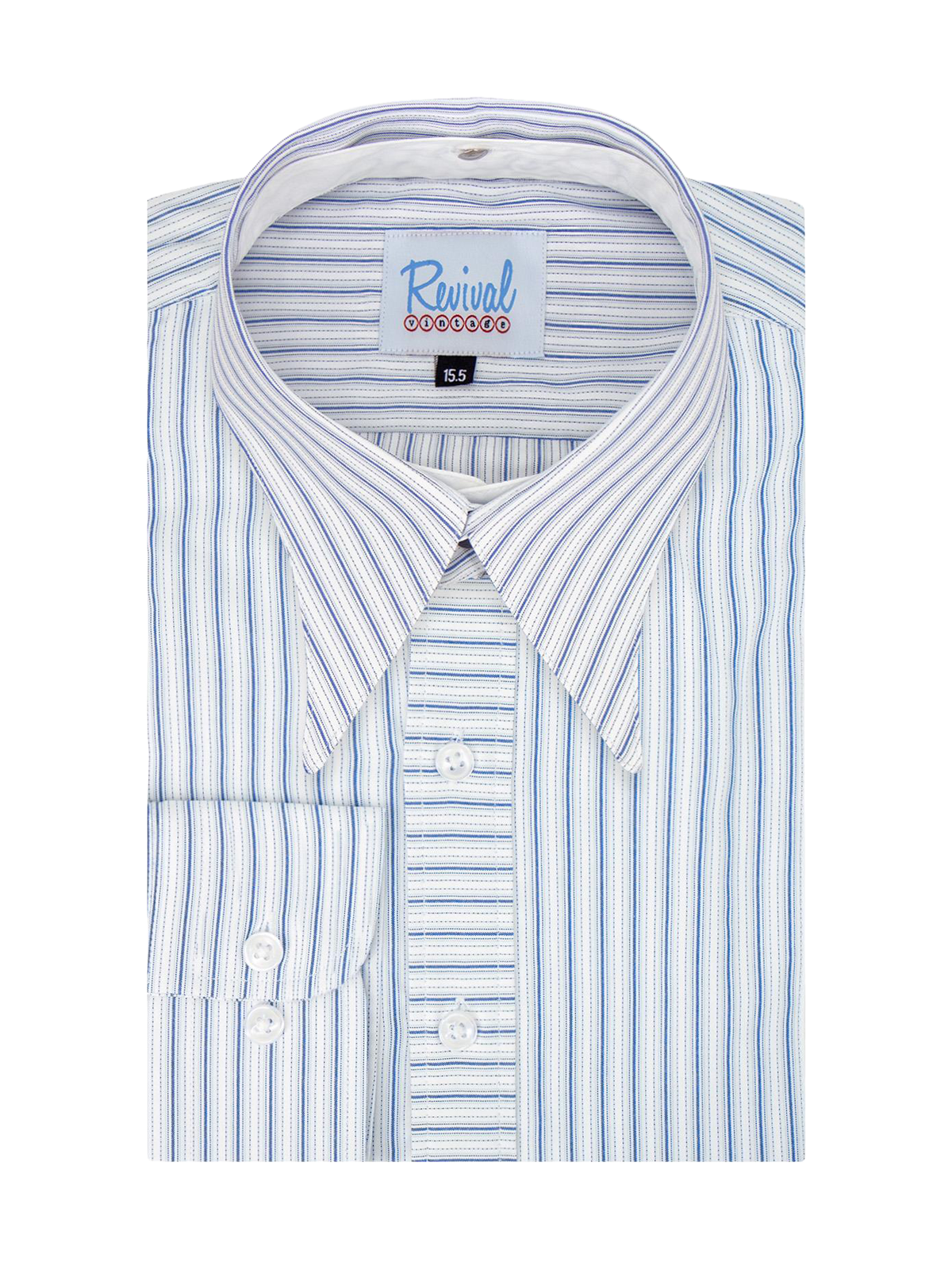 Our navy blue striped Orton collarless shirt is available here with a matching detachable spearpoint collar. The shirt has two buttonholes in the neck to attach the included matching collar, swap it out for another style (available separately), or to wear without for a more casual 1930s - 1940s look.
