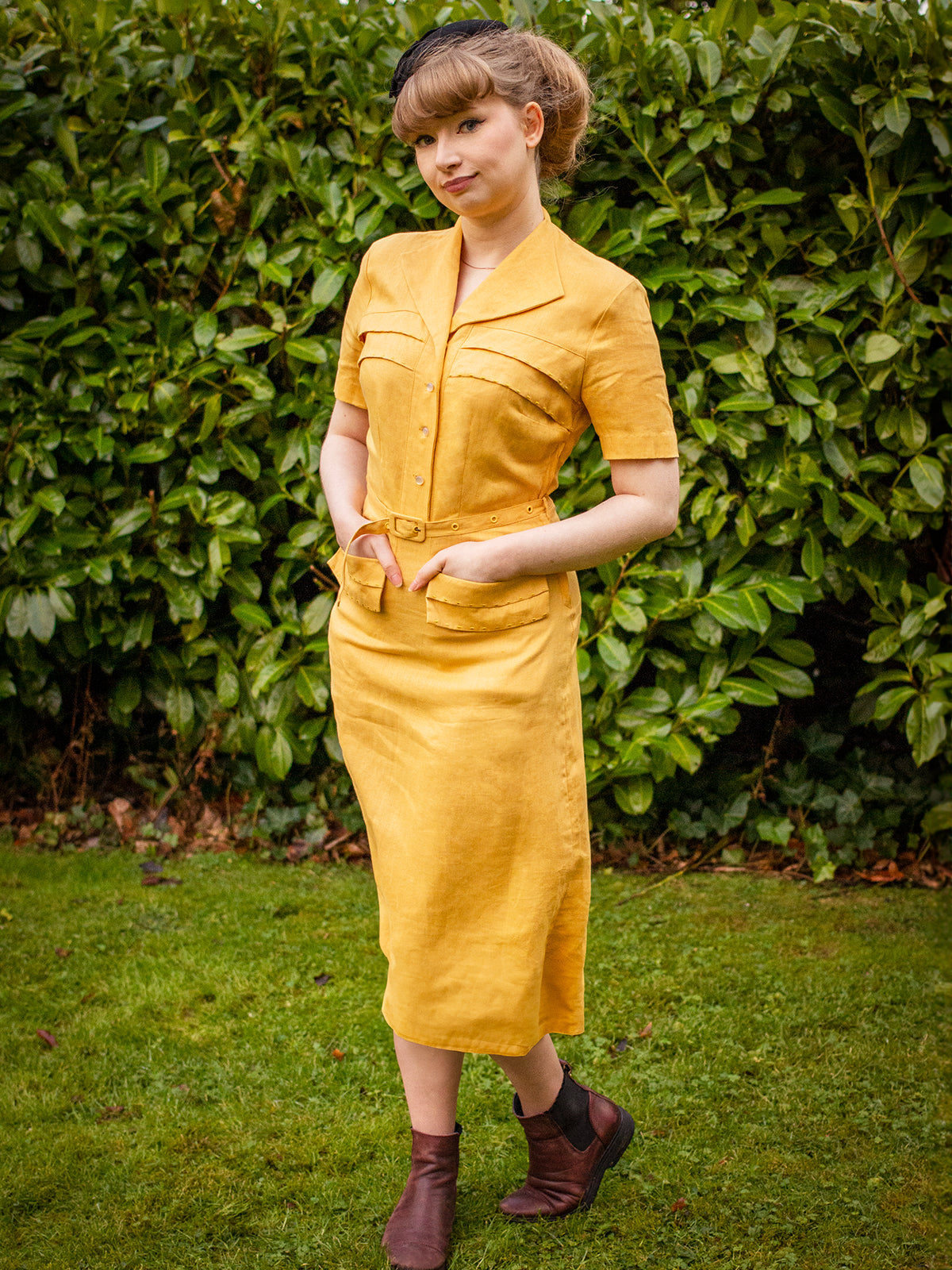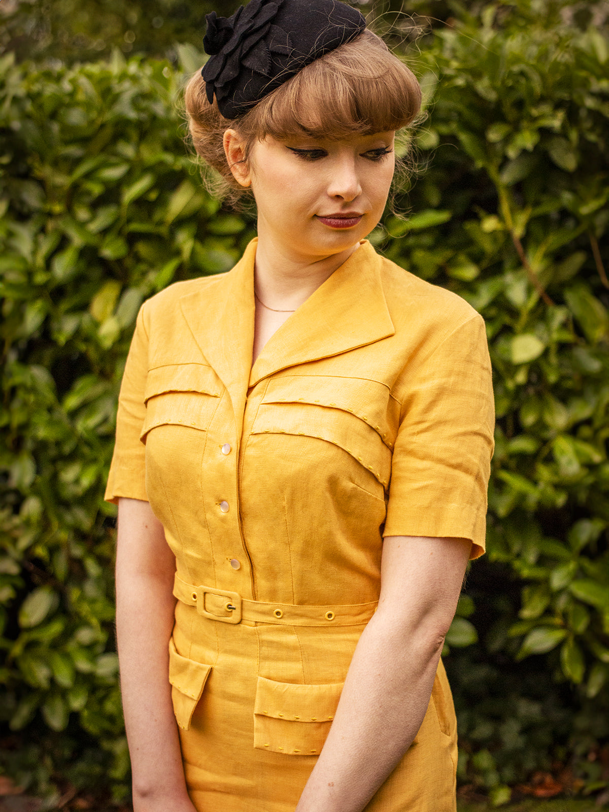 The Spirit Dress is a beautifully tailored 1940s-inspired piece crafted from pure linen, offering a light and breathable feel perfect for spring and summer wear. In a warm mustard honey yellow, it reflects the understated elegance of wartime fashion while remaining effortlessly wearable today. This design is a faithful reproduction of an original Marldena dress from the 1940s, recreated with exceptional attention to authentic detail.