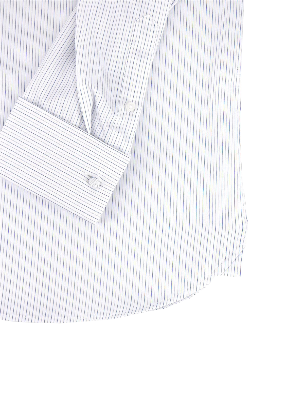 The Lockwood shirt has a blue hairline stripe and a spearpoint collar with a button tab so that the collar is pulled together for a smart and authentic look.