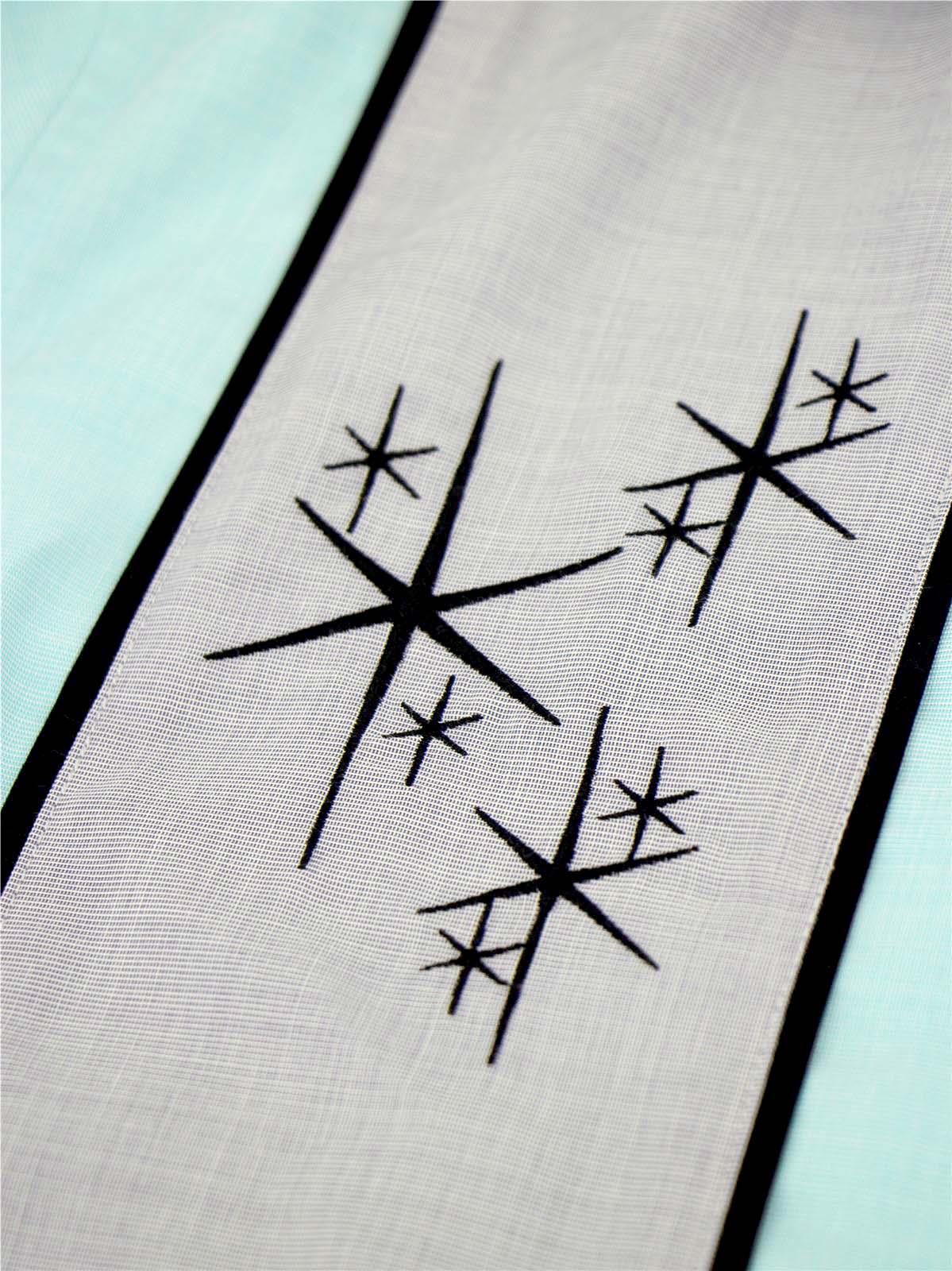 This colourway features a refreshing mint green base, contrasted by a grey vertical panel on the right side, finished with black starburst embroidery and black trim for a true atomic-era aesthetic.