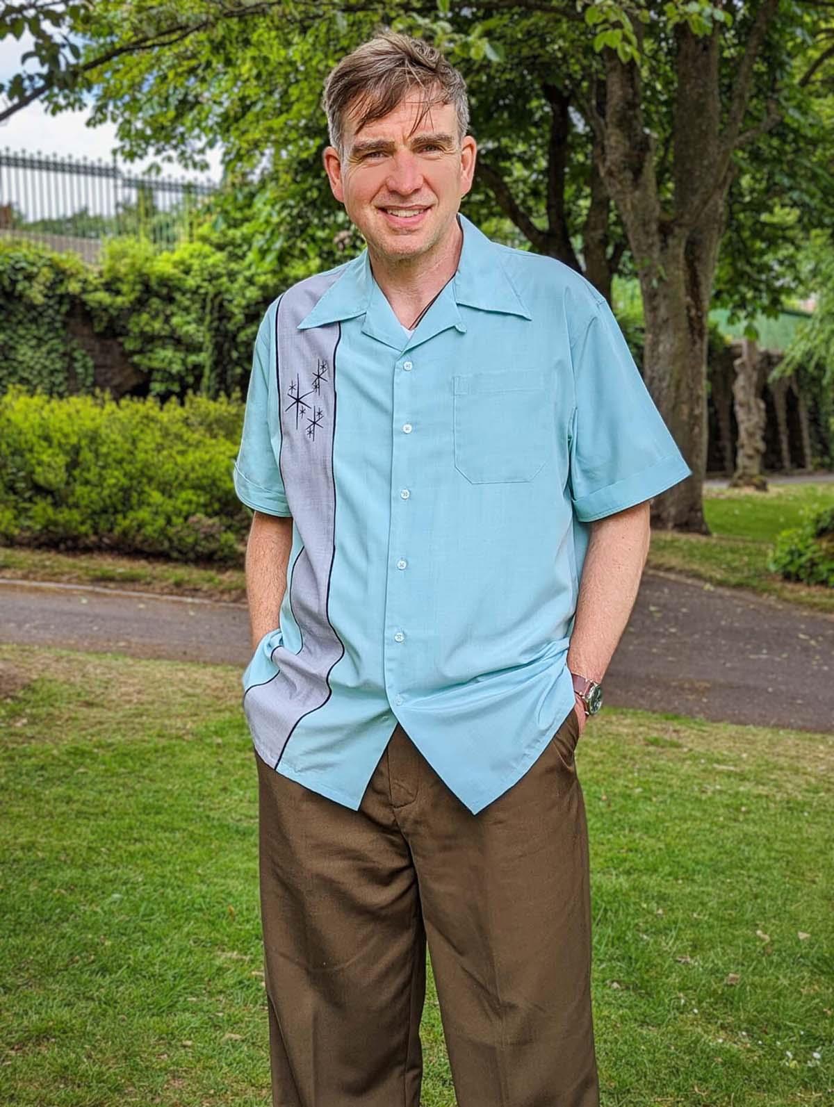 Inspired by retrofuturism and Atomic Age style, the Daytona Bowling Shirt brings a bold 1950s vibe with a relaxed and playful edge. Whether you're cruising in a classic car, hitting the lanes, or styling a laid-back Rockabilly look, this shirt is a standout choice.