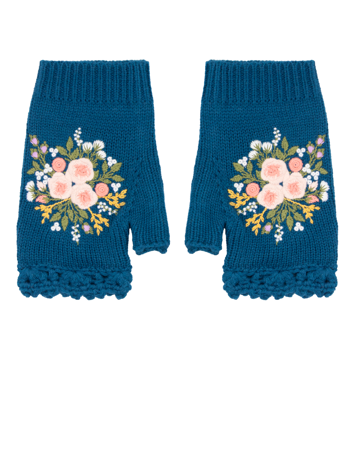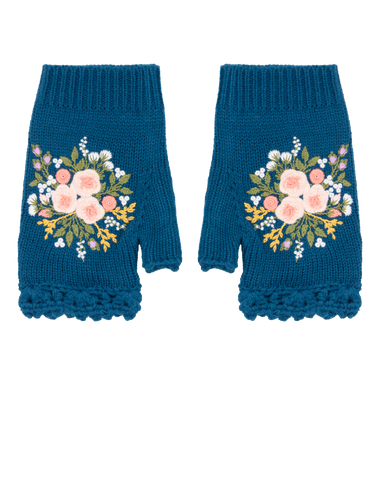 Stay cosy and stylish with these vintage-inspired blue fingerless gloves, featuring delicate 3D rose embroidery in soft shades of pink, cream, and green. Perfect for keeping your hands warm while leaving your fingers free for everyday tasks.