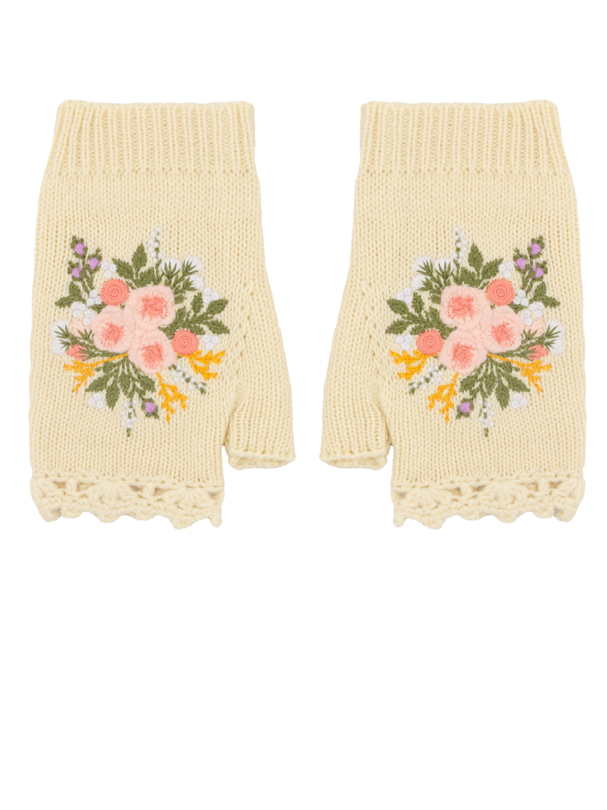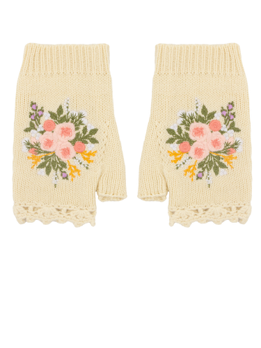 Keep cosy in classic vintage style with these beige fingerless gloves, designed to keep your hands warm while leaving your fingers free for phone use or everyday tasks. The soft knitted base is adorned with beautiful rose embroidery in gentle pink, orange, and green tones, adding a touch of timeless charm to your cold-weather accessories.