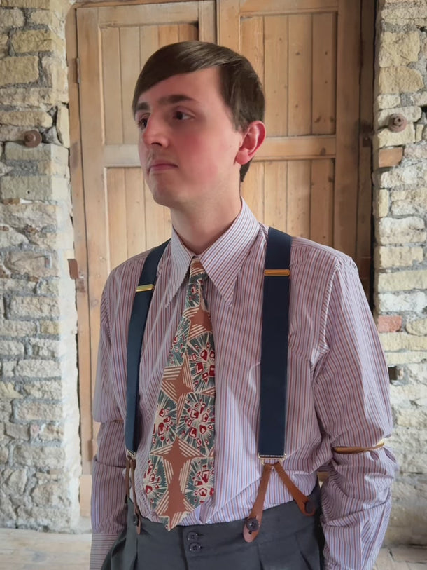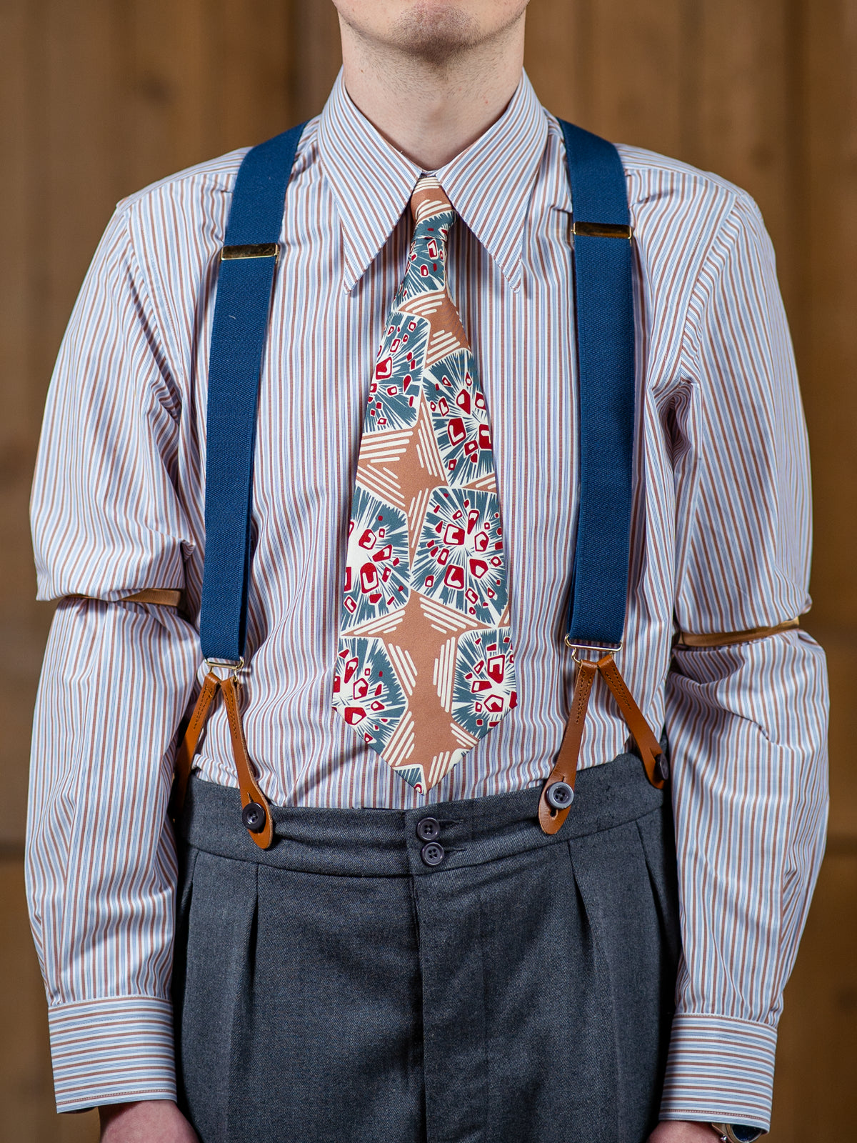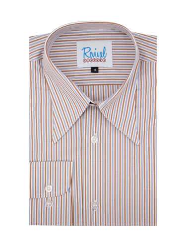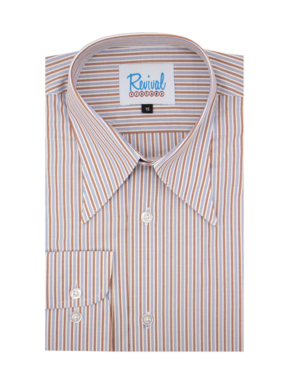 This is our Calder stripe in a blue and white stripe with an alternate brown stripe. Forties vintage style cotton rich shirt with a spearpoint collar.