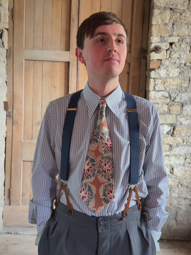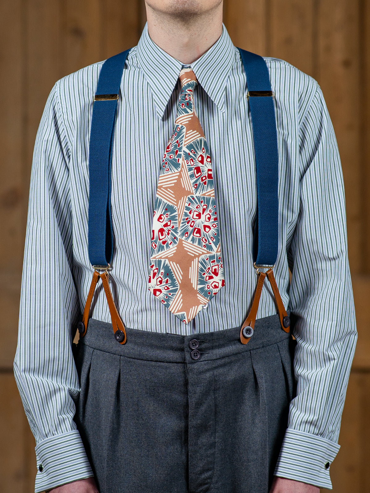 The shirts have shoulder and back yokes. Hem godets at the side seams. It features formal French cuffs and comes complete with a pair of black cufflinks. An easy-care, high-quality piece. A quality vintage look shirt in a versatile style, to complete many a 40s style outfit with an authentic touch.