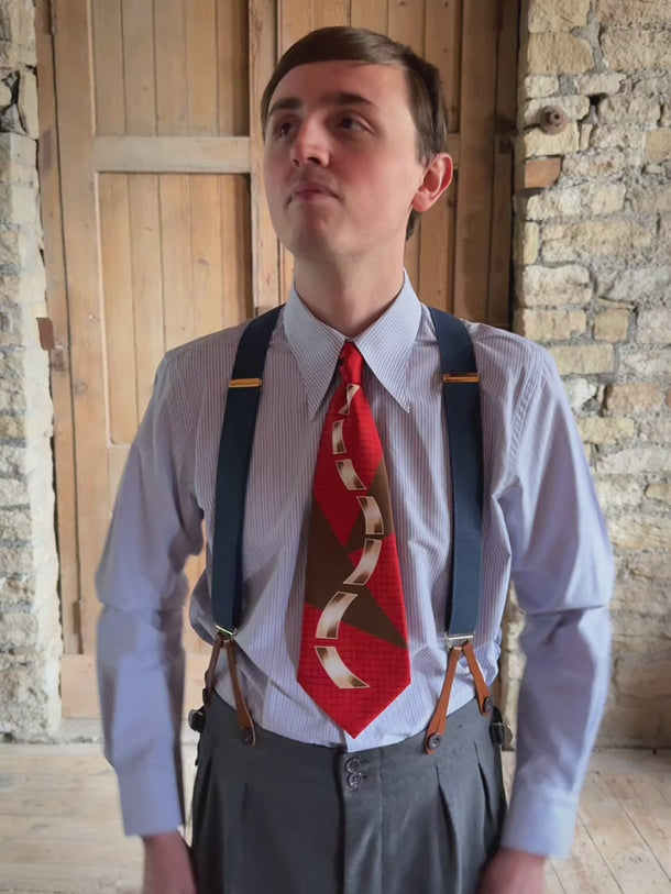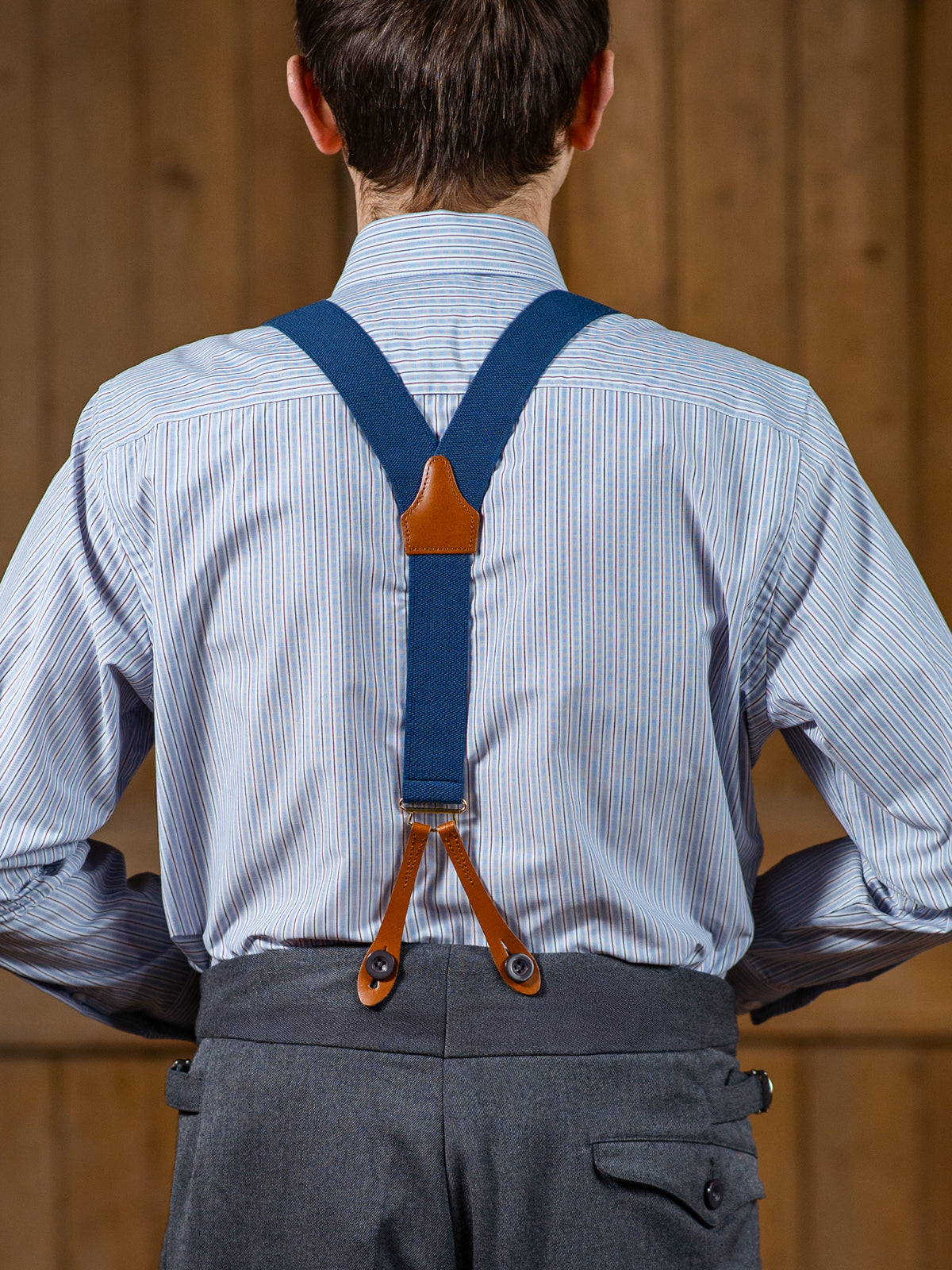 This is our Marsden stripe in blue and white with an alternate green and brown stripe. Forties vintage style cotton rich shirt with a spearpoint collar.