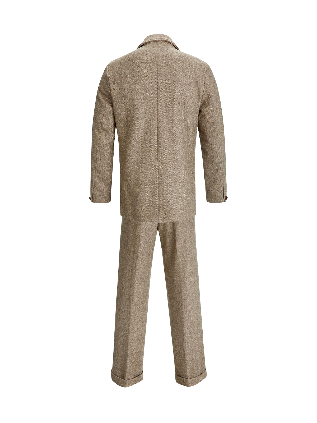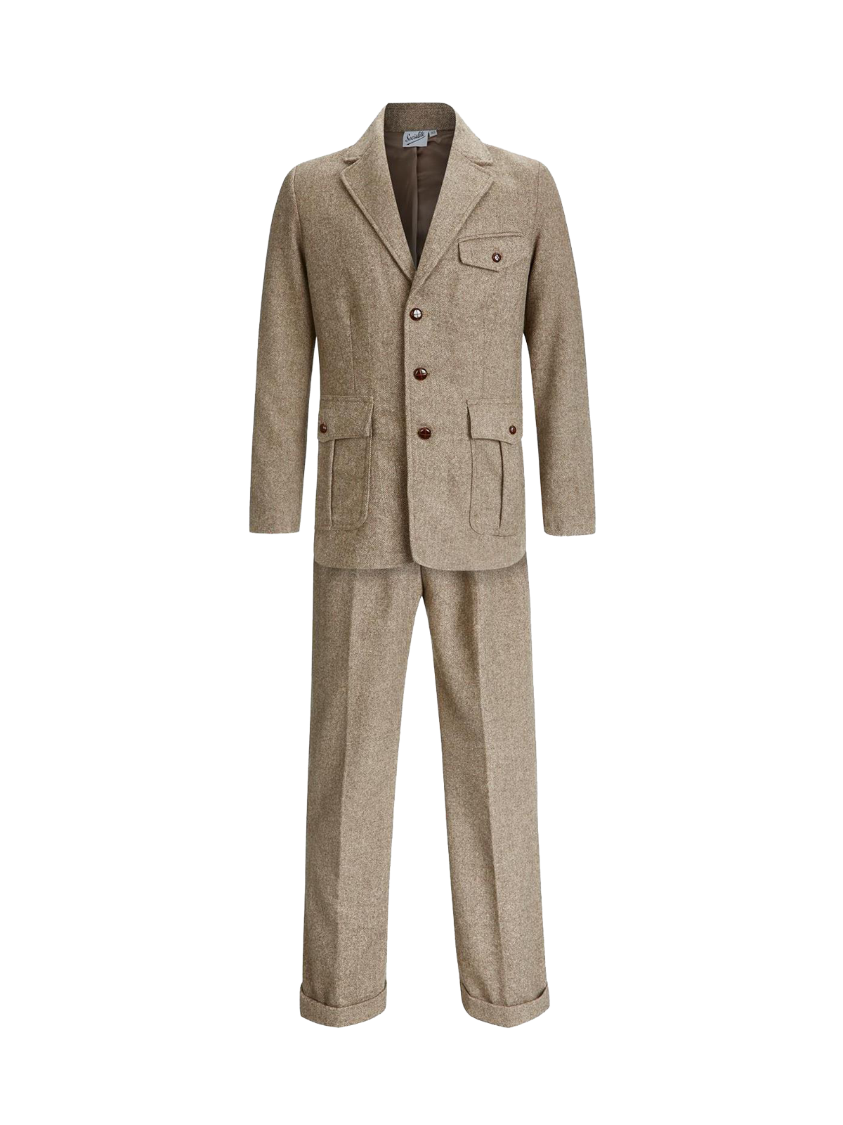 This 1940s style herringbone wool suit is a new premium offering from us at Revival, carefully replicated from an original forties vintage suit jacket and trousers. The jacket and trousers are a light brown herringbone weave which can be worn as a statement piece and yet conservative enough to wear casually.