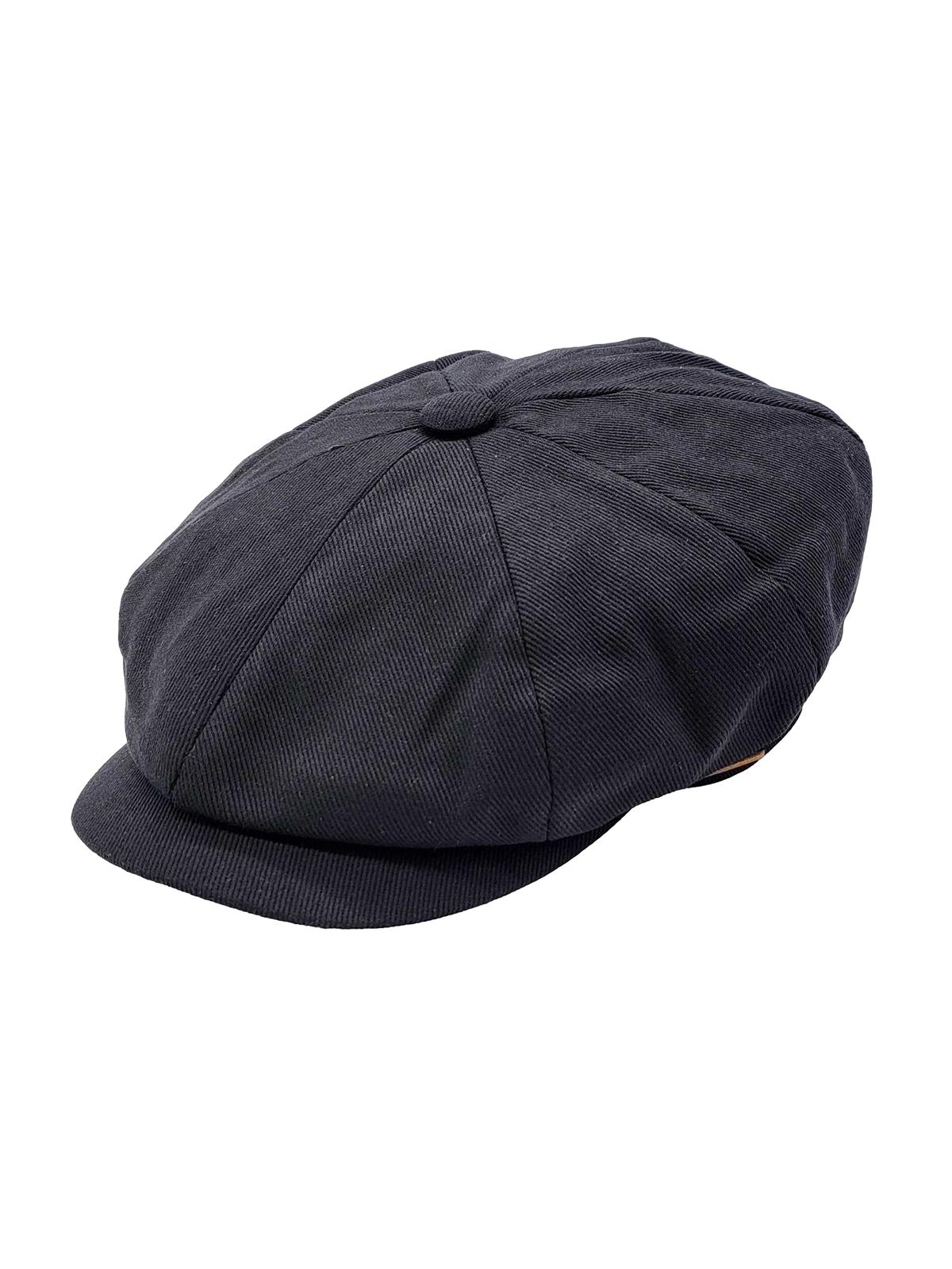 Classic vintage style black cotton newsboy cap, inspired by authentic 1920s to 1940s designs. Made from breathable cotton, this versatile cap is ideal for warmer weather while maintaining an unmistakable vintage silhouette.