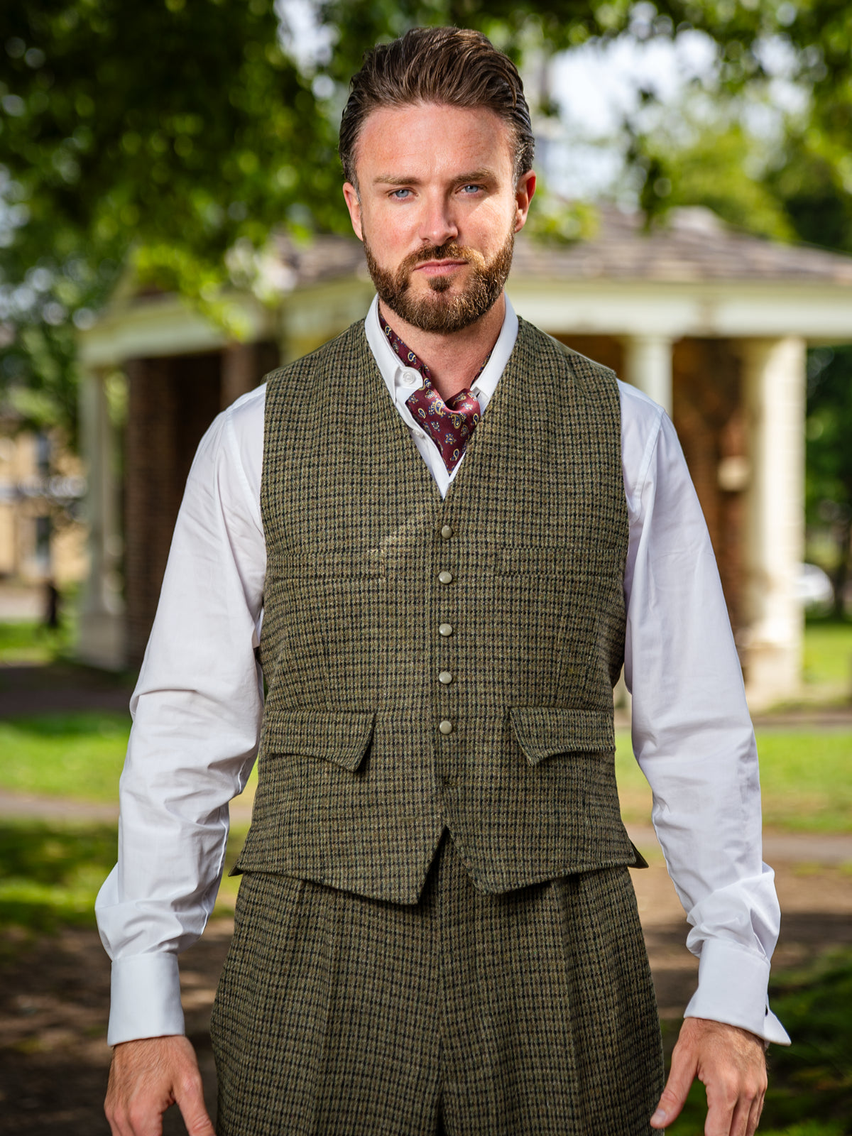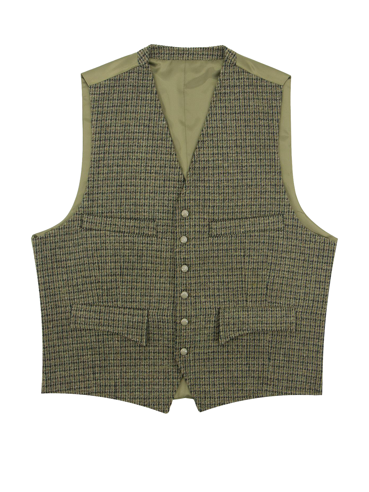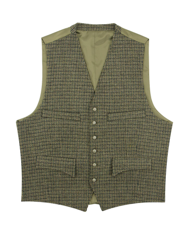 The Clubman waistcoat design is taken from an original vintage 1930s - 1940s era example from our archive collection. This version comes in a multi shade green houndstooth tweed.