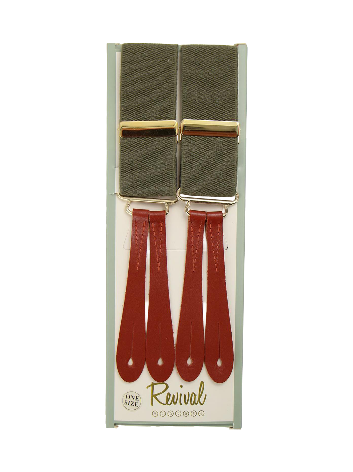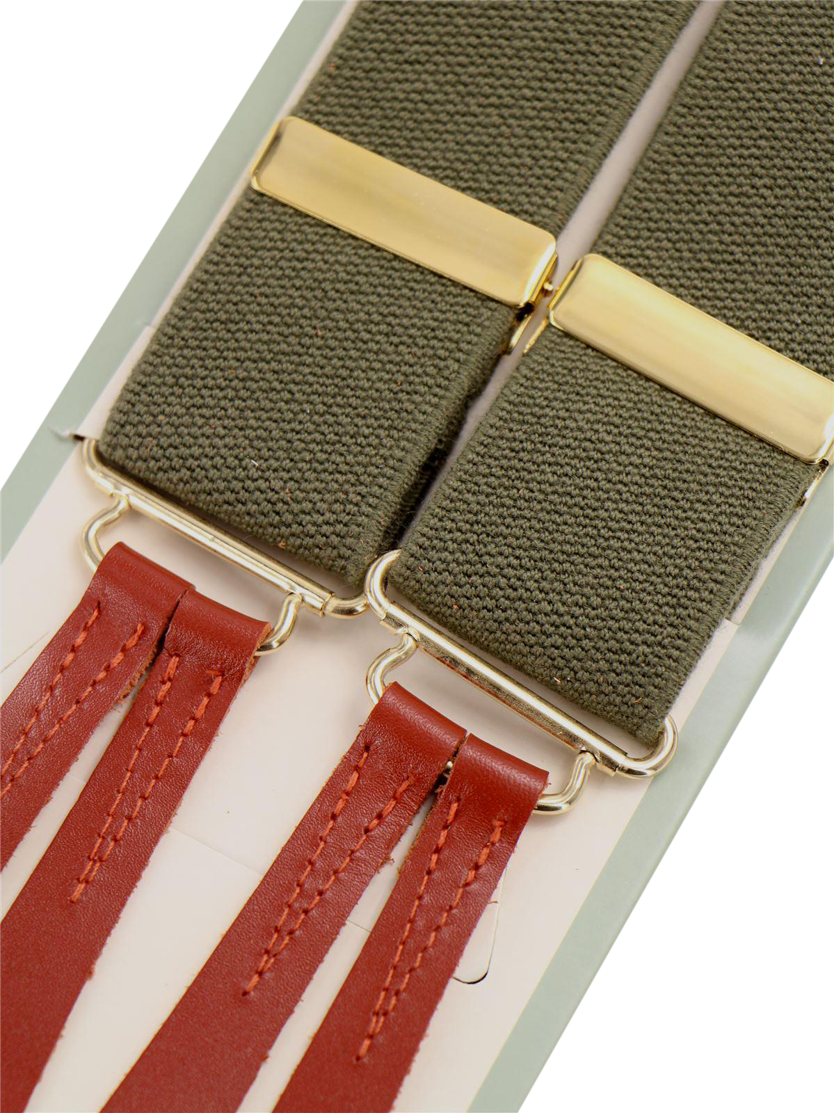 Handmade high quality vintage style trouser braces in khaki green, finished with tan leather loops for attaching to trouser waist buttons. Adjustable with gold gilt closures, these premium quality braces are cut in a classic ‘Y’ back design.