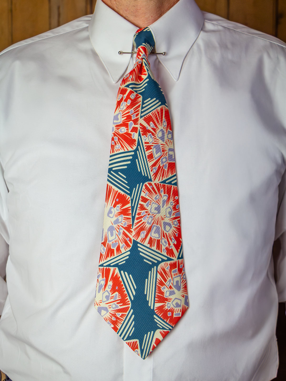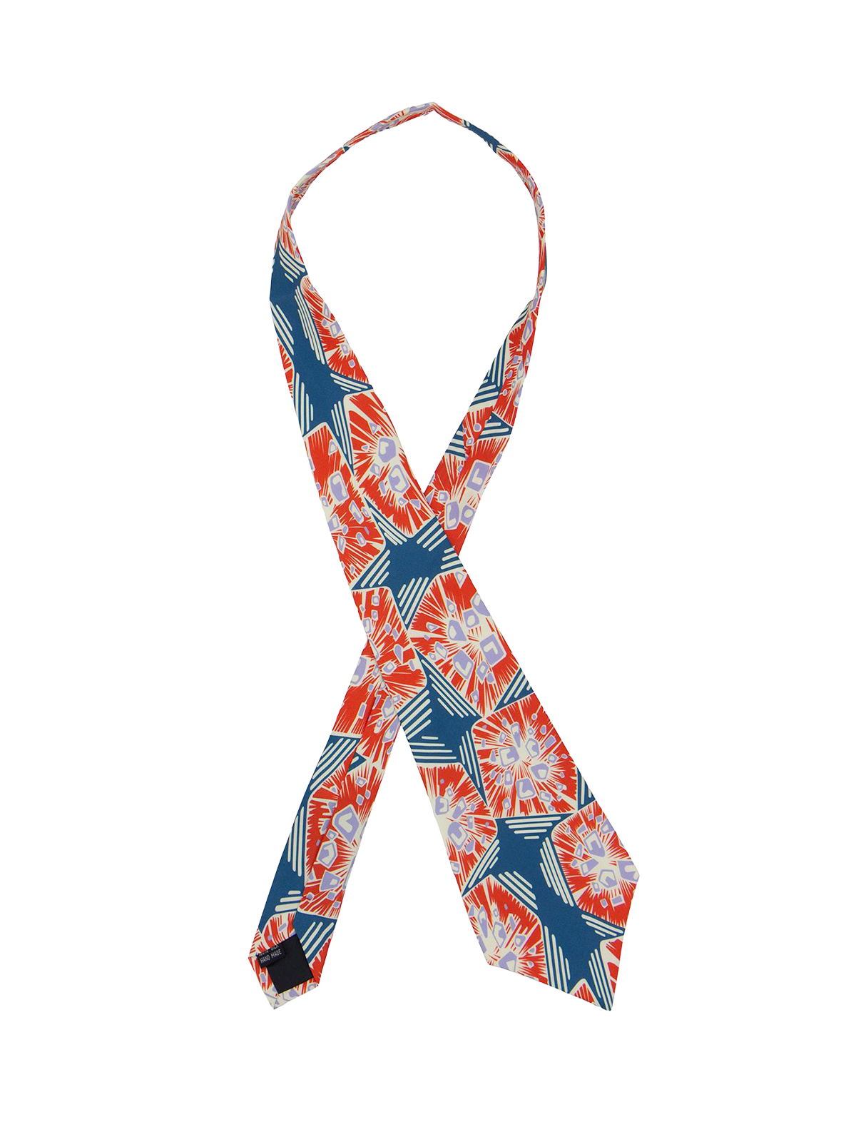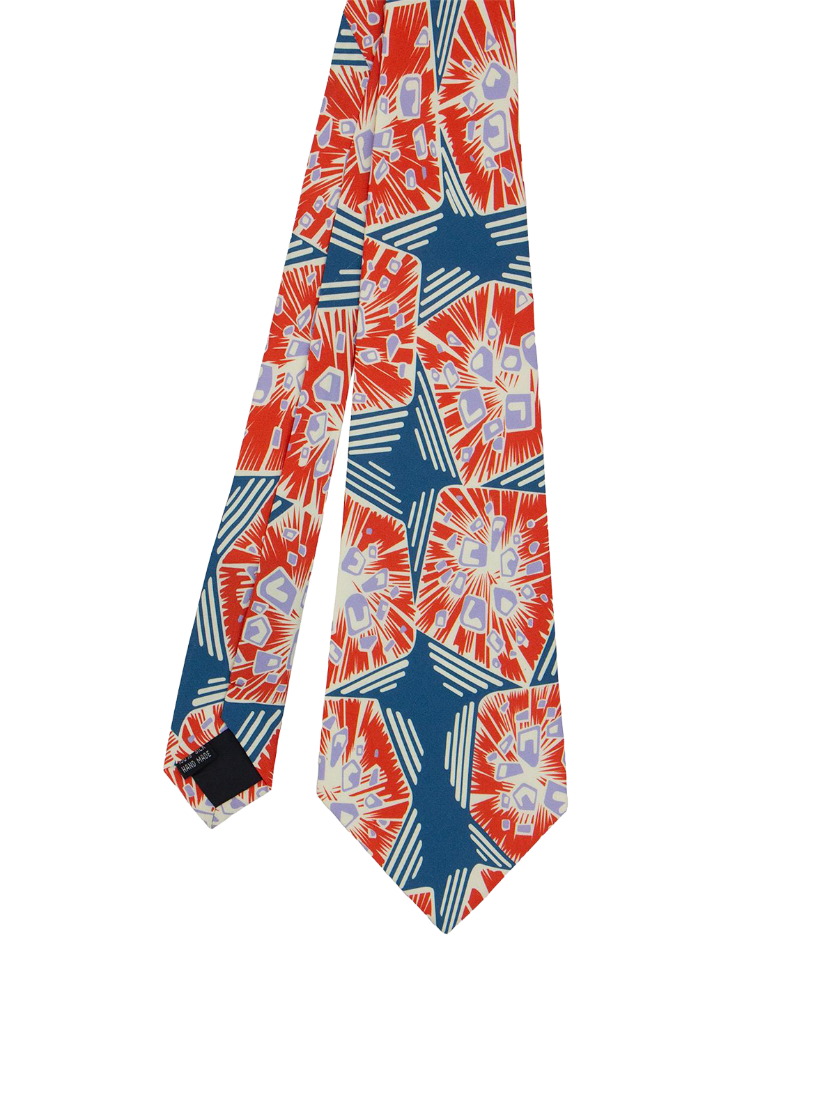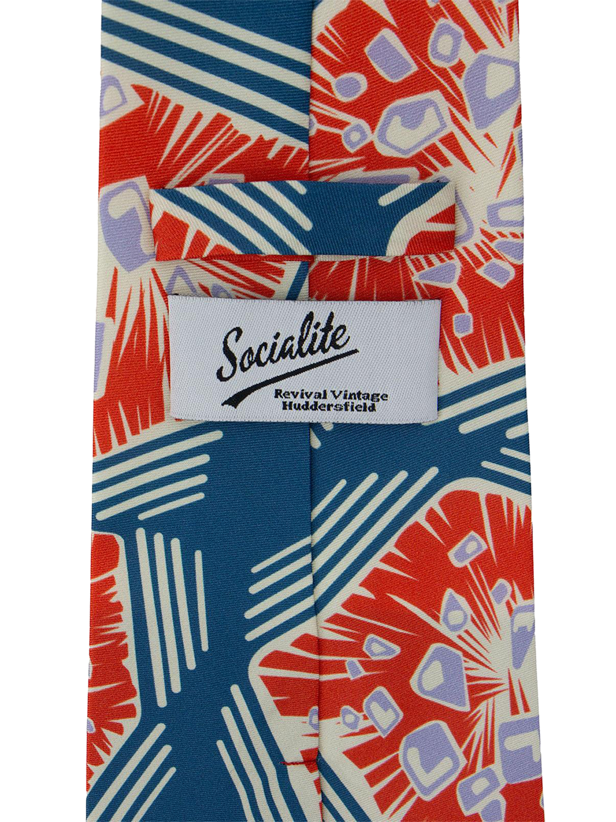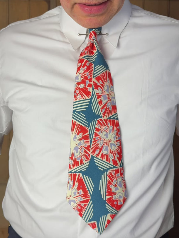 A bold silk swing tie reproduced under our Socialite label from one of our authentic 1940s originals. Featuring a red base with a striking blue and cream exploding fragment pattern, this midcentury design coordinates perfectly with 1940s and 1950s formalwear. Handmade in the UK from high quality silk.