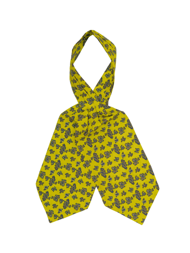 A British made pure silk paisley print cravat featuring a yellow background with black, tan, and orange highlights. This timeless accessory adds a refined touch of vintage style and sophistication to any outfit.