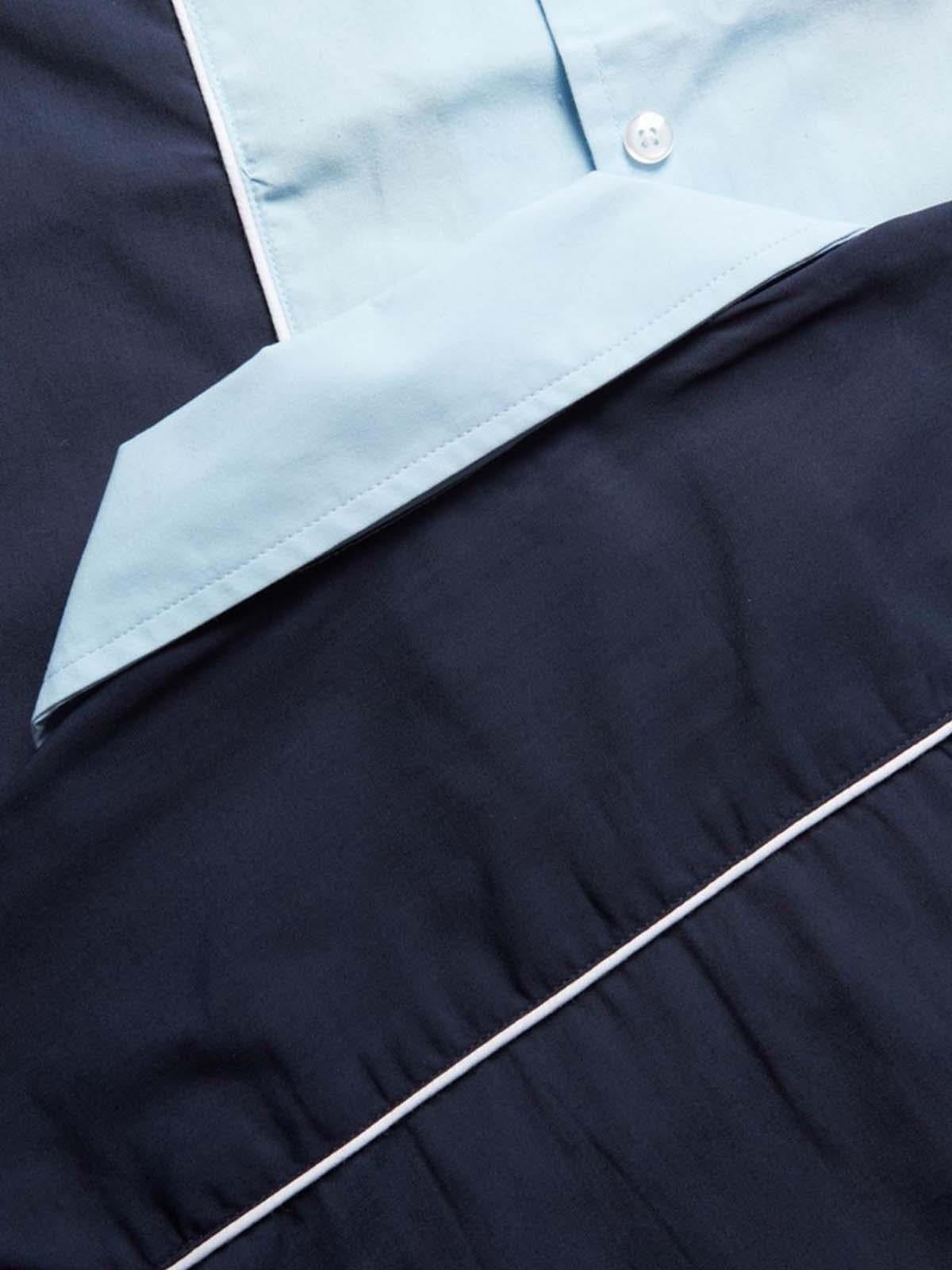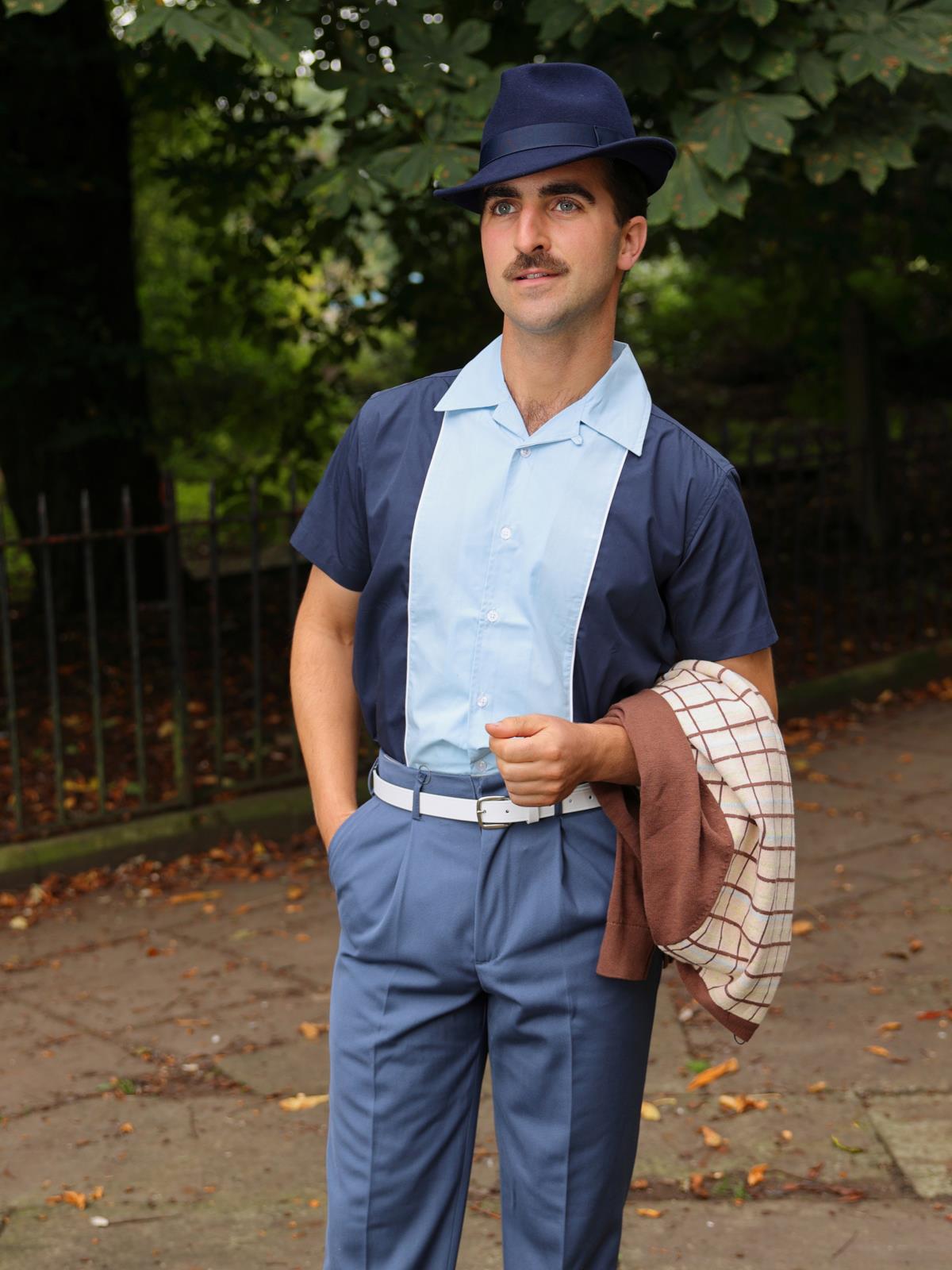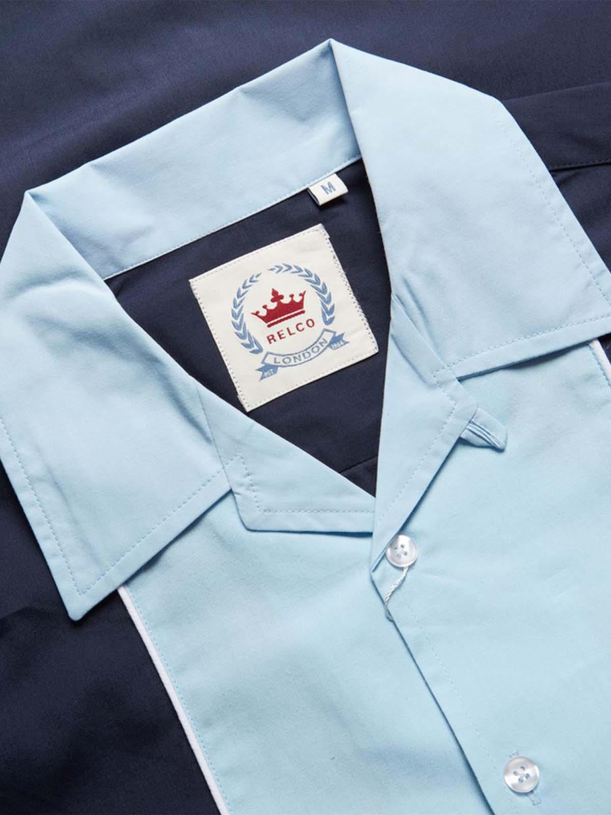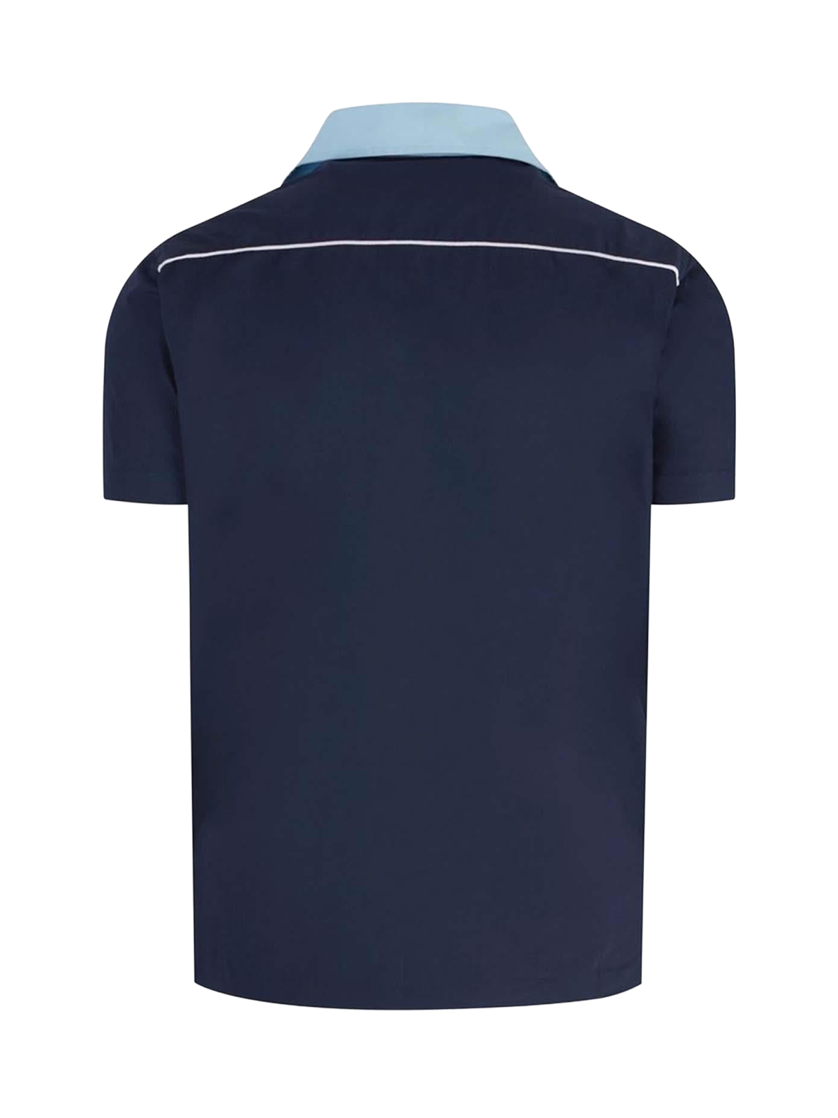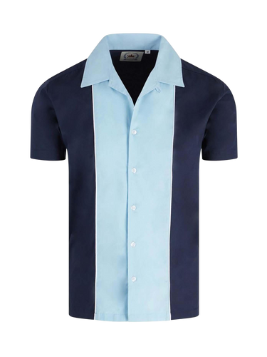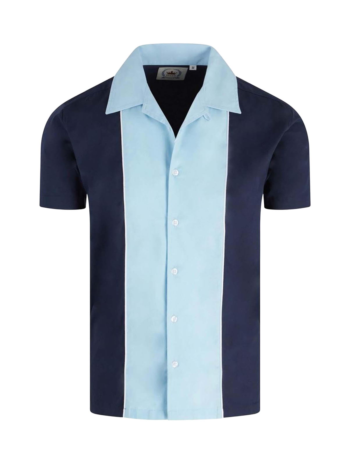 Classic 1950s-style navy bowling shirt with retro characte. Featuring a contrast sky blue centre panel and collar, it brings effortless vintage cool to casual outfits.