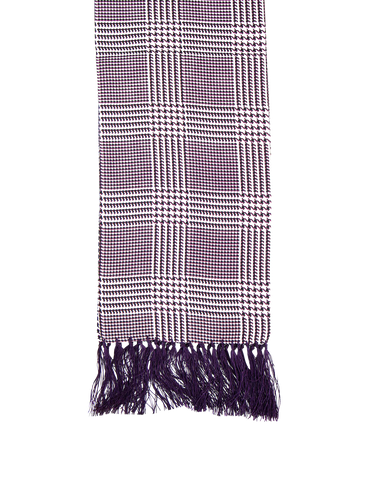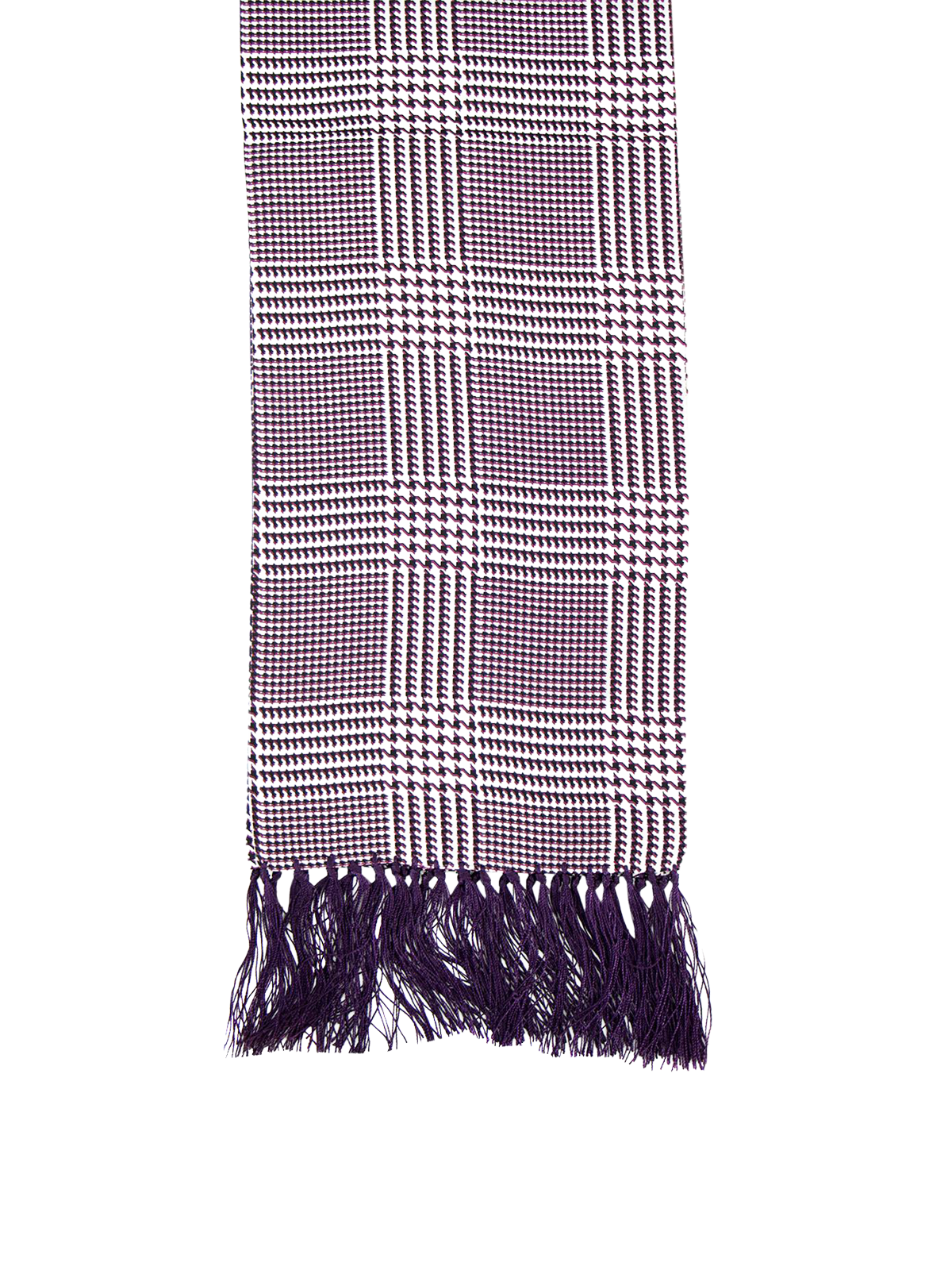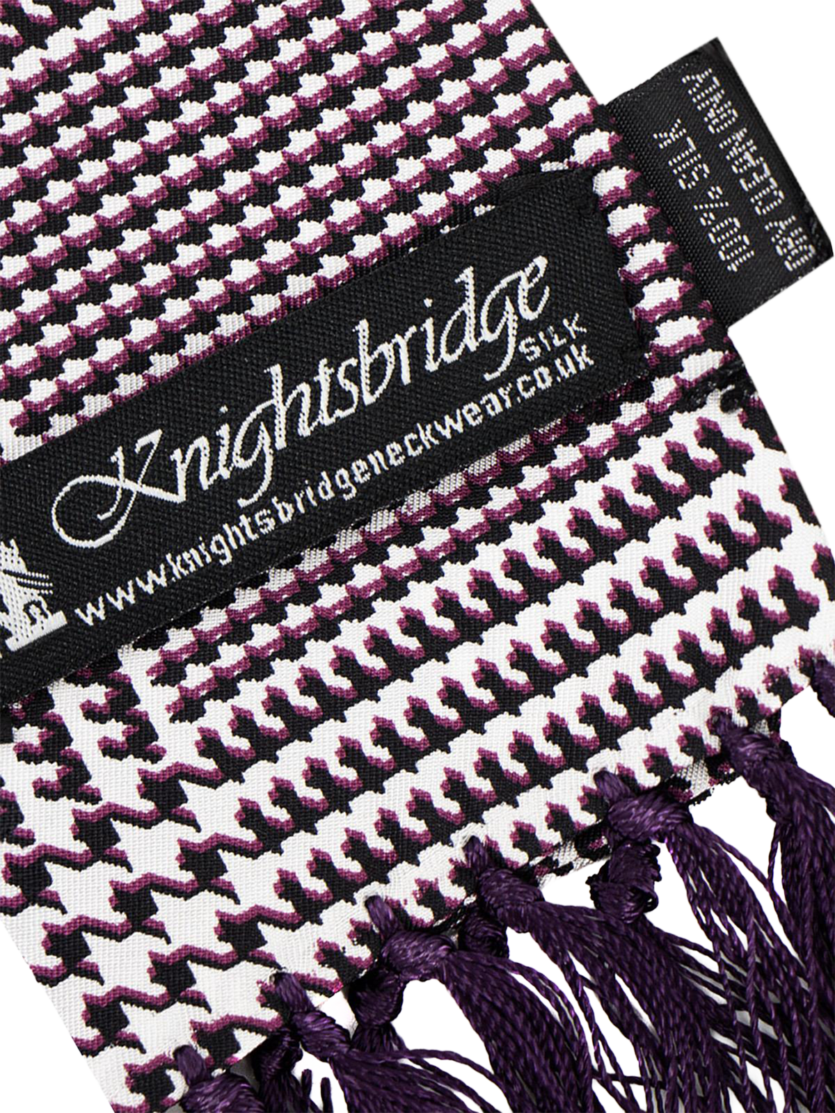 A classic vintage style aviator scarf in an aubergine purple, black, and white houndstooth check. The striking pattern is complemented by elegant silk tassels, making it a standout gentleman’s accessory.