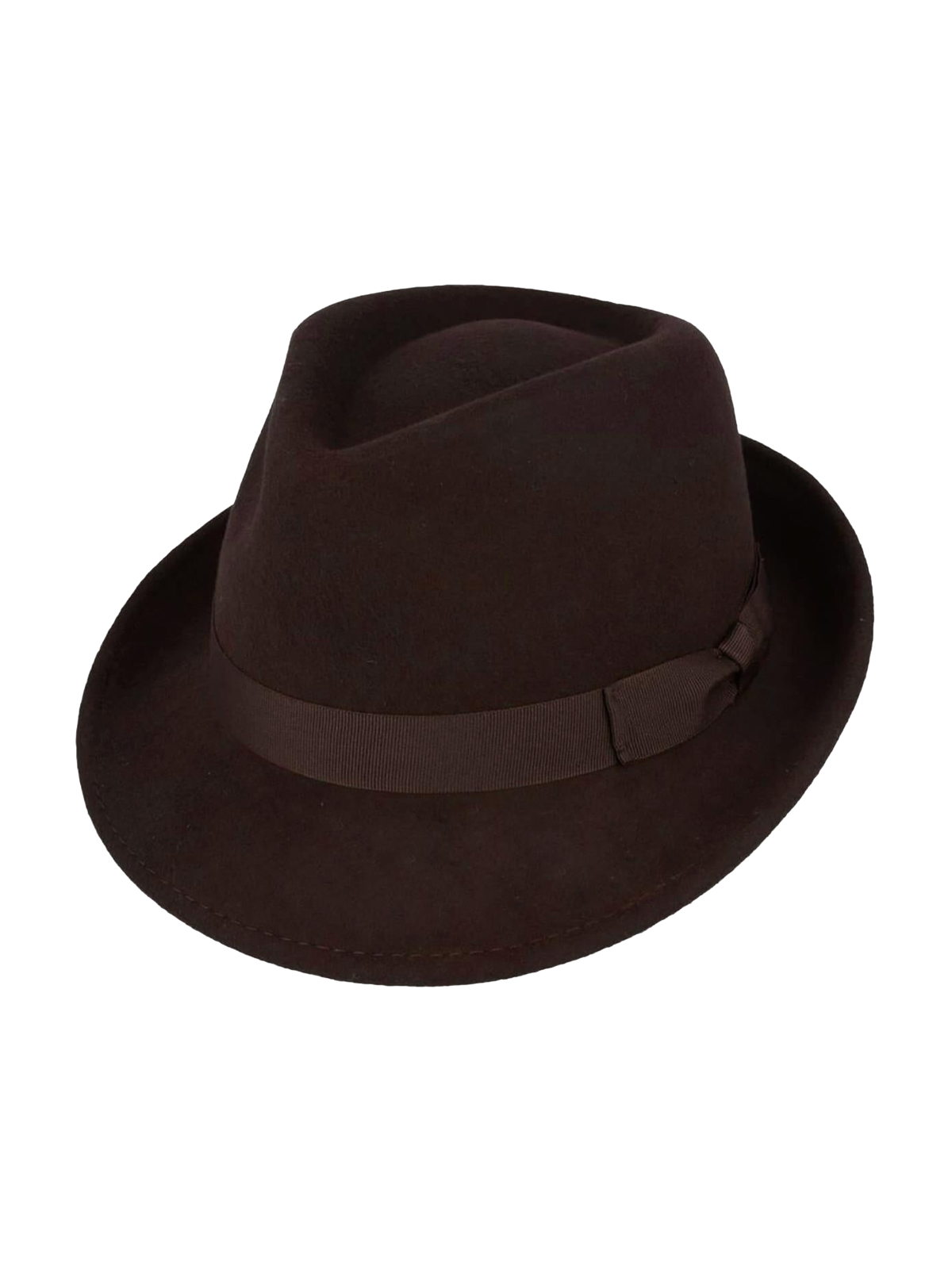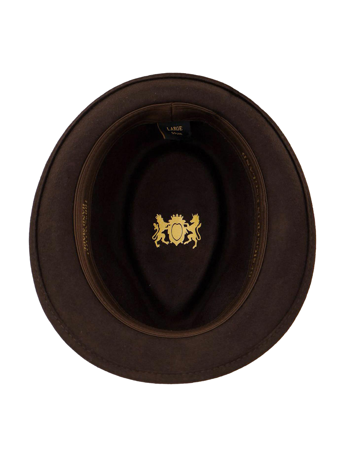 The iconic brown trilby is a perfect finishing touch for an authentic 1950s-inspired outfit. Crafted from solid wool felt, it features a turned-up grosgrain edge, a deep hatband, and a ribbon tail detail to one side. Designed in a crushable style, it travels easily without losing its shape. Handmade from 100% wool with a water resistant finish, this timeless trilby is a versatile classic for any gentleman’s vintage wardrobe.