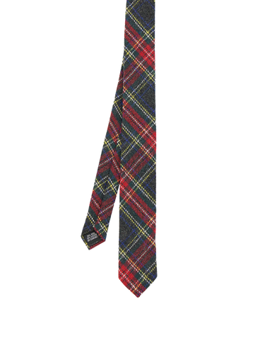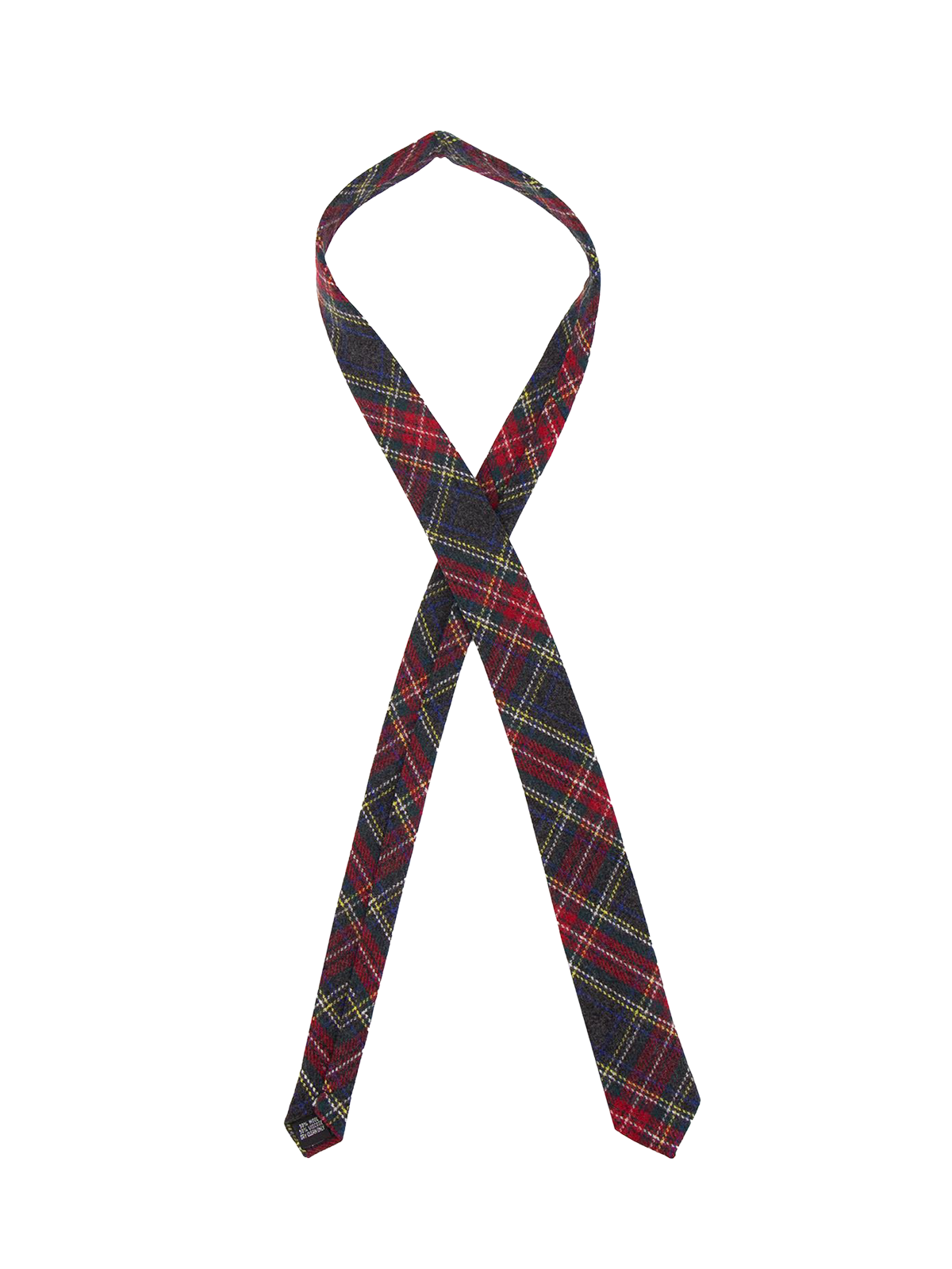 A 1960s inspired wool tartan tie in a bold grey, yellow, red, and white plaid. Striking in design yet versatile, it pairs perfectly with a woollen waistcoat, tweed jacket, or other vintage inspired ensembles.