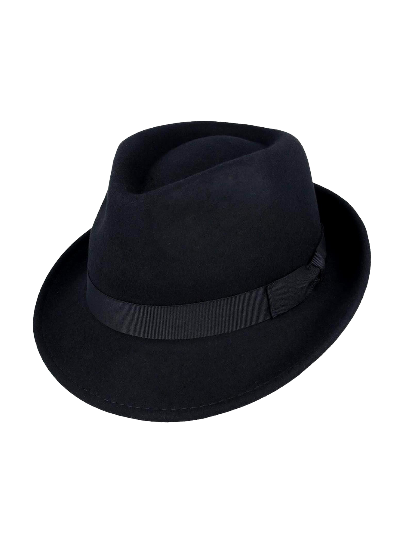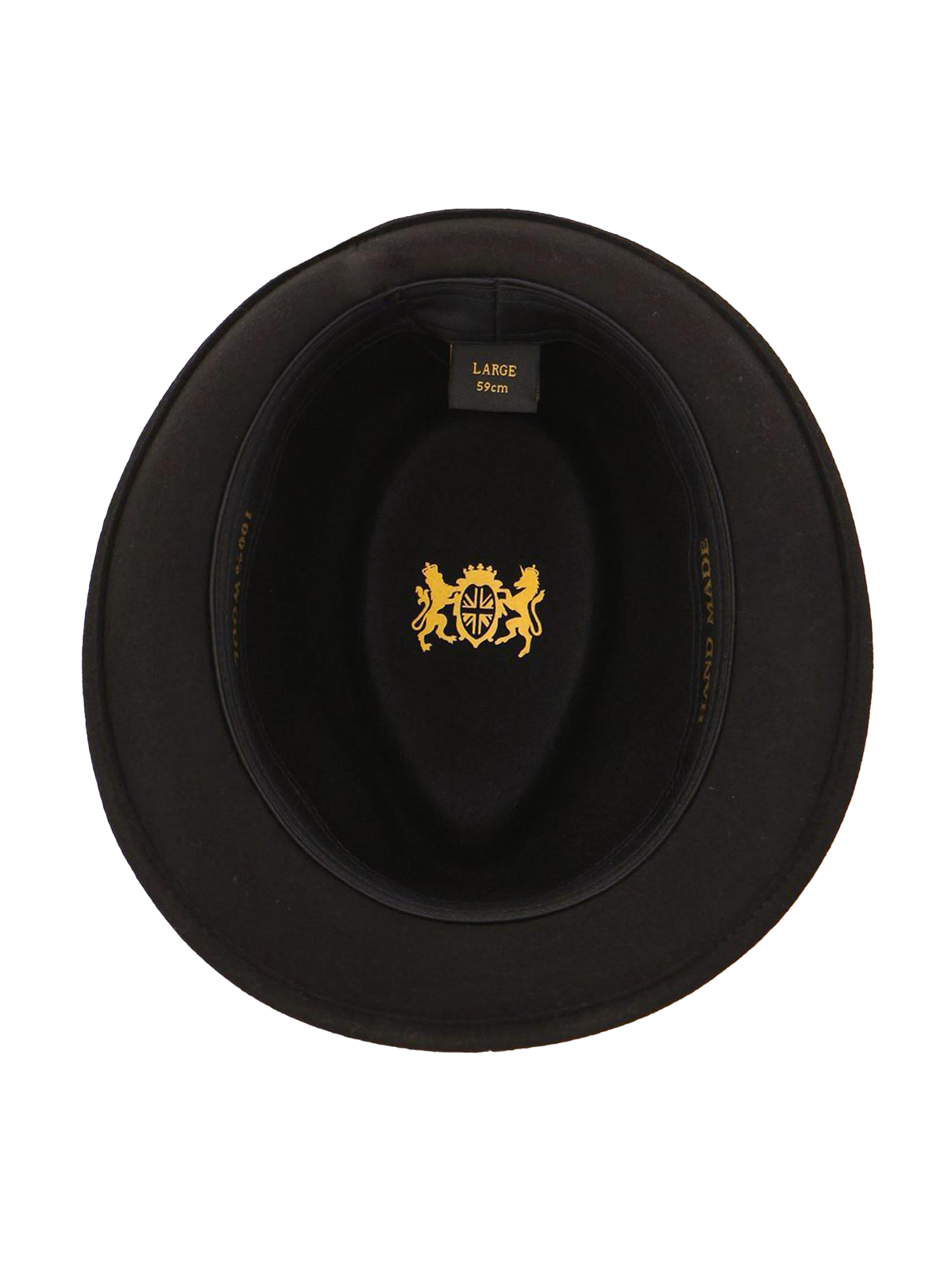 The iconic black trilby is a perfect finishing touch for an authentic 1950s-inspired outfit. Crafted from solid wool felt, it features a turned-up grosgrain edge, a deep hatband, and a ribbon tail detail to one side. Designed in a crushable style, it travels easily without losing its shape. Handmade from 100% wool with a water resistant finish, this timeless trilby is a versatile classic for any gentleman’s vintage wardrobe.