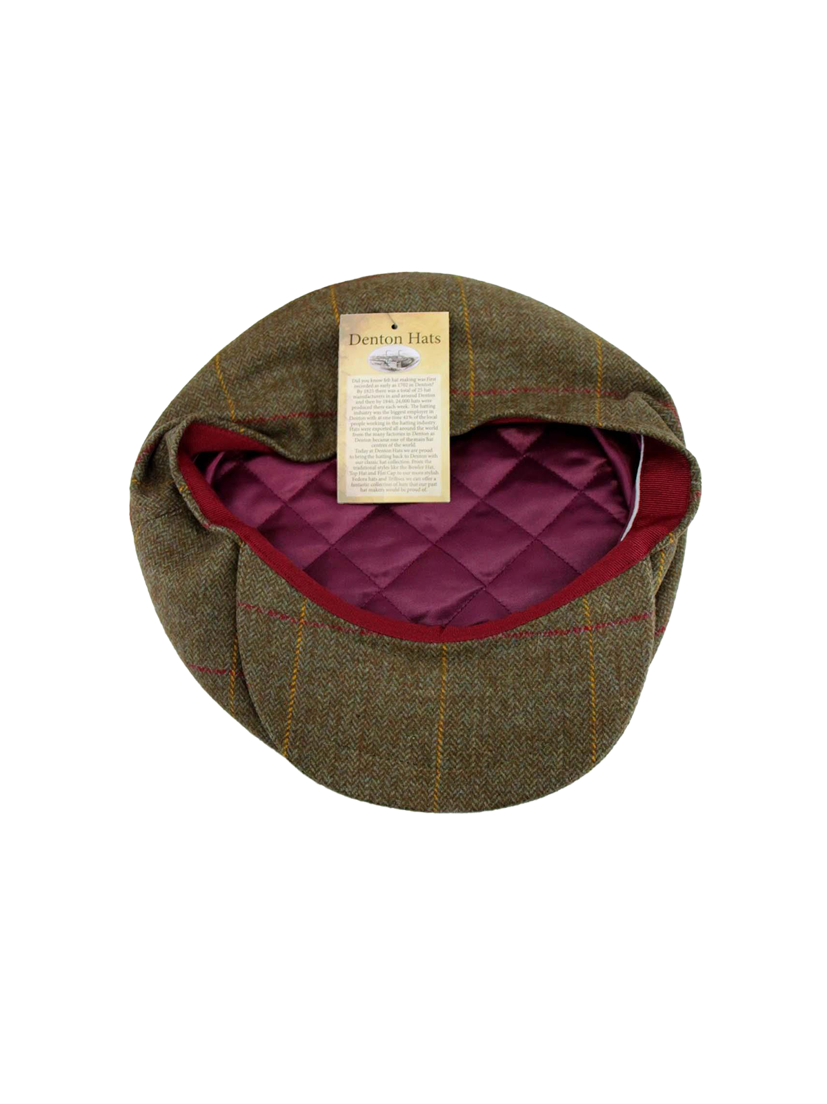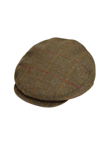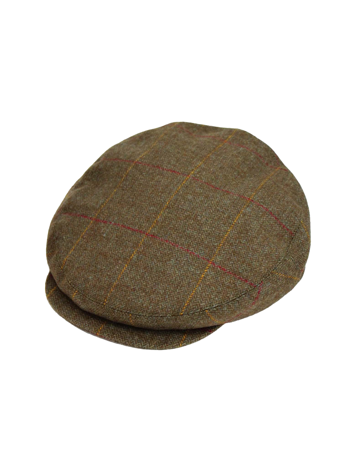 Authentic 1920s-1940s style Bond flat cap, crafted in genuine Harris Tweed. Features an olive green flecked herringbone weave with a red and yellow windowpane check. Very similar to the style famously worn by the then Prince of Wales, later King Edward VIII. A Peaky Blinders classic and a perfect accessory for 1940s WW2 civilian outfits.