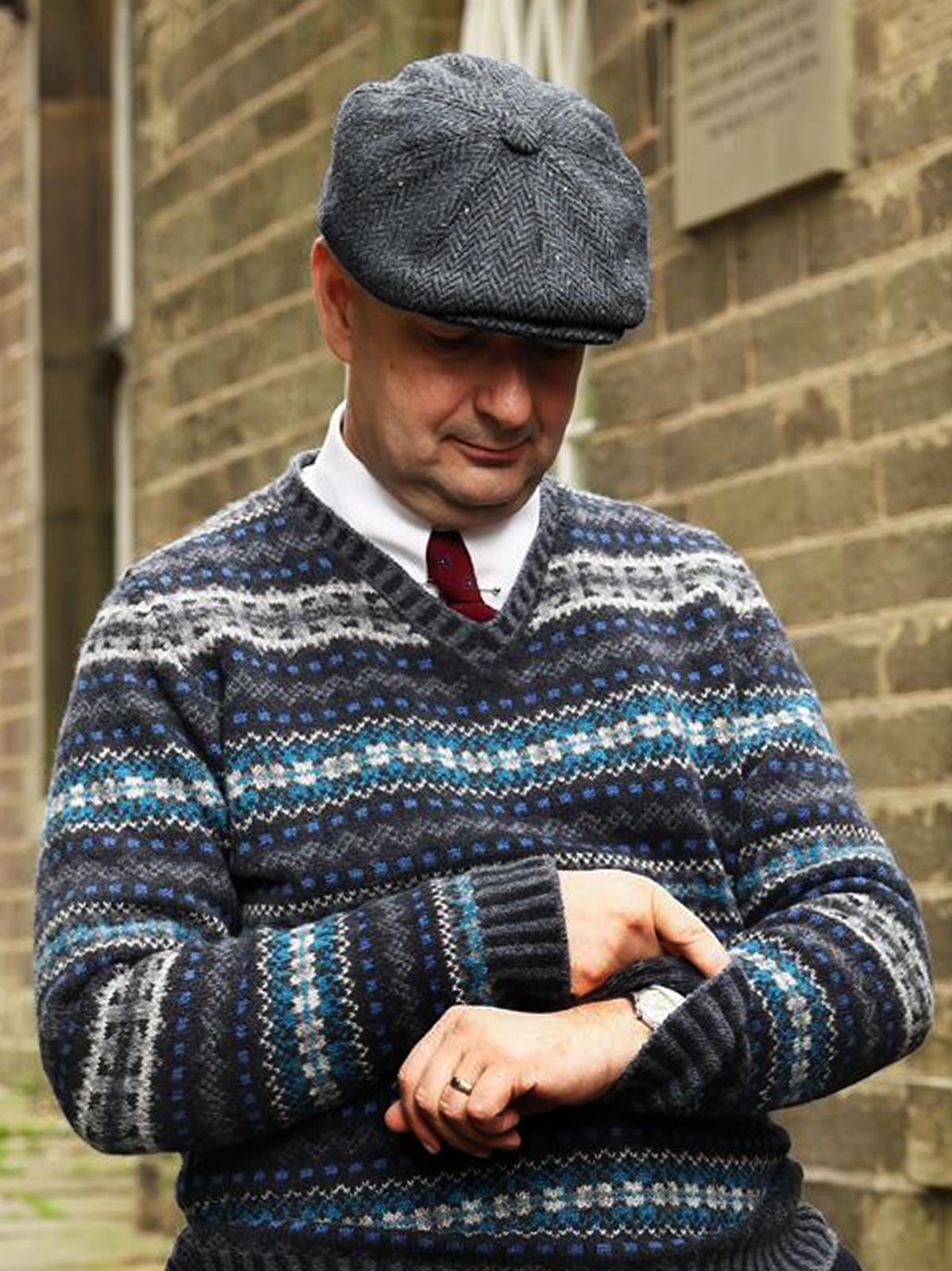 Peaky Blinders style and a versatile accessory to complete an authentic 1940s civilian outfit. This vintage look newsboy cap is crafted in a classic charcoal herringbone tweed for timeless appeal.