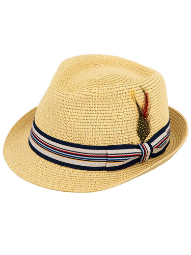 A stylish summer hat with authentic 1940s-1950s flair, crafted from premium paper straw for a lightweight, breathable finish. It features an attractive striped hatband and feather embellishment, with a slightly upturned back brim that captures the elegance of midcentury style.