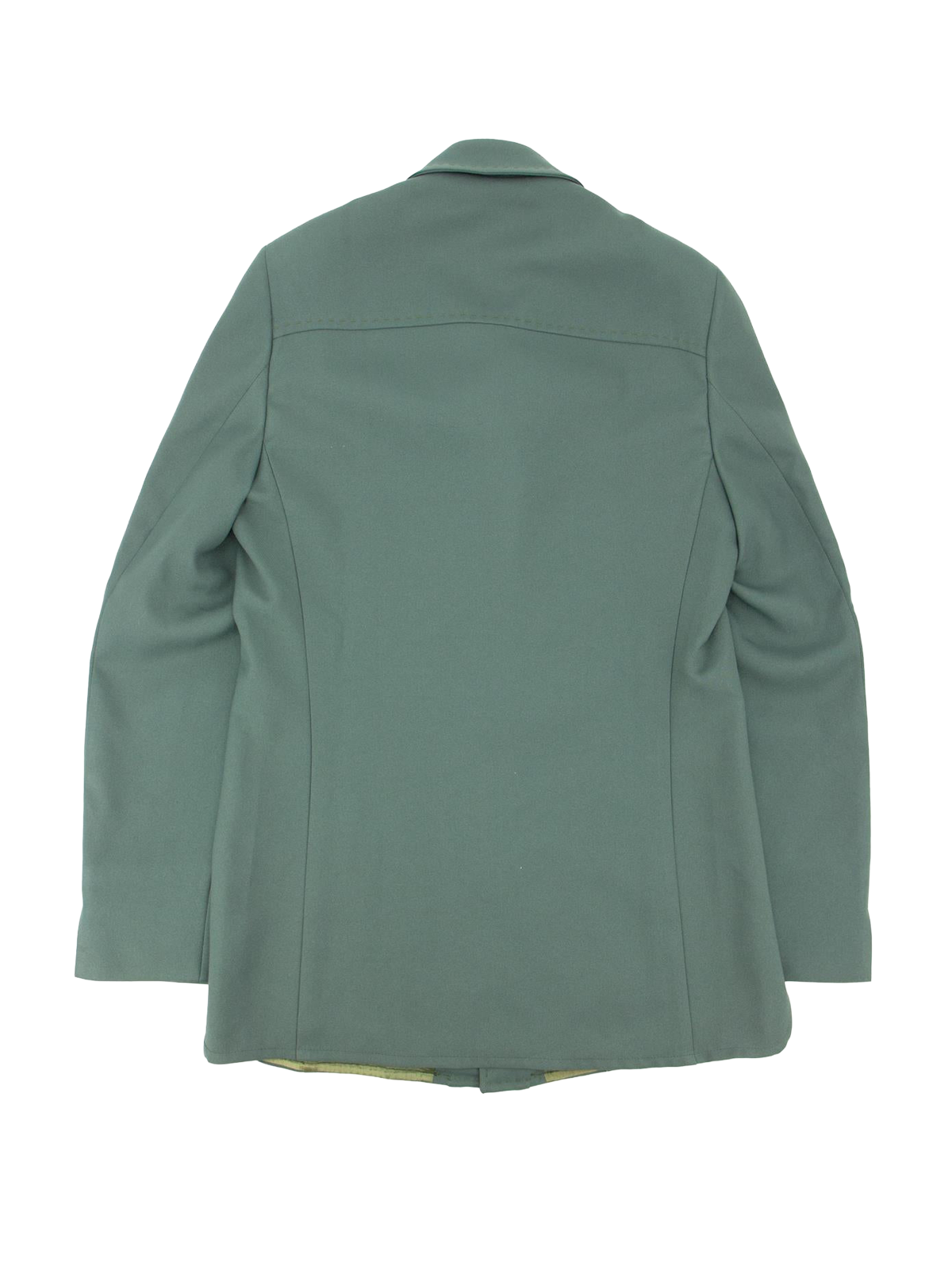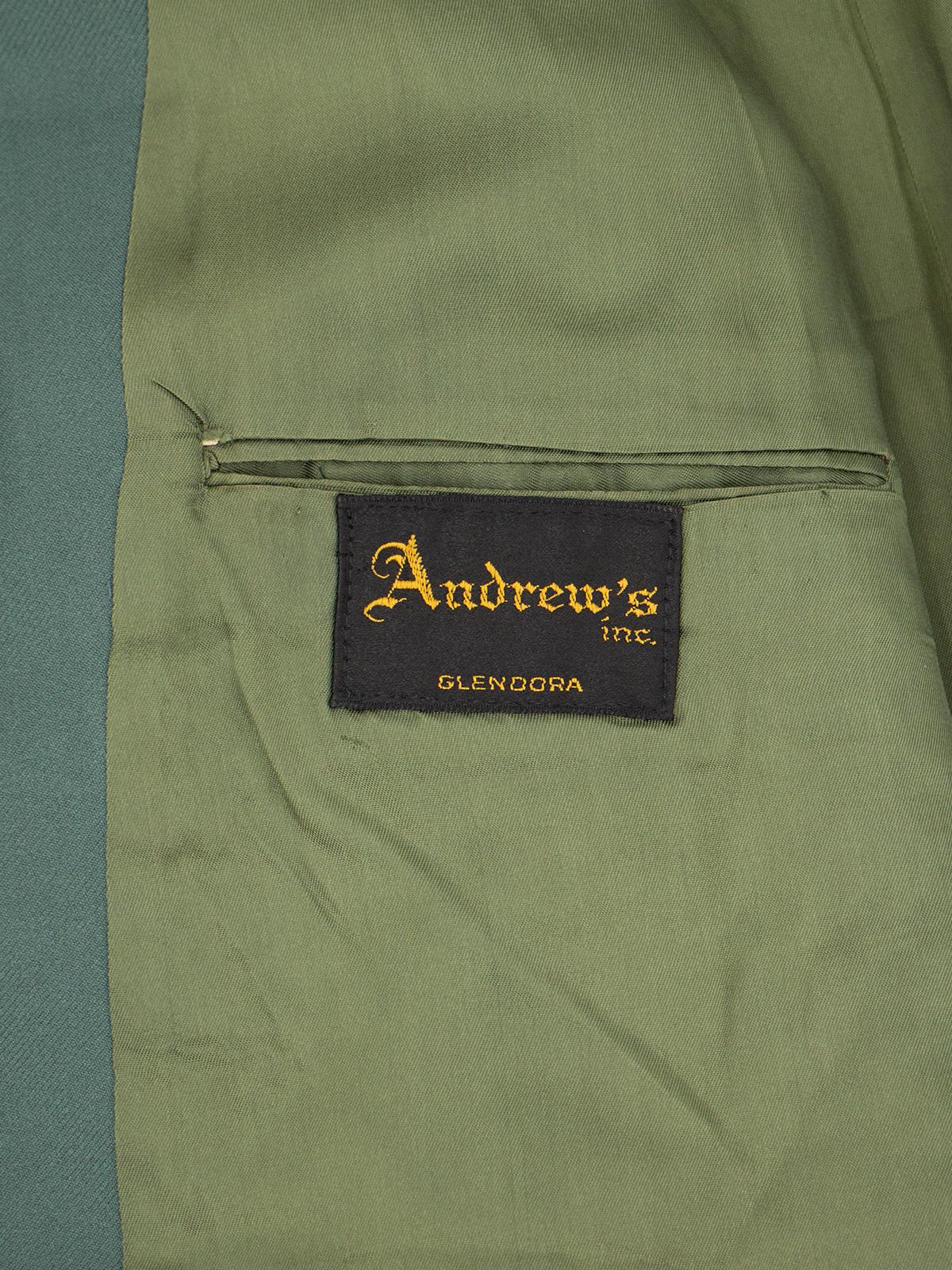 The jacket features two button-down safari breast pockets and two vertical lower pockets, along with deep side slits for ease of movement. The back shoulder yoke and saddle-style topstitching throughout add structure and authentic retro styling. Labelled Andrews Inc Glendora. While the fabric content is unconfirmed, it has the handle of a synthetic blend typical of the era.