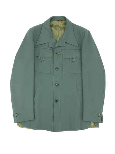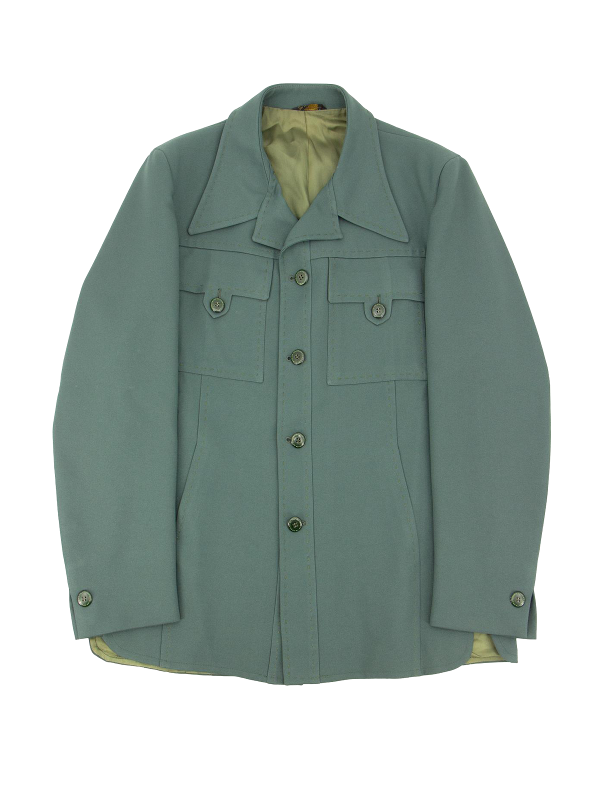 Unusual and characterful 1970s safari-style casual jacket in green, full of distinctive vintage detailing. Designed with a bold oversized collar and practical four-pocket layout, this piece captures the adventurous spirit of 70s menswear.
