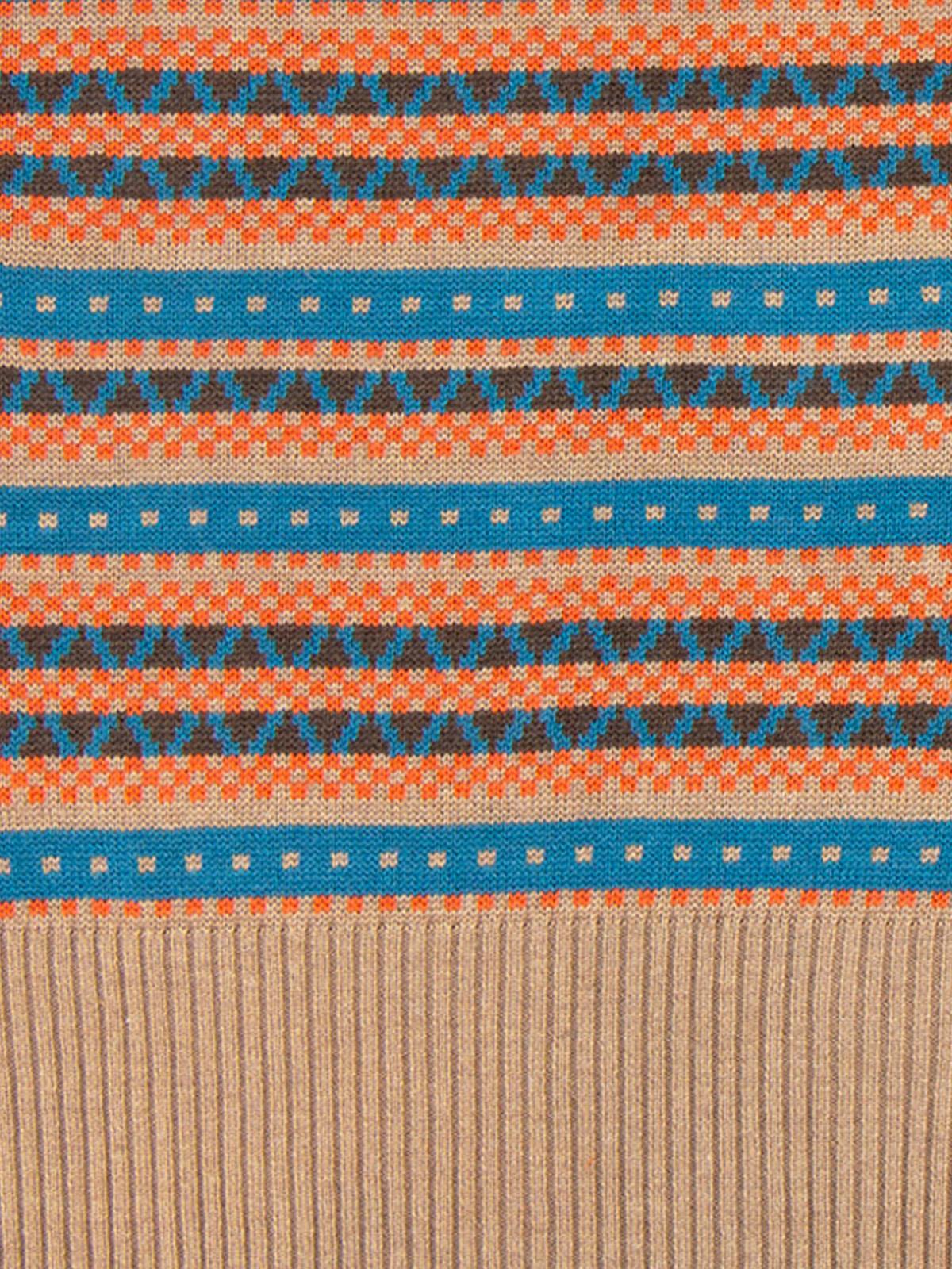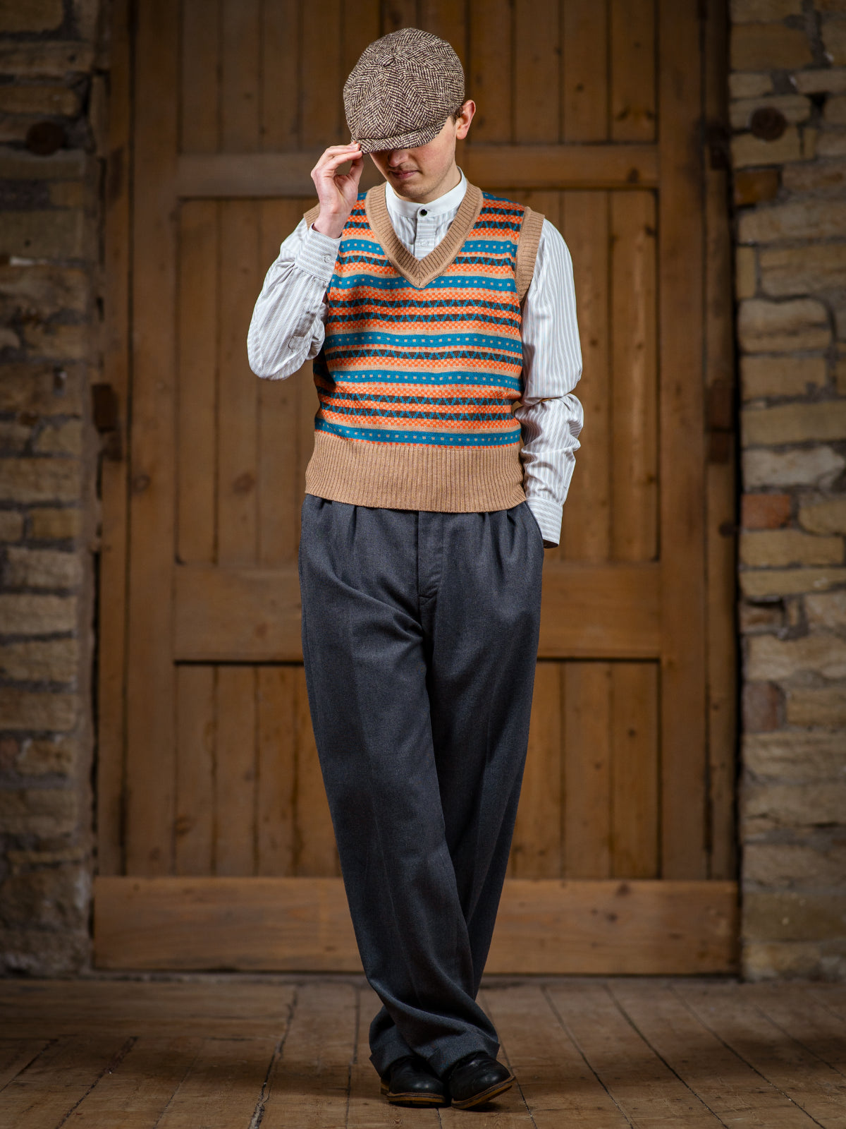 The Walter knitted tank top is a 1940s vintage-inspired classic that is as versatile as it is practical. The light brown and orange colourway adds lovely warm tones to your ensemble with blue and dark brown highlights to create a vibrant look to combat the chilly weather outside. Hi-de-Ho!