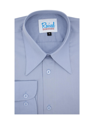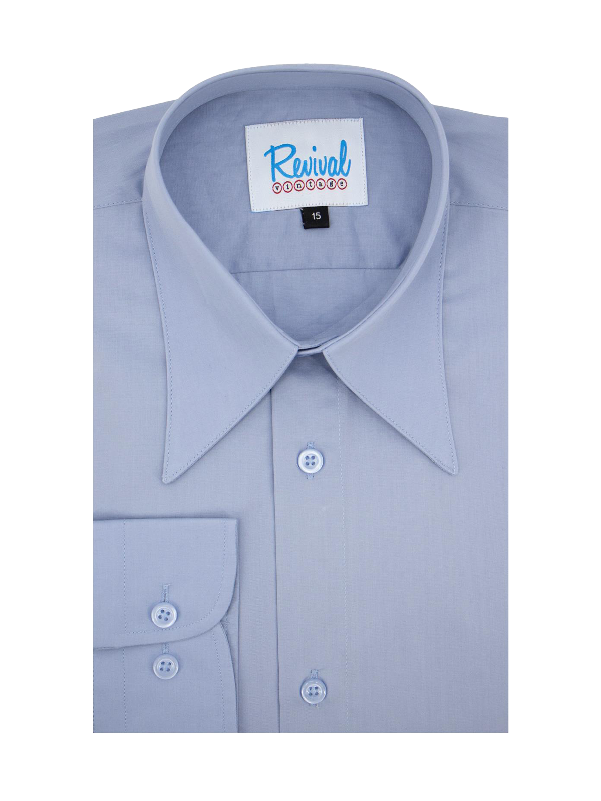 1940s vintage style cotton rich shirt with a spearpoint collar in a classic light blue.