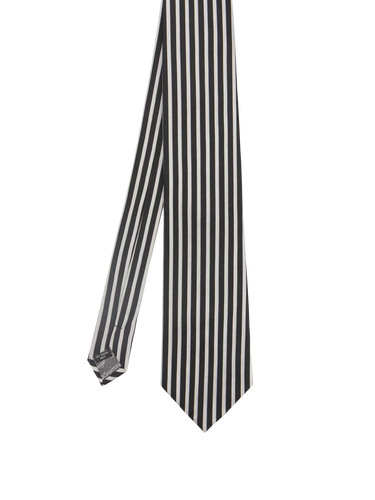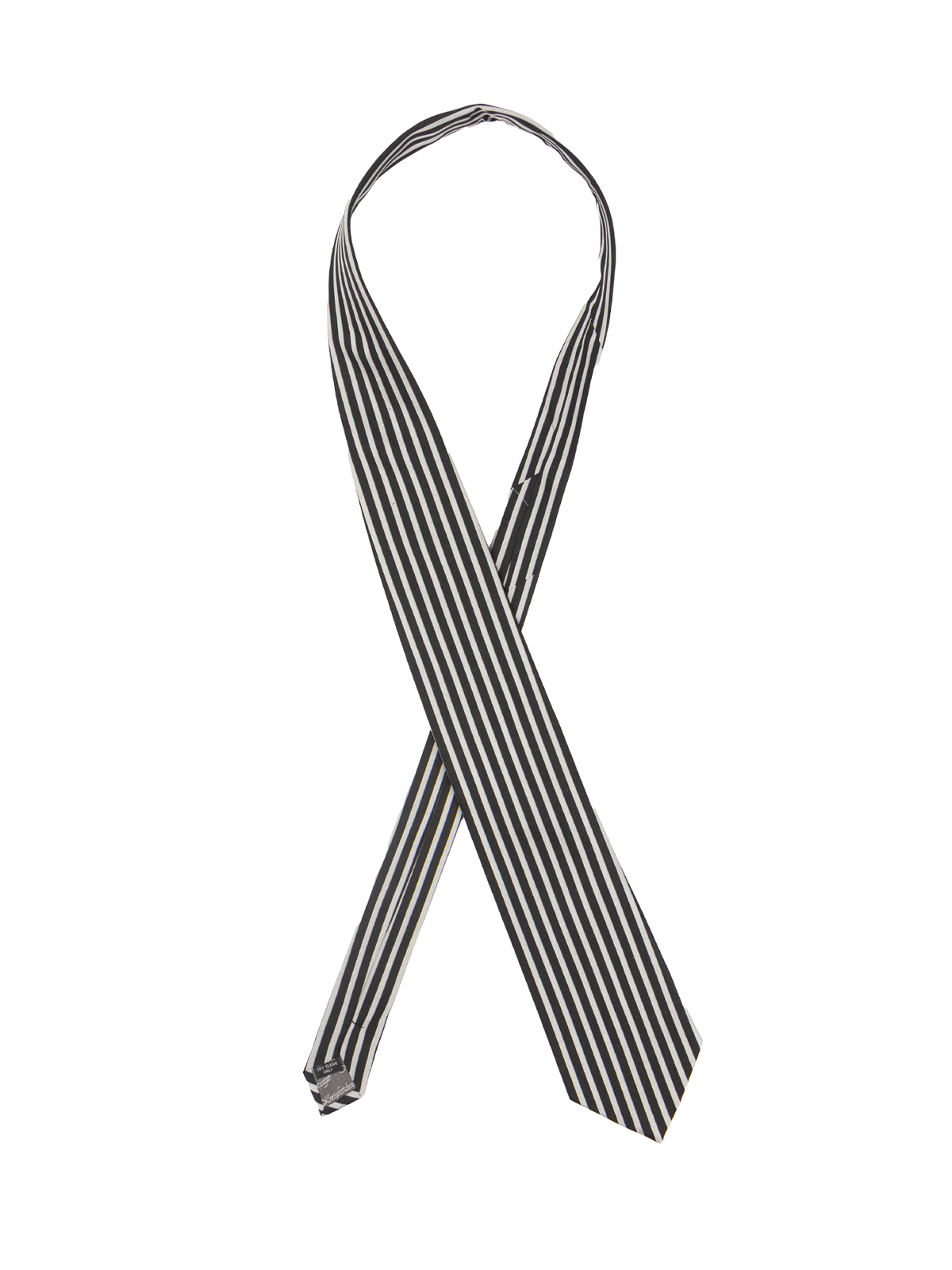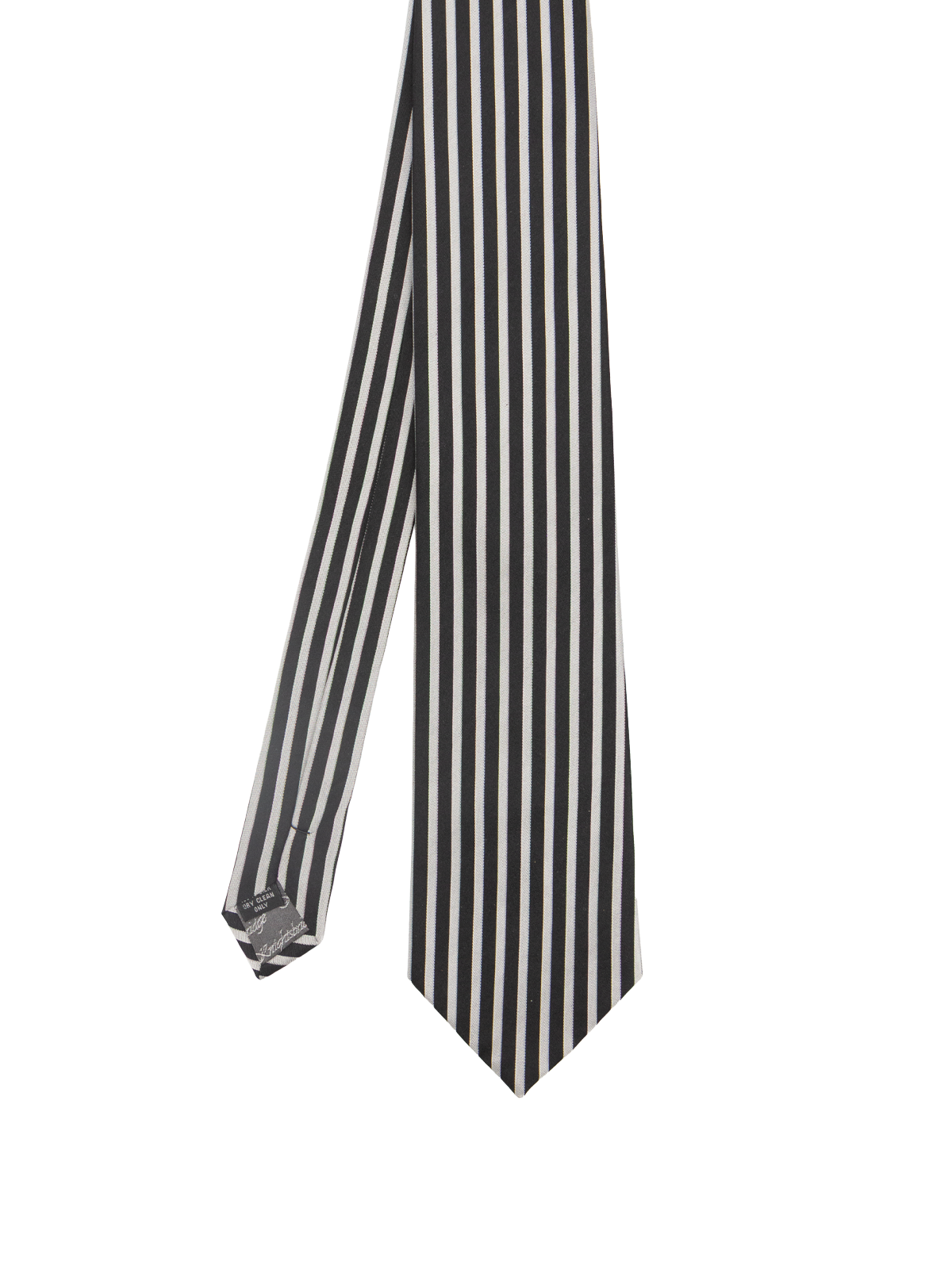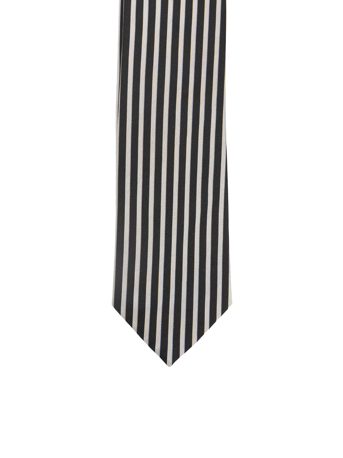 A midcentury vintage style black swing tie featuring silver vertical stripe pattern. Crafted from 100% pure silk, this high quality tie captures the refined sophistication of 1940s and 1950s menswear, perfect for formal occasions or adding a touch of vintage flair to your outfit.
