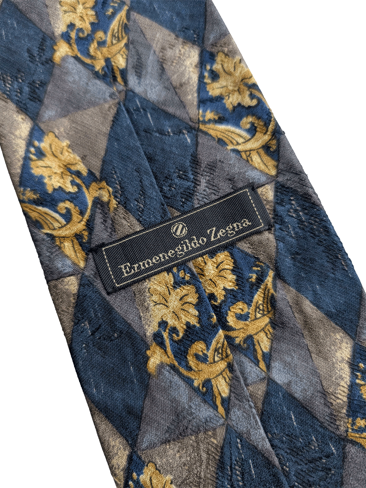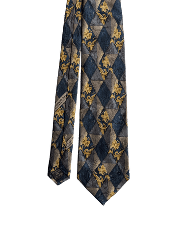 A designer tie with the quality you would expect from Ermenegildo Zegna label. Highest quality silk in a rich finish. Featuring a tonal blue dimond pattern background, with gold baroque detail. A timeless accessory to add interest to a spearpoint collar shirt.