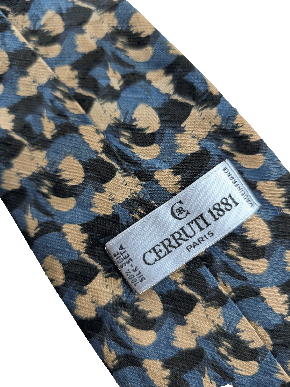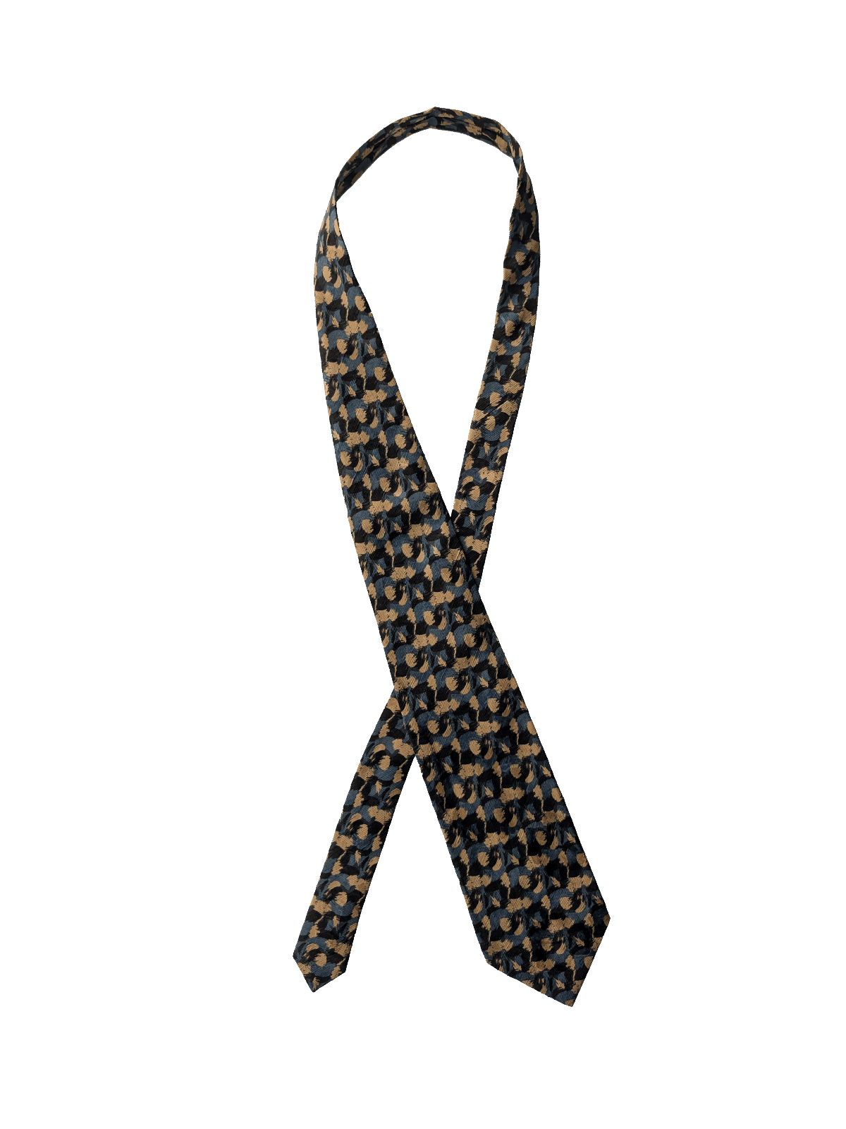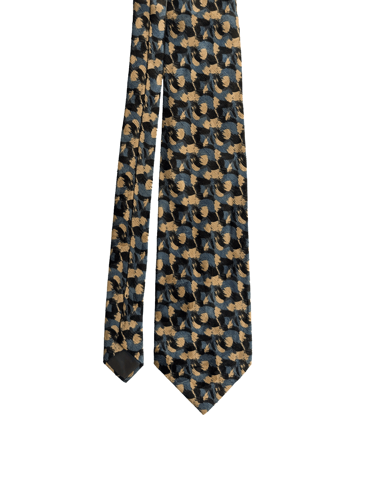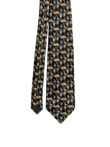 A designer tie with the quality you would expect from Cerruti 1881 label. Highest quality silk in a rich finish. Featuring an abstract repeat design of brushstrokes, in a striking mix of black, blue, and tan/gold shades. A way of adding character to a standard suit and shirt.