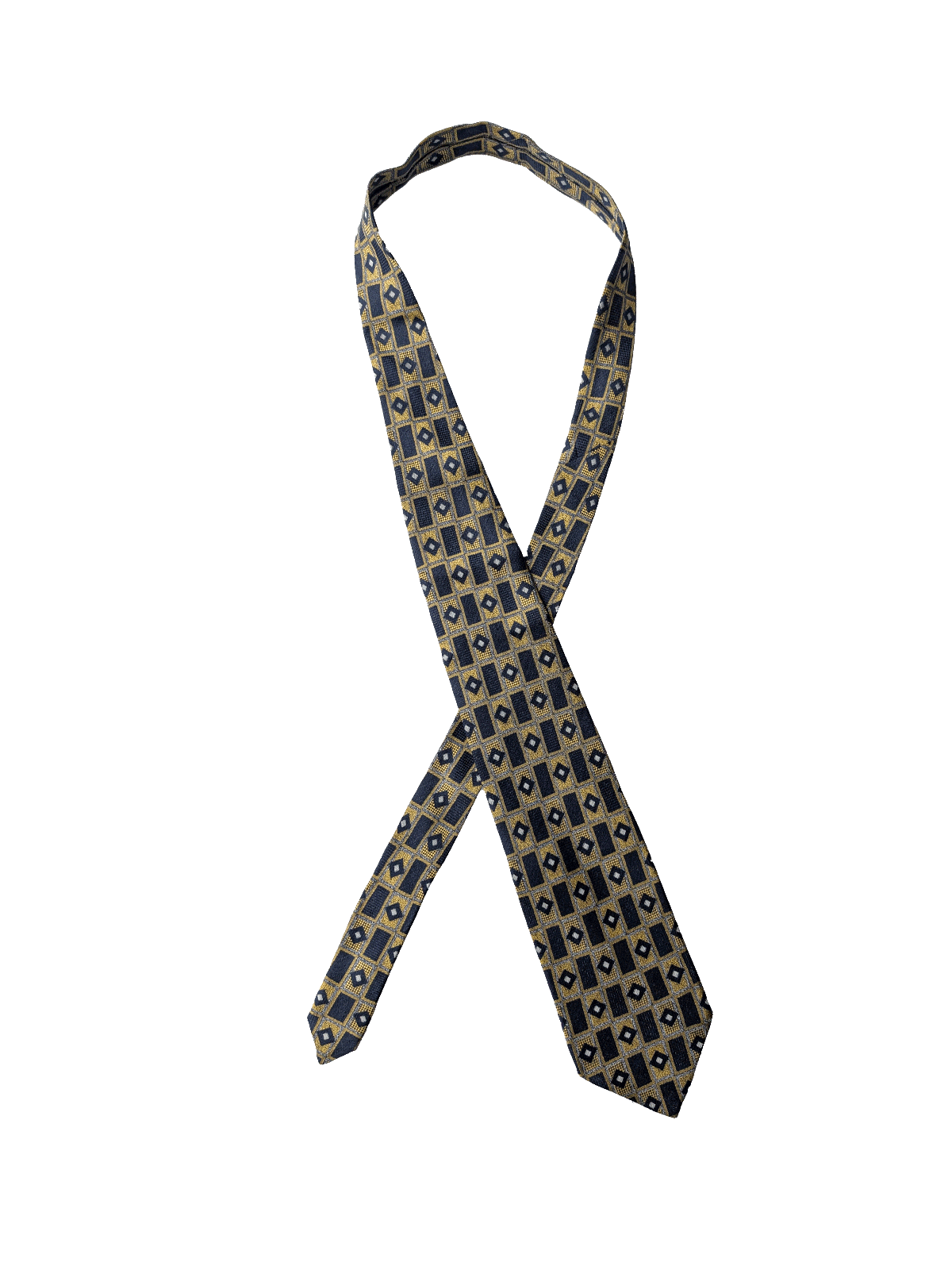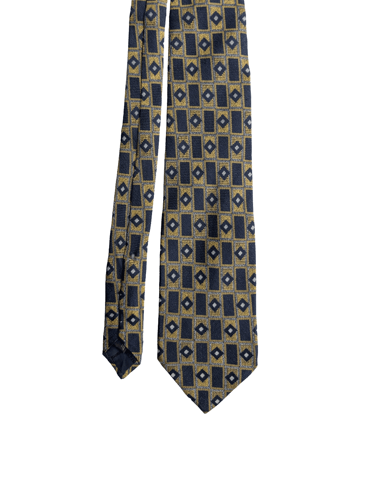 A designer tie with the quality you would expect from Ermenegildo Zegna label. Highest quality silk in a rich finish. Featuring a geometric repeat pattern in navy blue, gold, and grey squares and diamonds. A timeless accessory to add interest to spearpoint collar shirt.