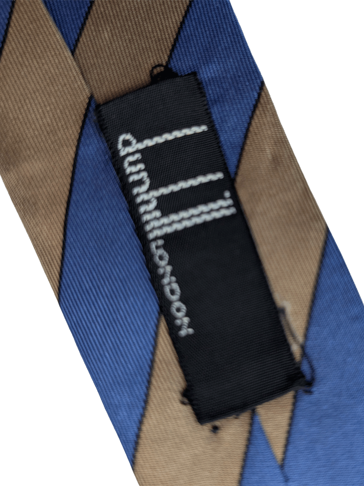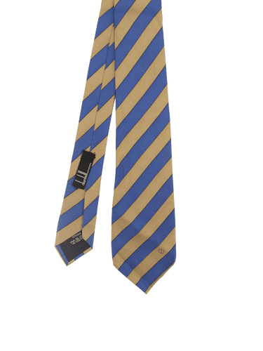 A designer tie with the quality you would expect from Dunhill London label. Featuring a classic college stripe design in a striking combination of blue and gold. Add a colourful pop to your vintage outfit with this statement accessory.