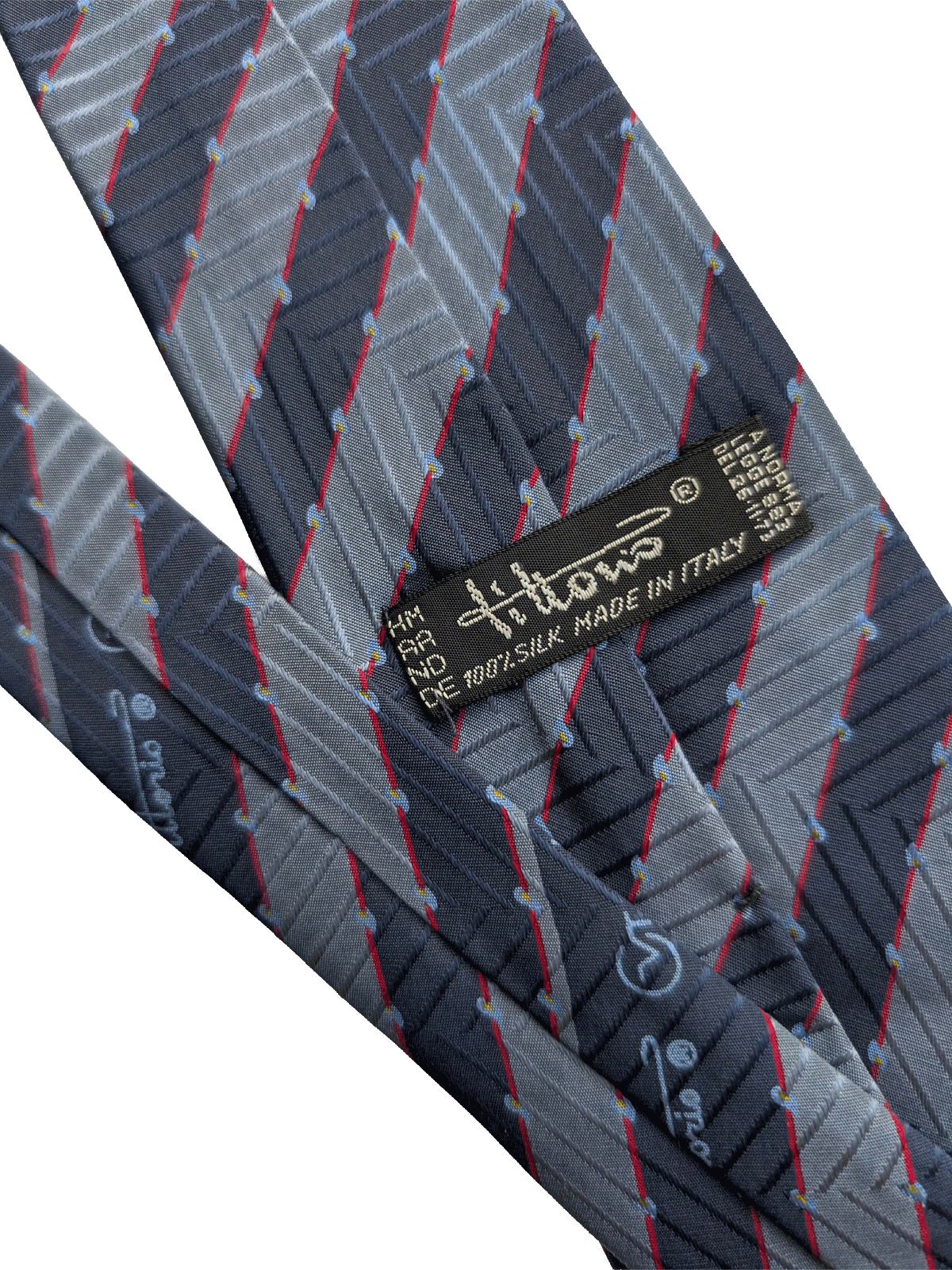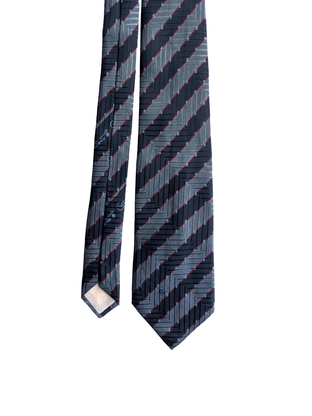 This true vintage tie features a geometric repeat stripe design in tonal blues with a contrasting fine red line, and blue and yellow flecks. A stylish way to add a dapper touch to your vintage style shirts. Highest quality silk in a rich finish.