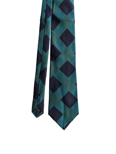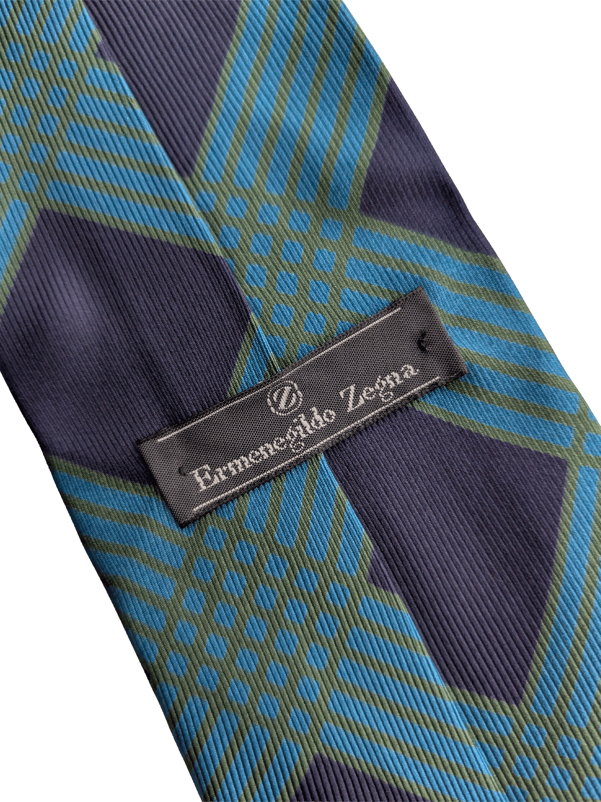 A designer tie with the quality you would expect from Ermenegildo Zegna label. Highest quality silk in a bold finish. Featuring an eye catching geometric repeat pattern of overlapping diamonds in navy blue, teal blue and green. An eye catching neck tie for the discerning Gentleman.