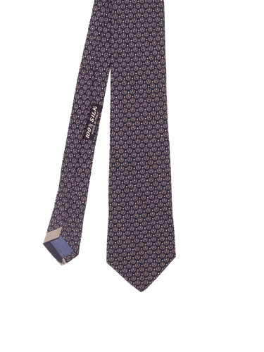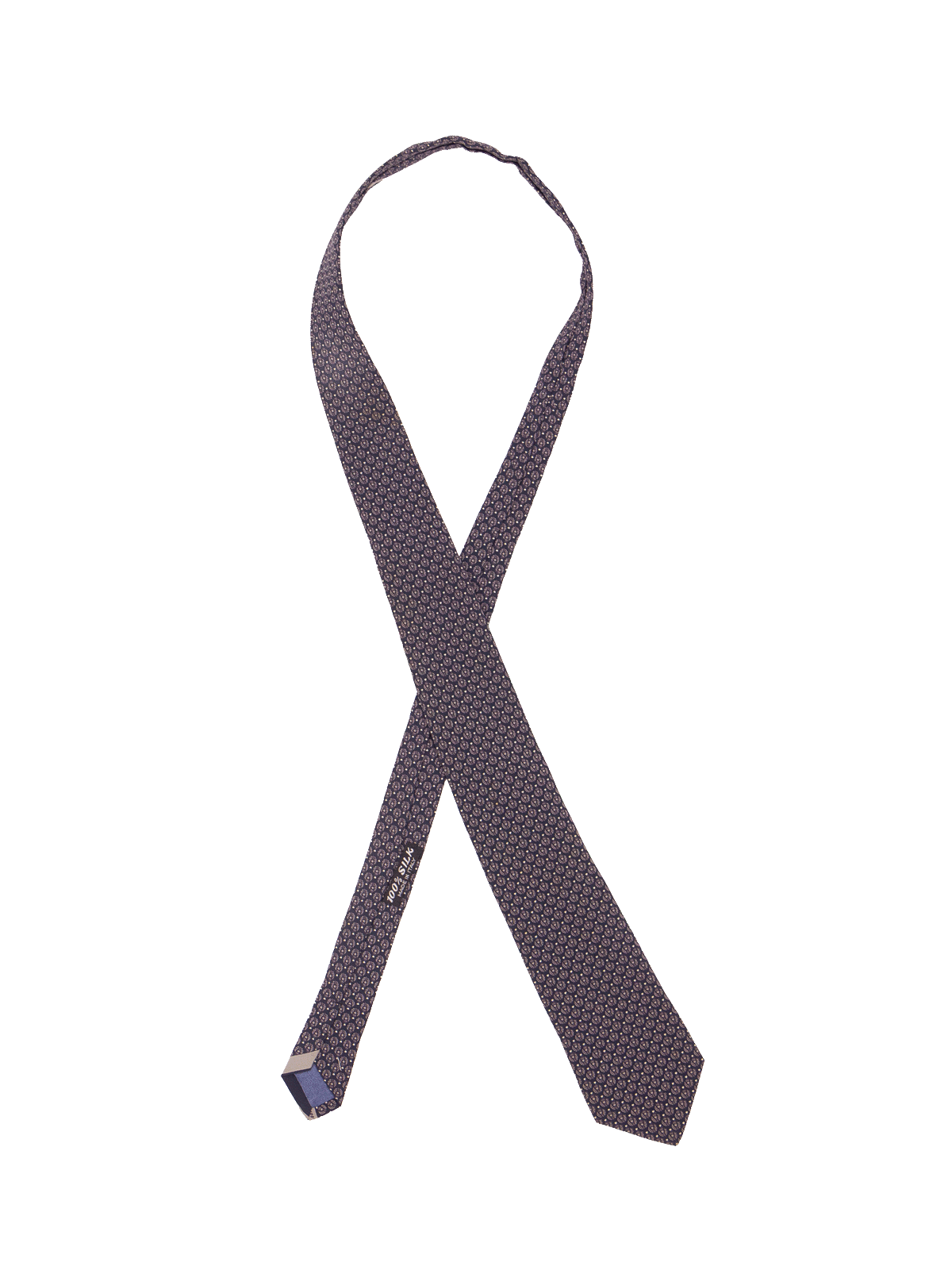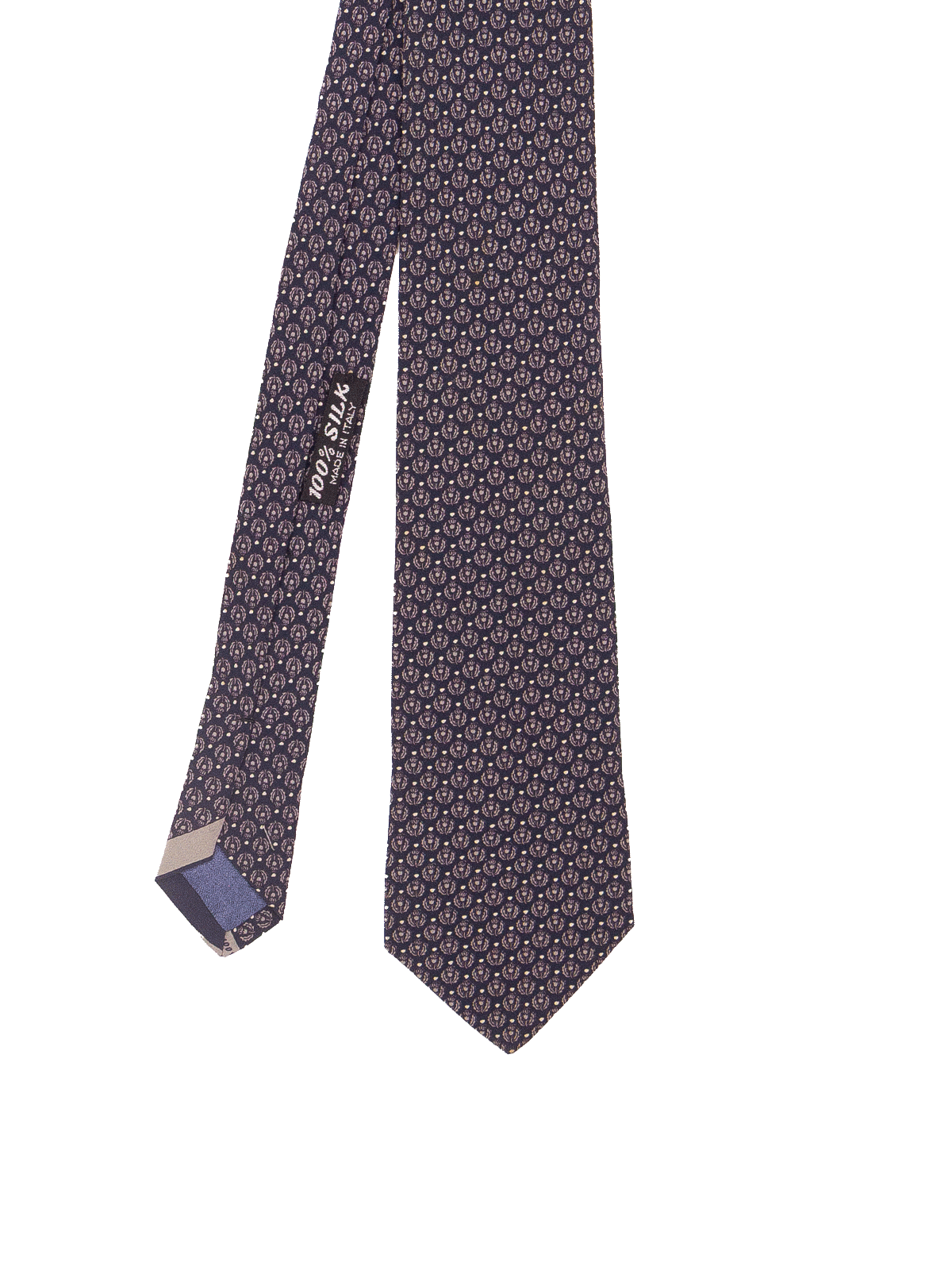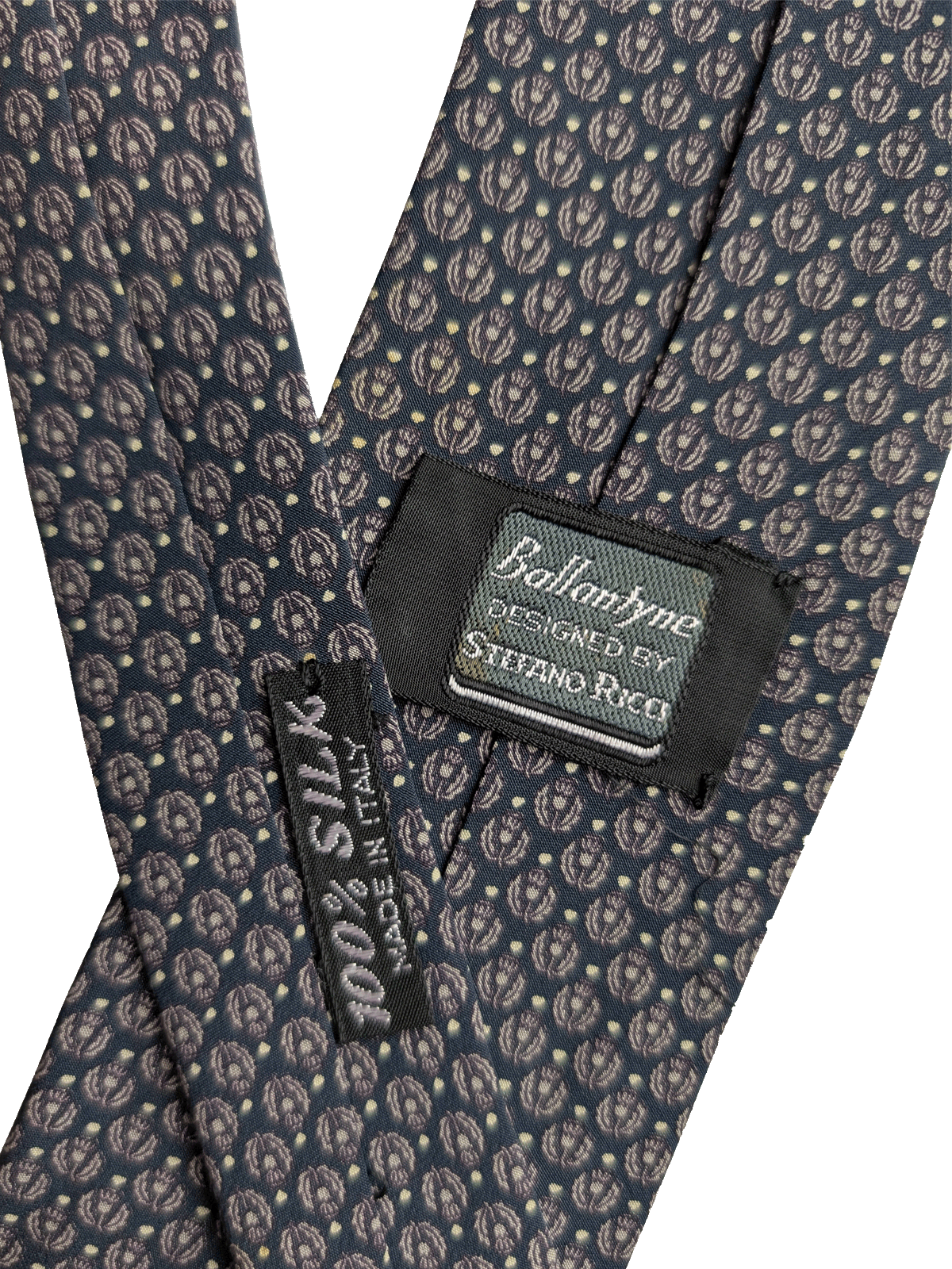 A high quality, silk, true vintage tie. The design is a miniature thistle, in an aubergine purple colour, in a repeat pattern, on a deep navy background. A classic tie to coordinate with mid-century clothing.