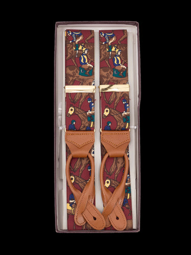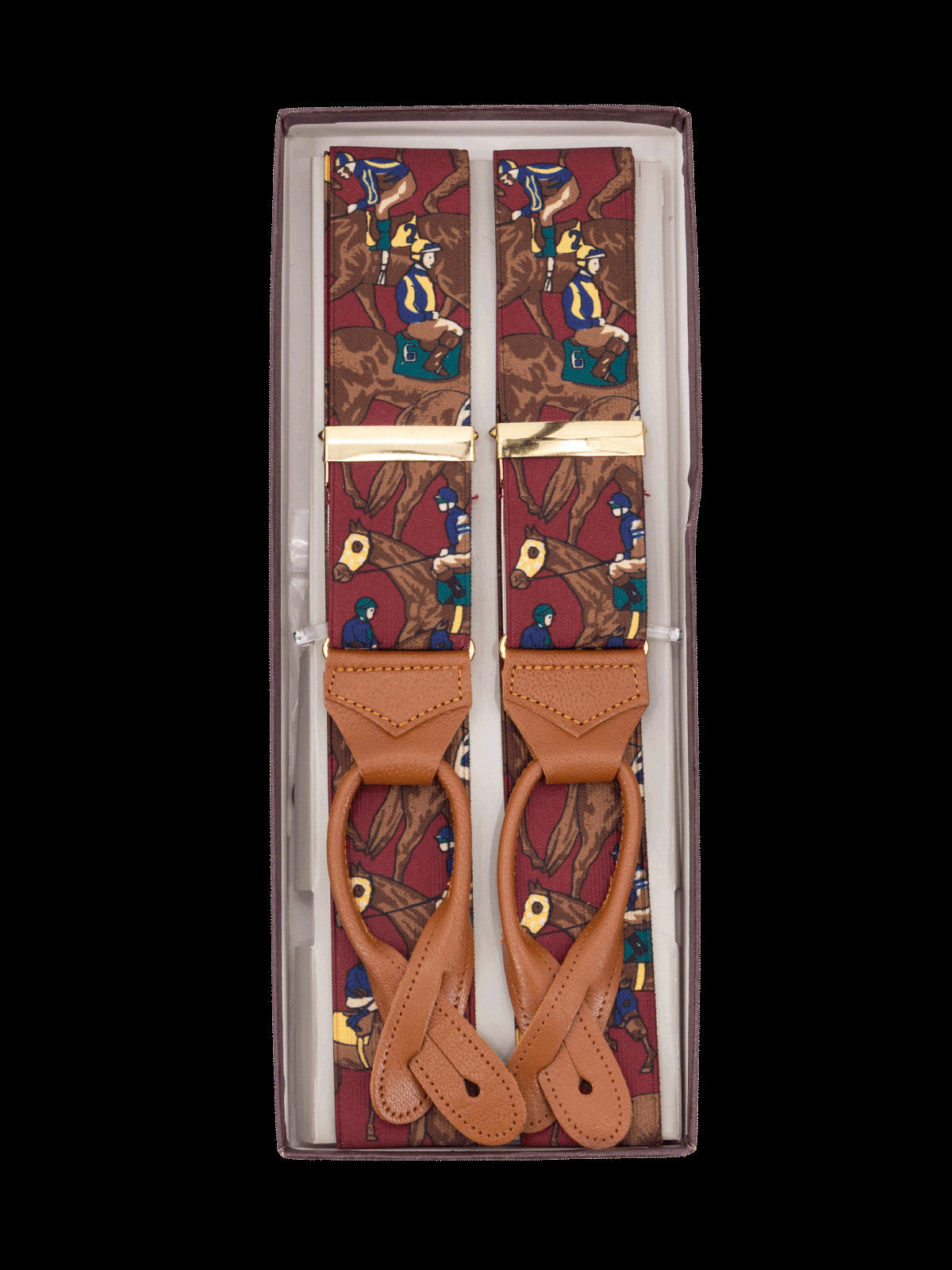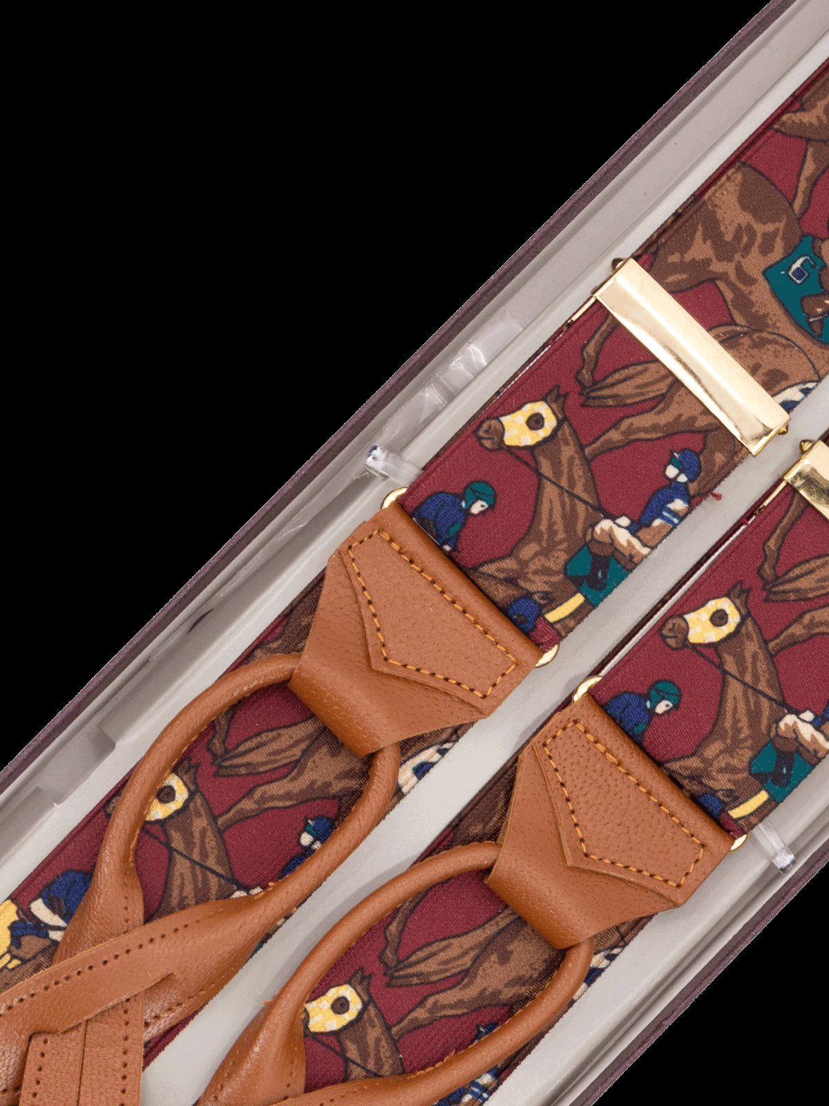 Handcrafted deadstock trouser braces in a striking red woven fabric featuring a classic jockey and horse racing motif, finished with sleek tan leather loops for fastening to trouser waist buttons. Expertly handmade and fitted with adjustable brass fittings for a refined, comfortable fit, they feature a classic ‘Y’ back construction.