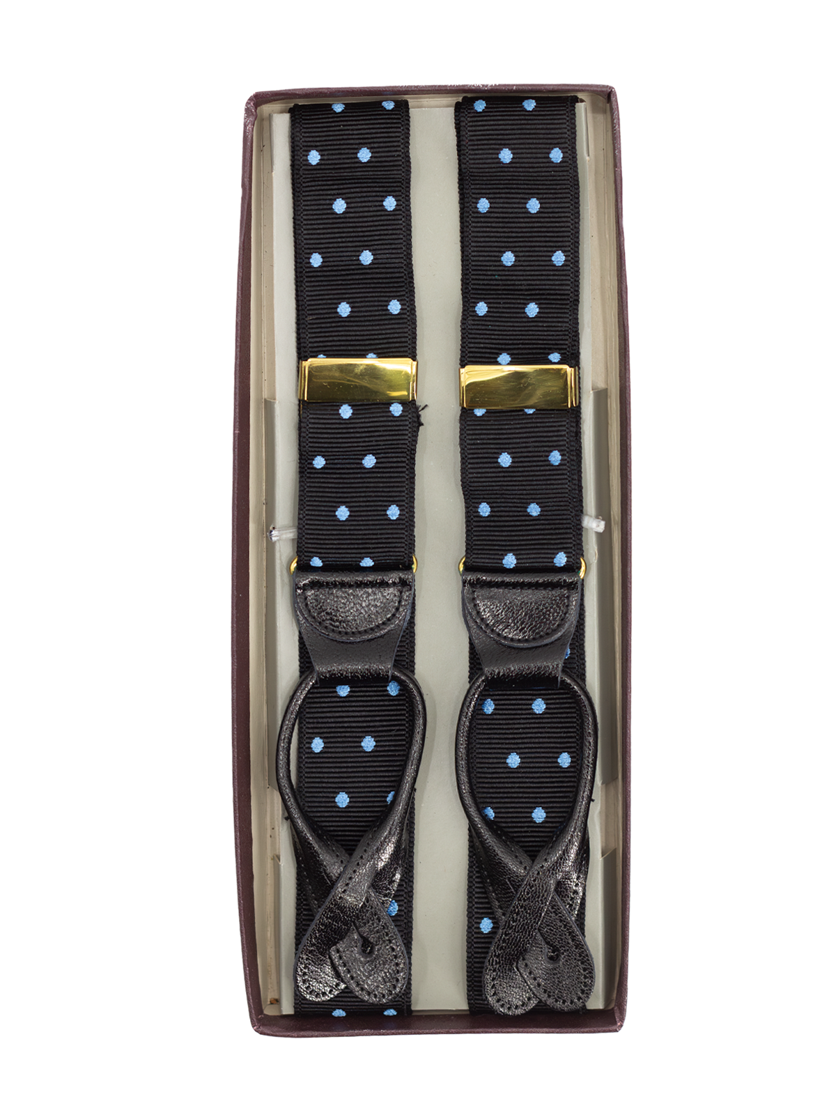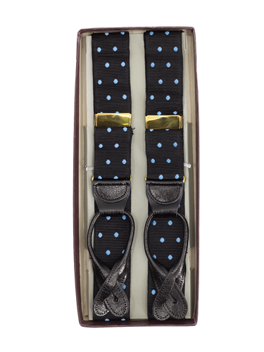 Handcrafted deadstock trouser braces in a classic black woven fabric featuring a light blue polka dot pattern. Finished with sleek black leather loops for fastening to trouser waist buttons. Expertly handmade and fitted with adjustable gold tone fittings for a comfortable fit, they feature a classic ‘Y’ back construction.