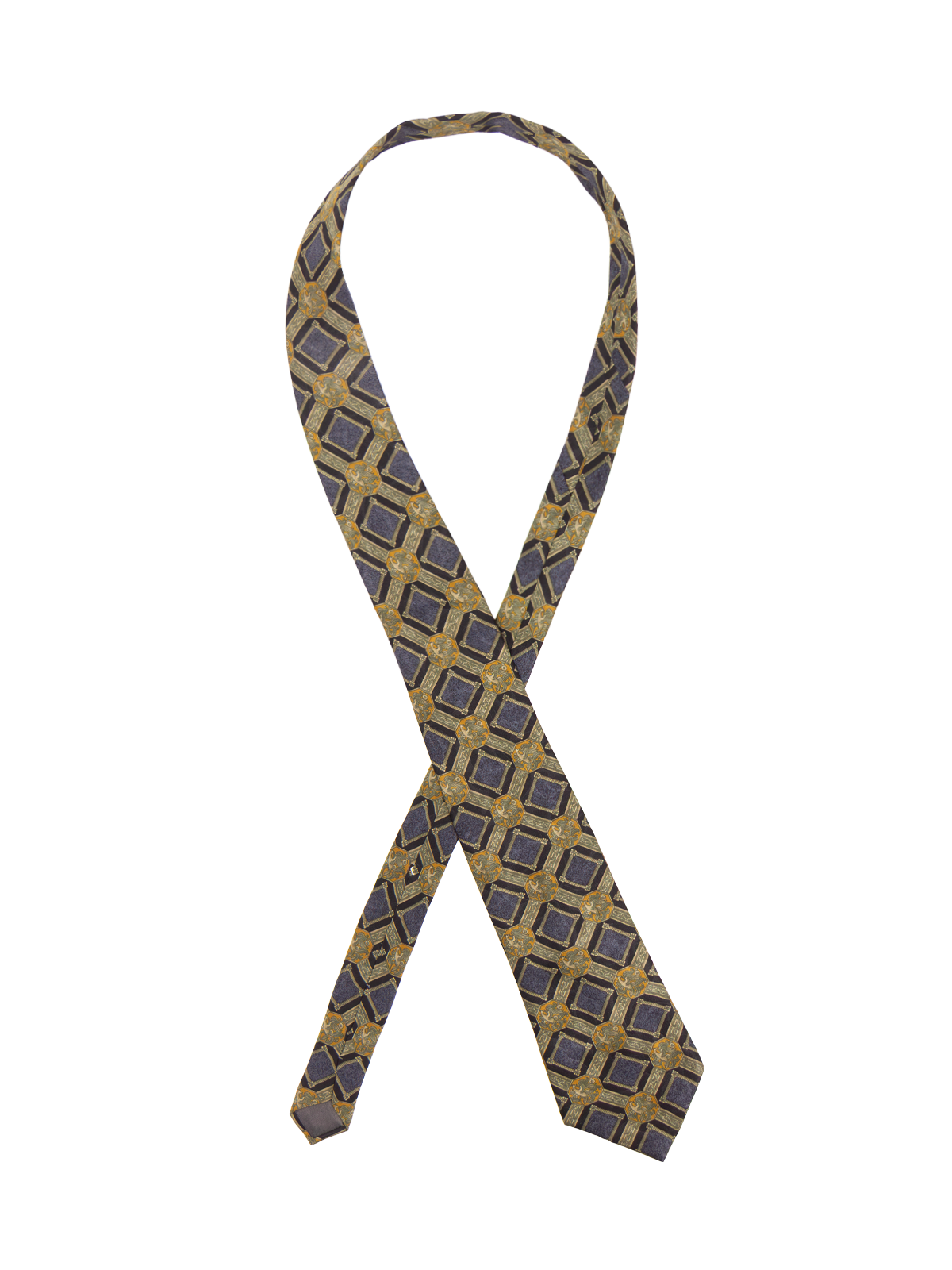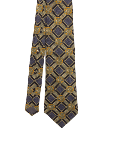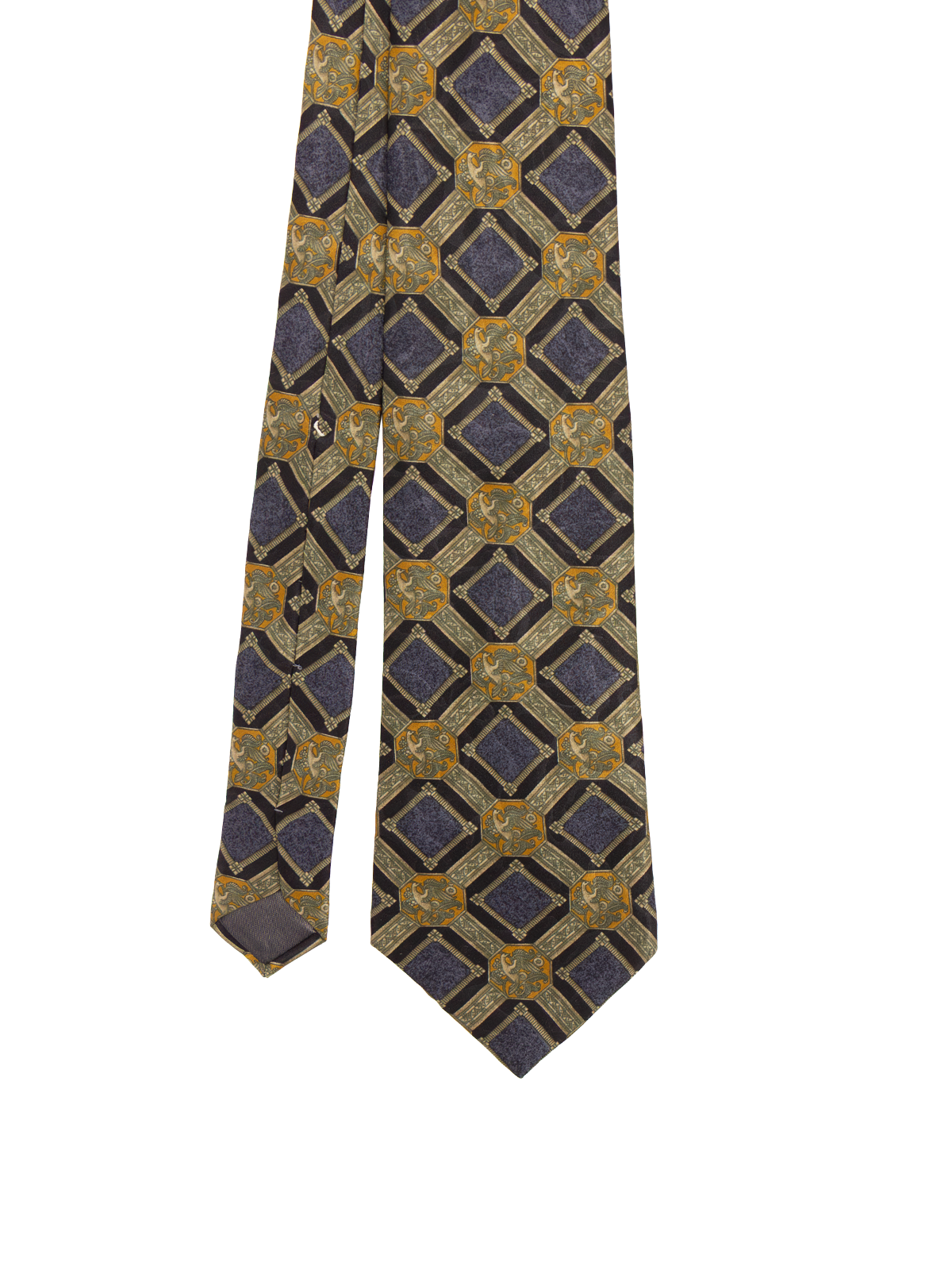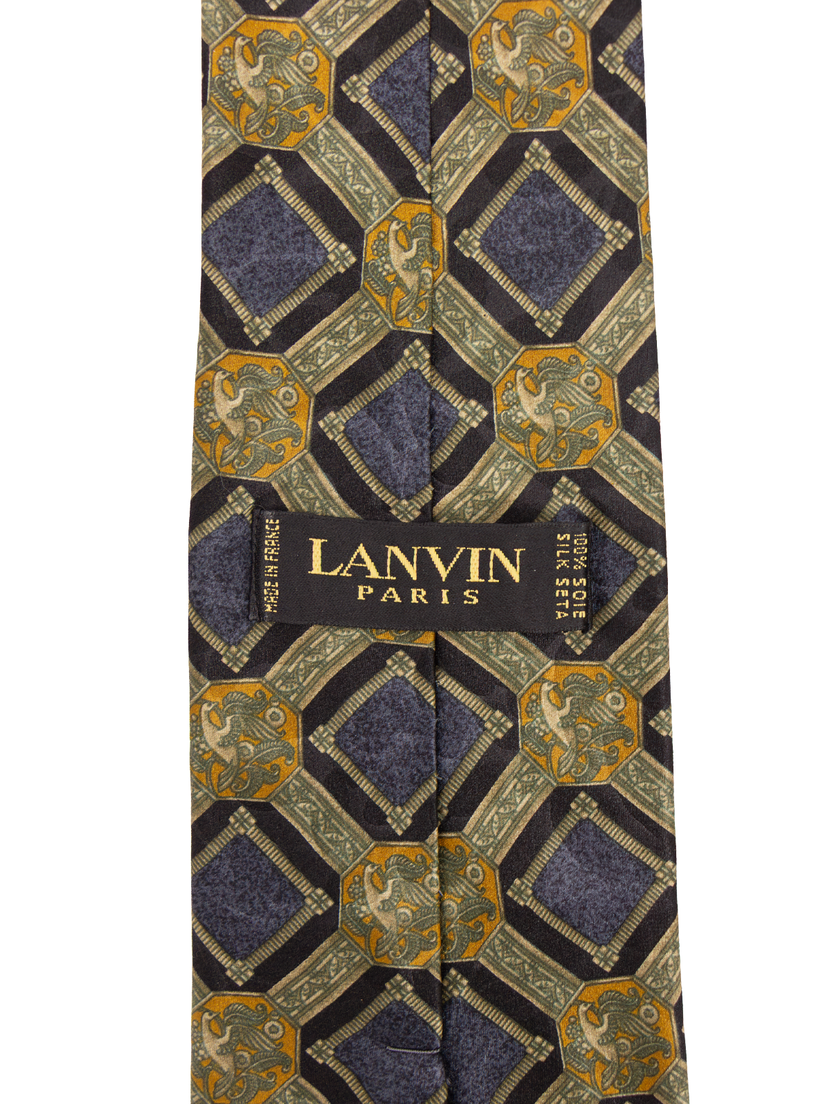 Authentic Lanvin silk tie from a true vintage era. Designed in navy, gold, and orange, it features a repeat geometric pattern inspired by classical architecture, inset with orange octagons showcasing a small bird motif. A distinctive and well crafted accessory with timeless character.
