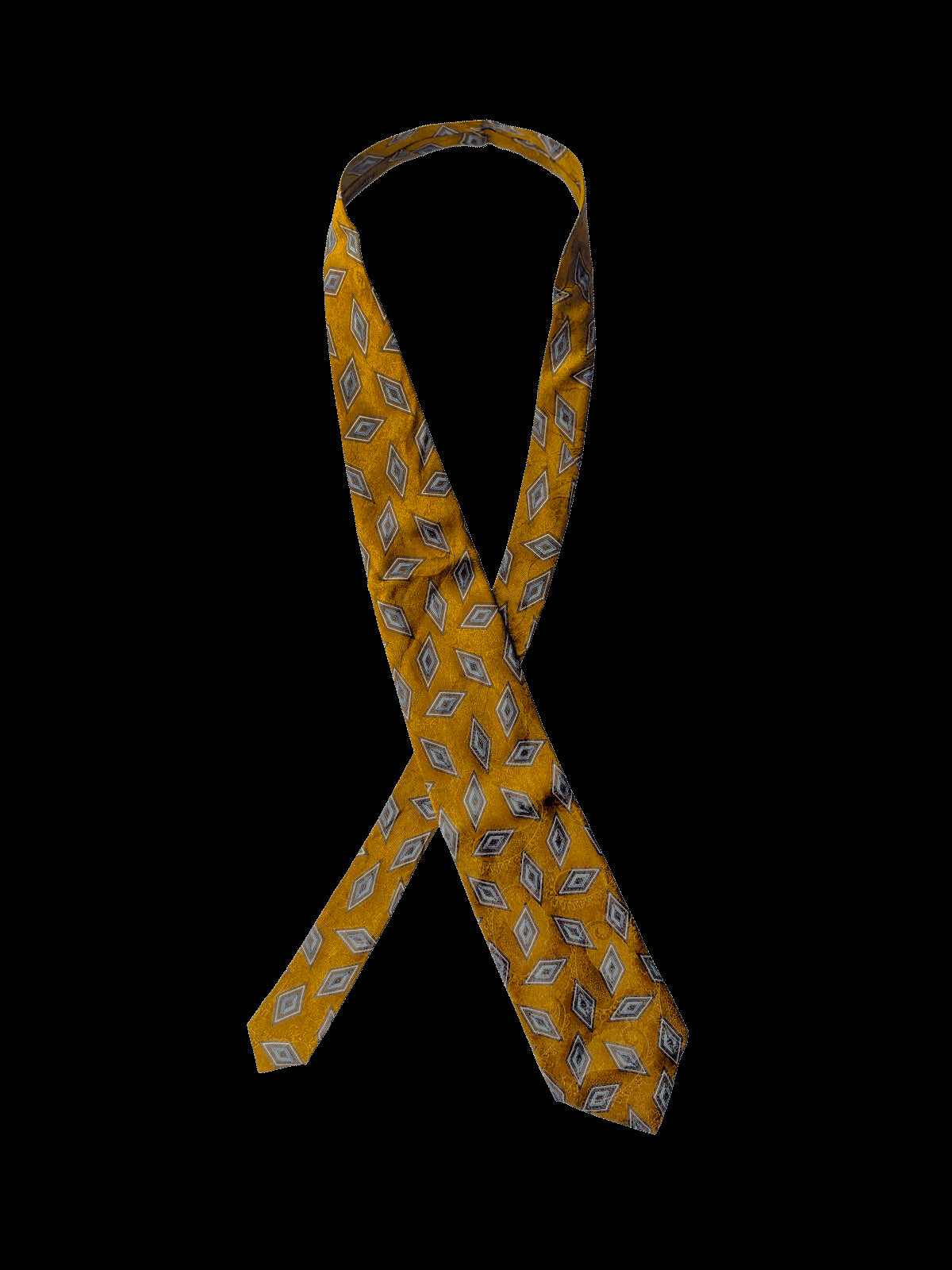 A designer tie with the quality you would expect from Ermenegildo Zegna label. Highest quality silk in a rich finish. Featuring an eye catching geometric repeat design of layered diamonds in a striking gold base with blue and brown accents. Faint paisley pattern in the background. An eye catching neck tie for the discerning Gentleman.