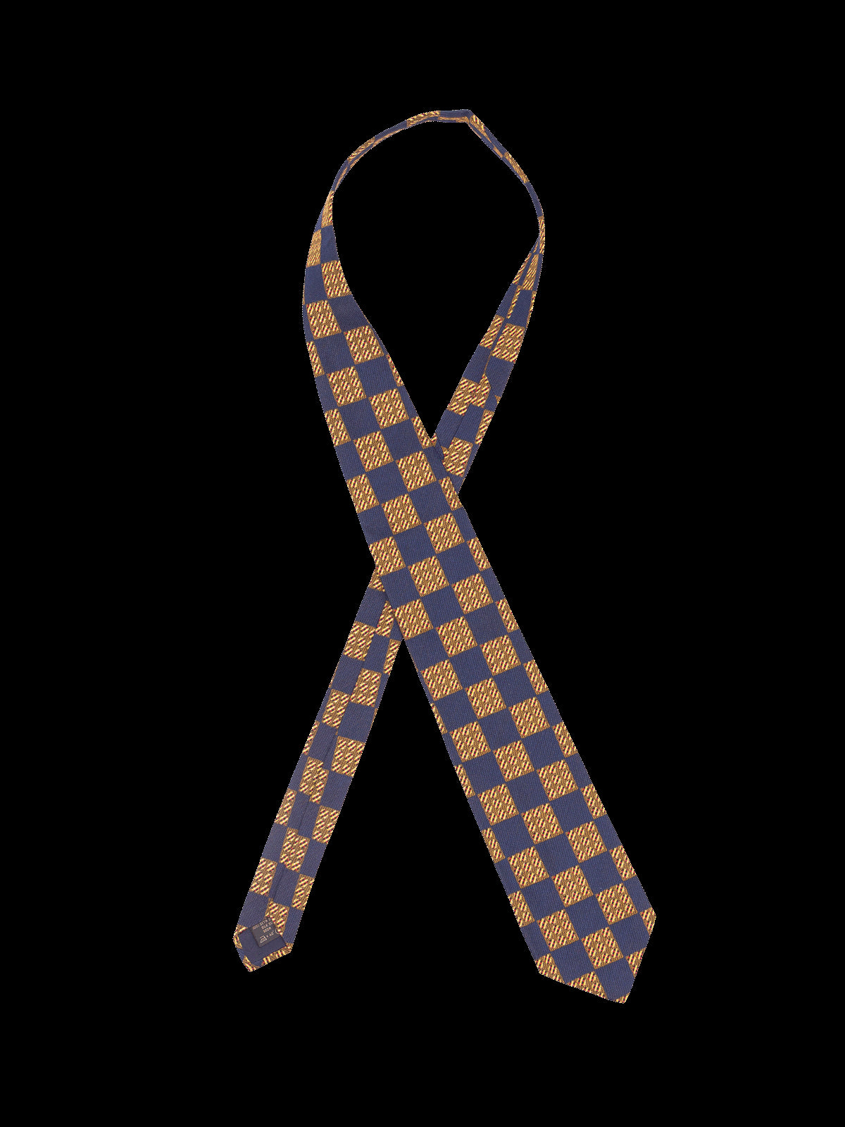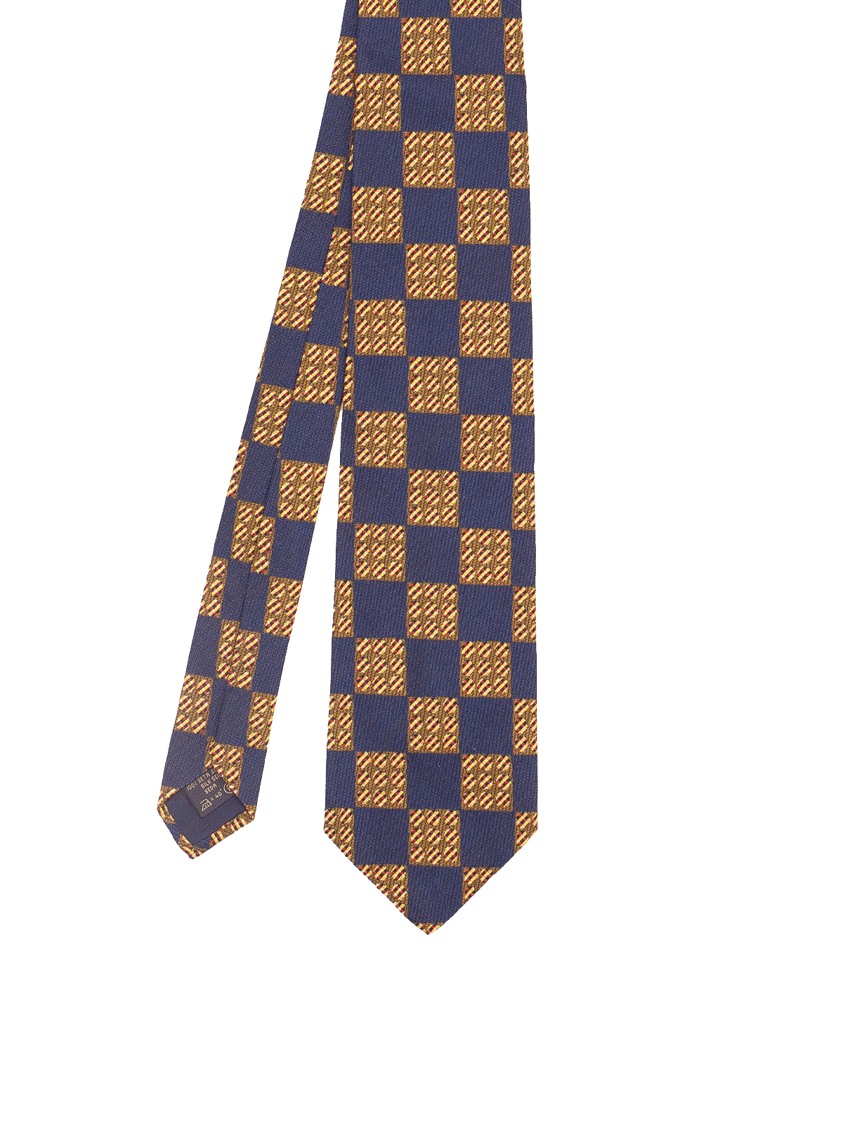 A designer tie with the quality you would expect from Ermenegildo Zegna label. Highest quality silk in a rich finish. Featuring an eye catching geometric repeat design of contrasting large checks, with a micro-pattern of small checks within the gold blocks, all set on a deep navy blue base. A timeless accessory to add interest to spearpoint collar shirt.