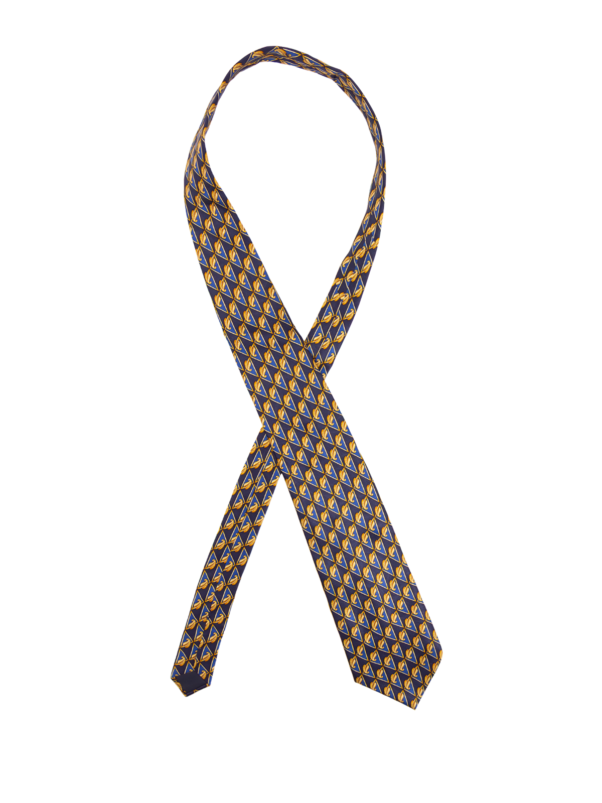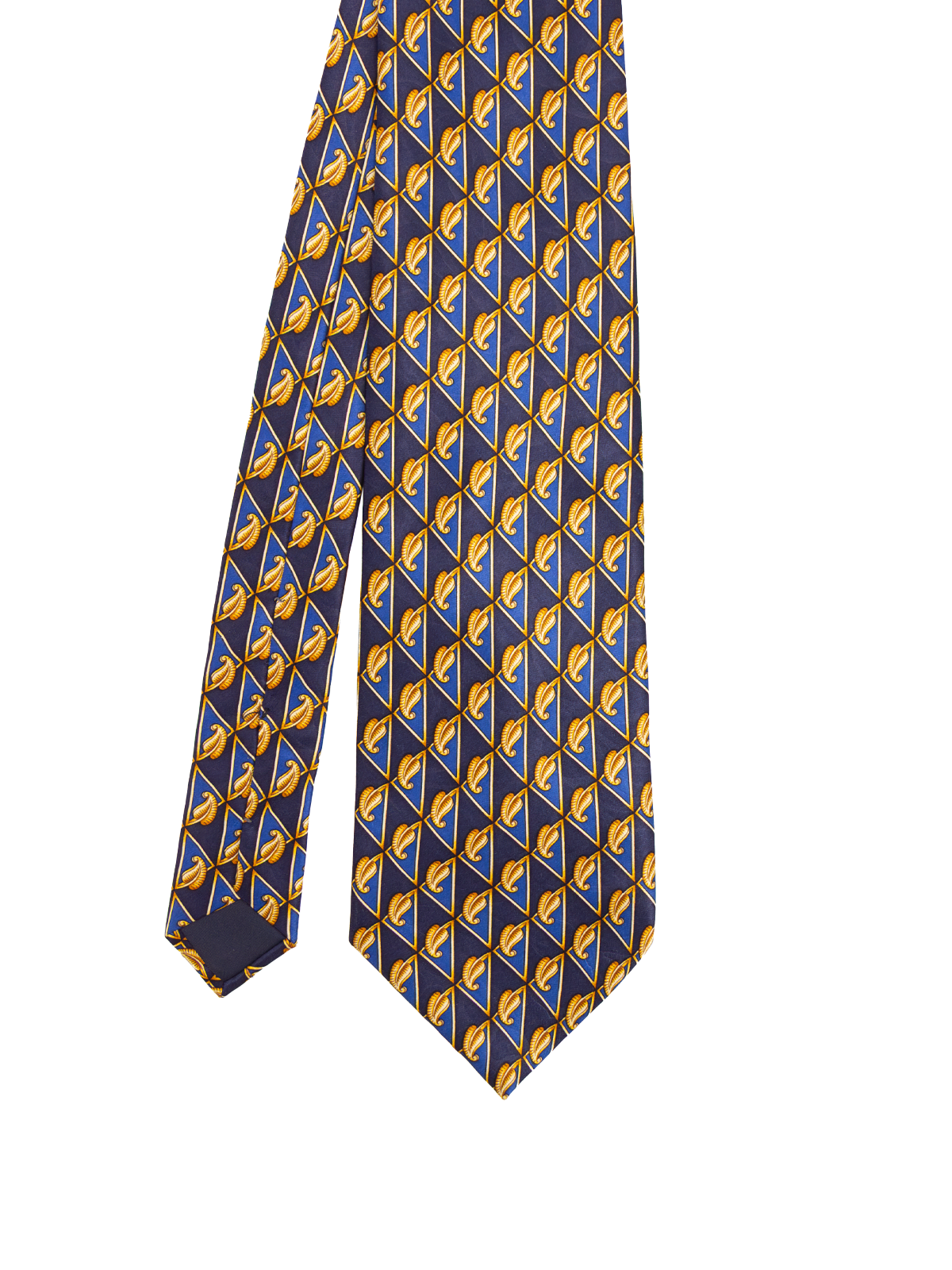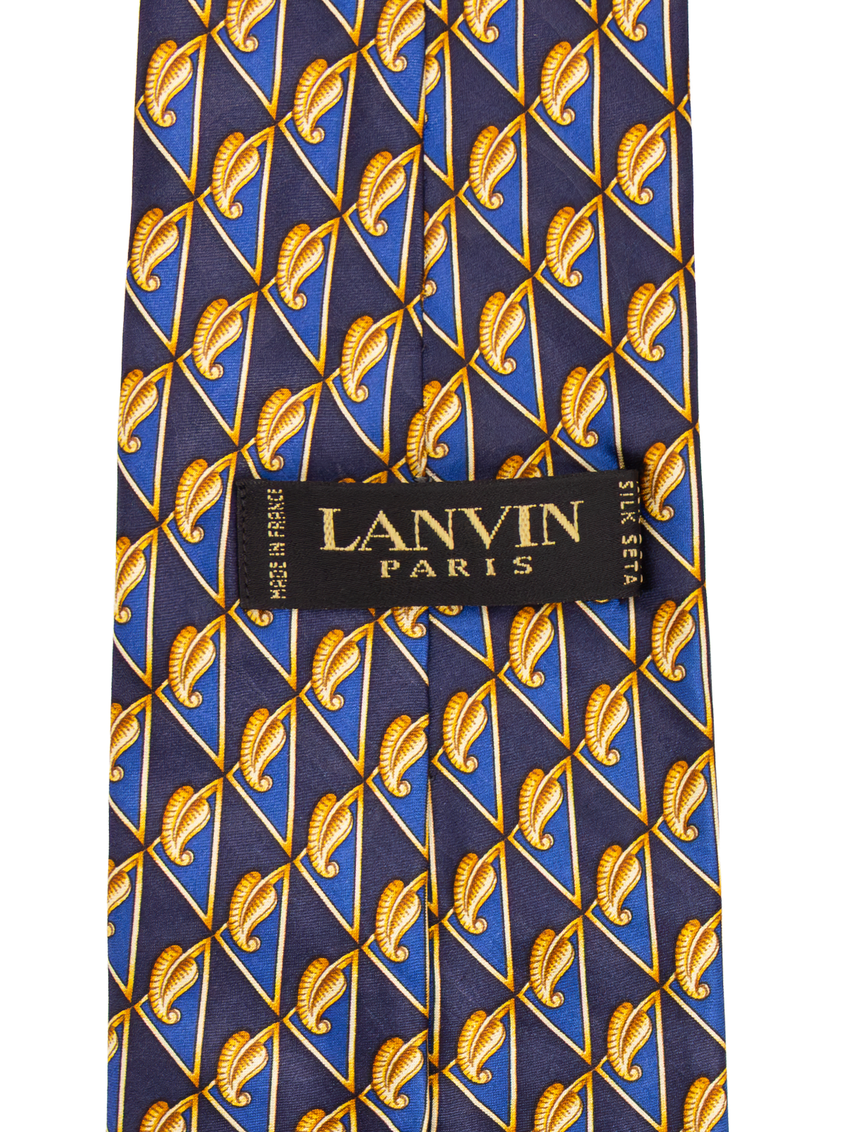 A true vintage silk tie by Lanvin, featuring a repeat diamond geometric pattern in tonal blues. The design is framed with gold edging and accented with gold leaf motifs. A refined piece with a strong classic aesthetic.