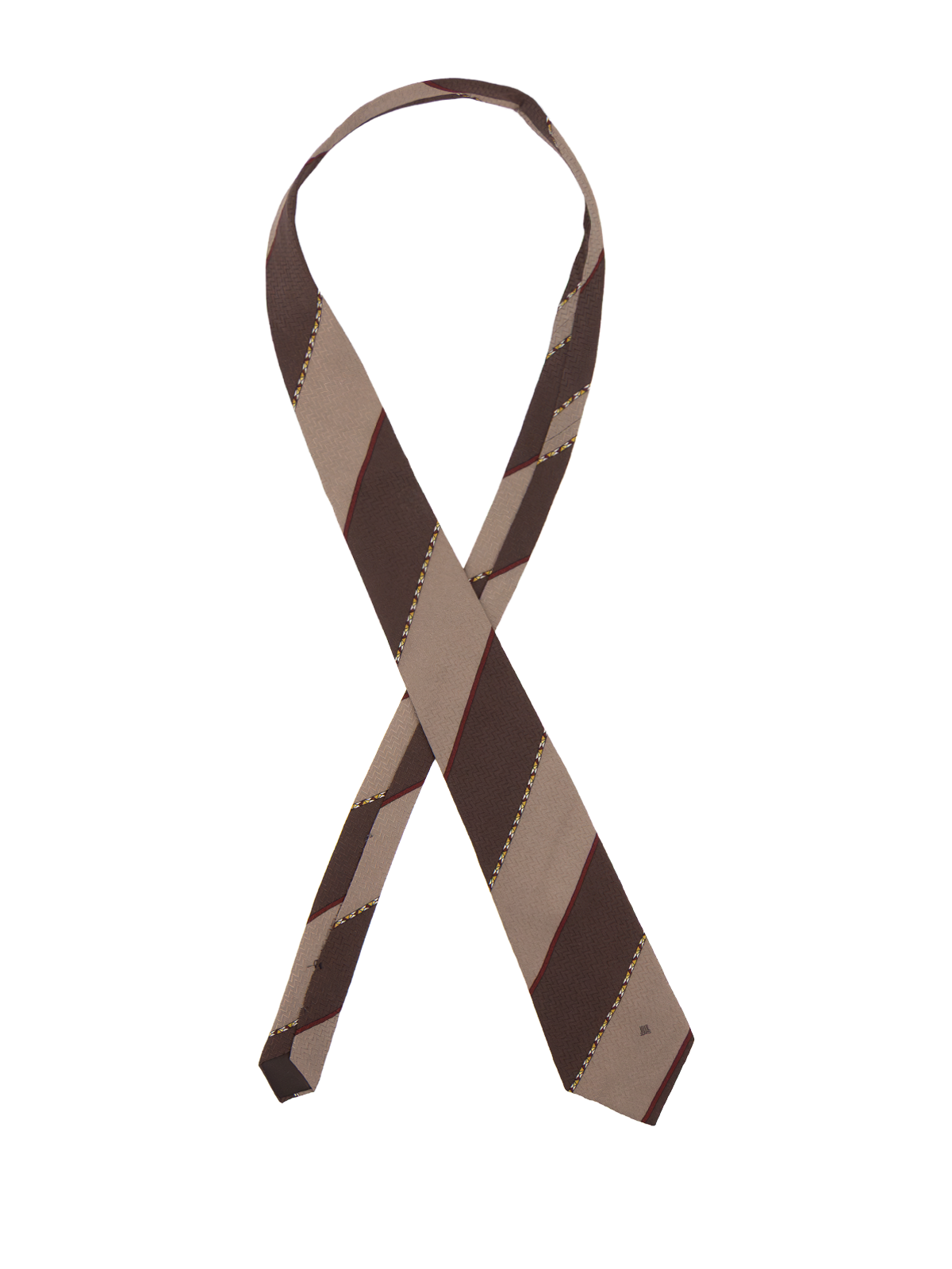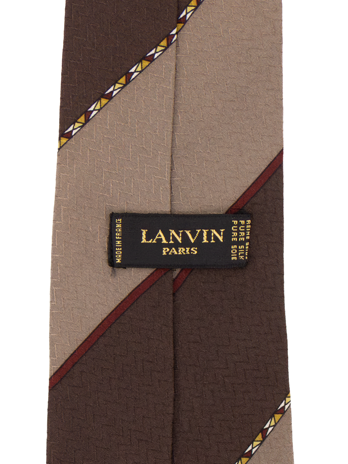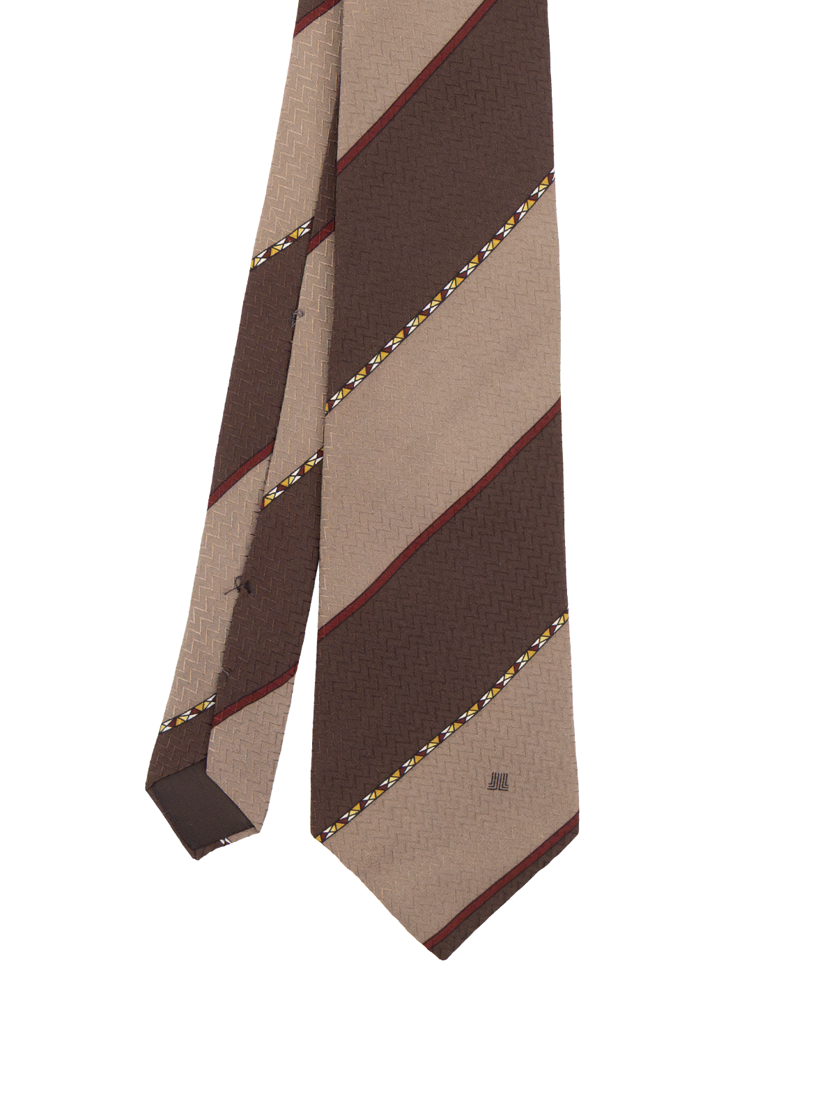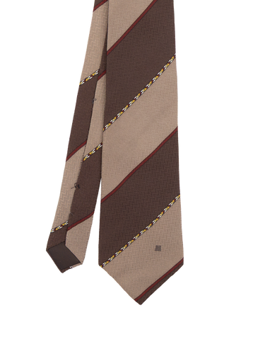 True vintage silk tie by Lanvin. Features brown and grey diagonal stripes, finished with burgundy and mustard edging for subtle contrast. A classic, well balanced design with timeless appeal.