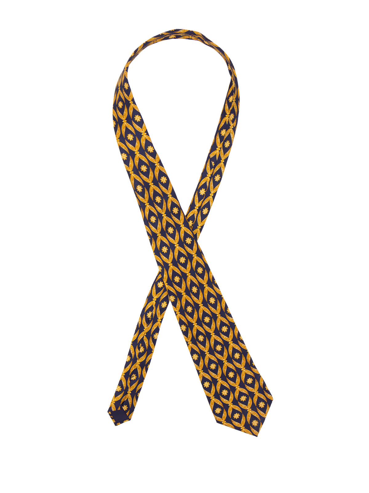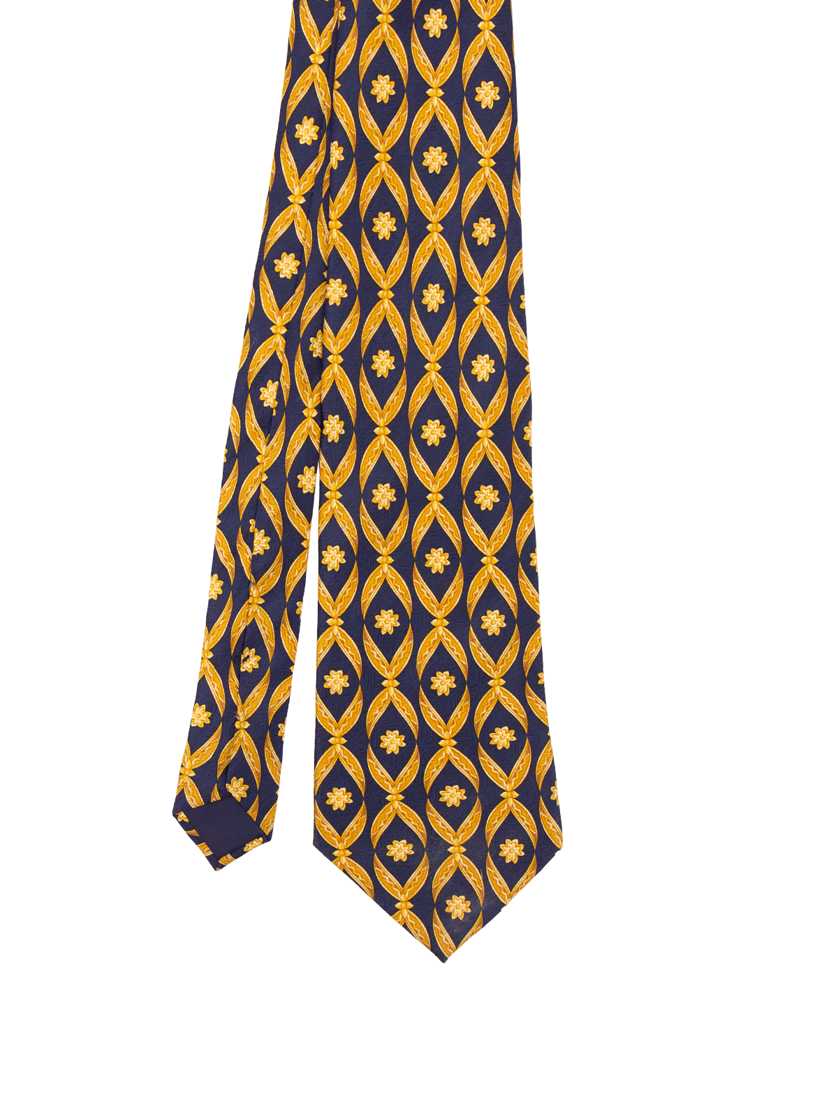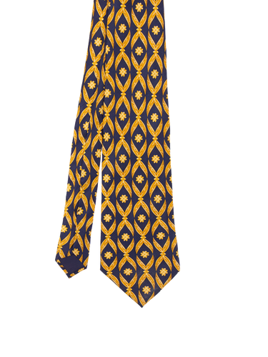 True vintage silk tie by Lanvin. Set on a deep navy blue ground, it features an opulent gold repeat design with floral motifs throughout. A striking piece with a refined, classic feel and unmistakable vintage elegance.