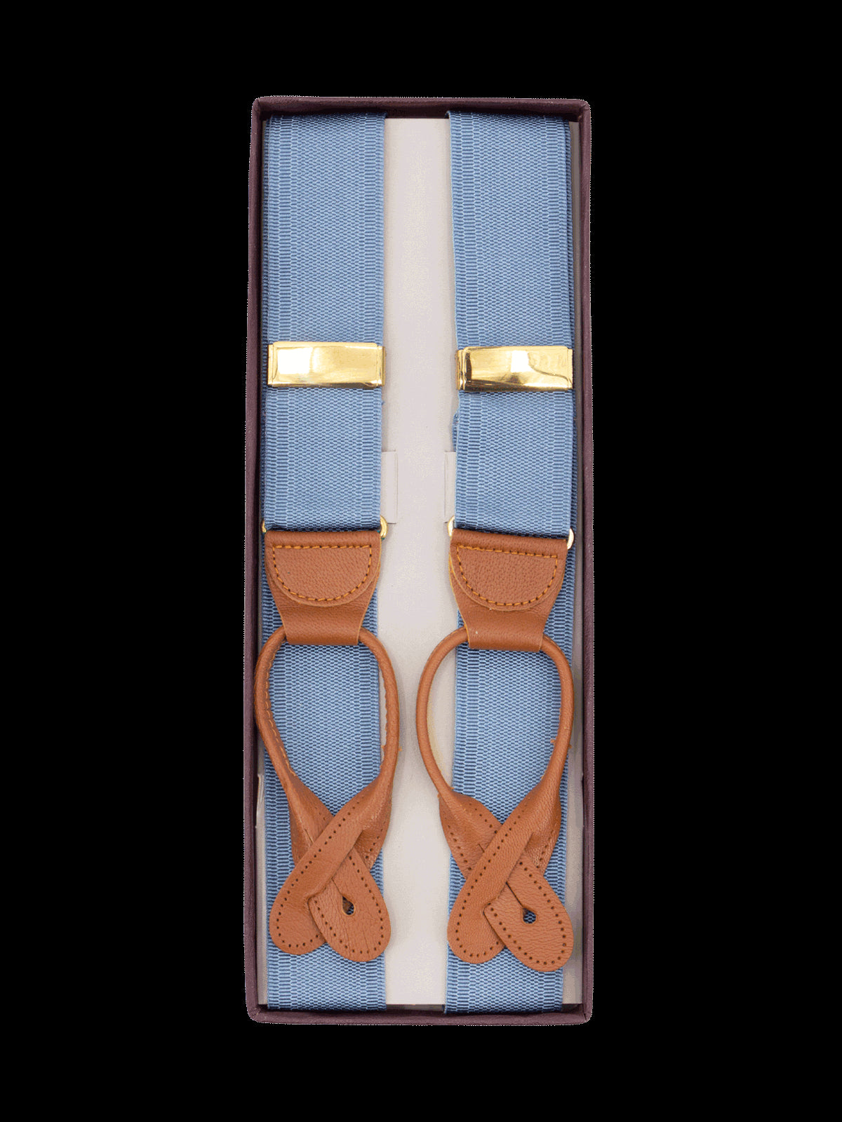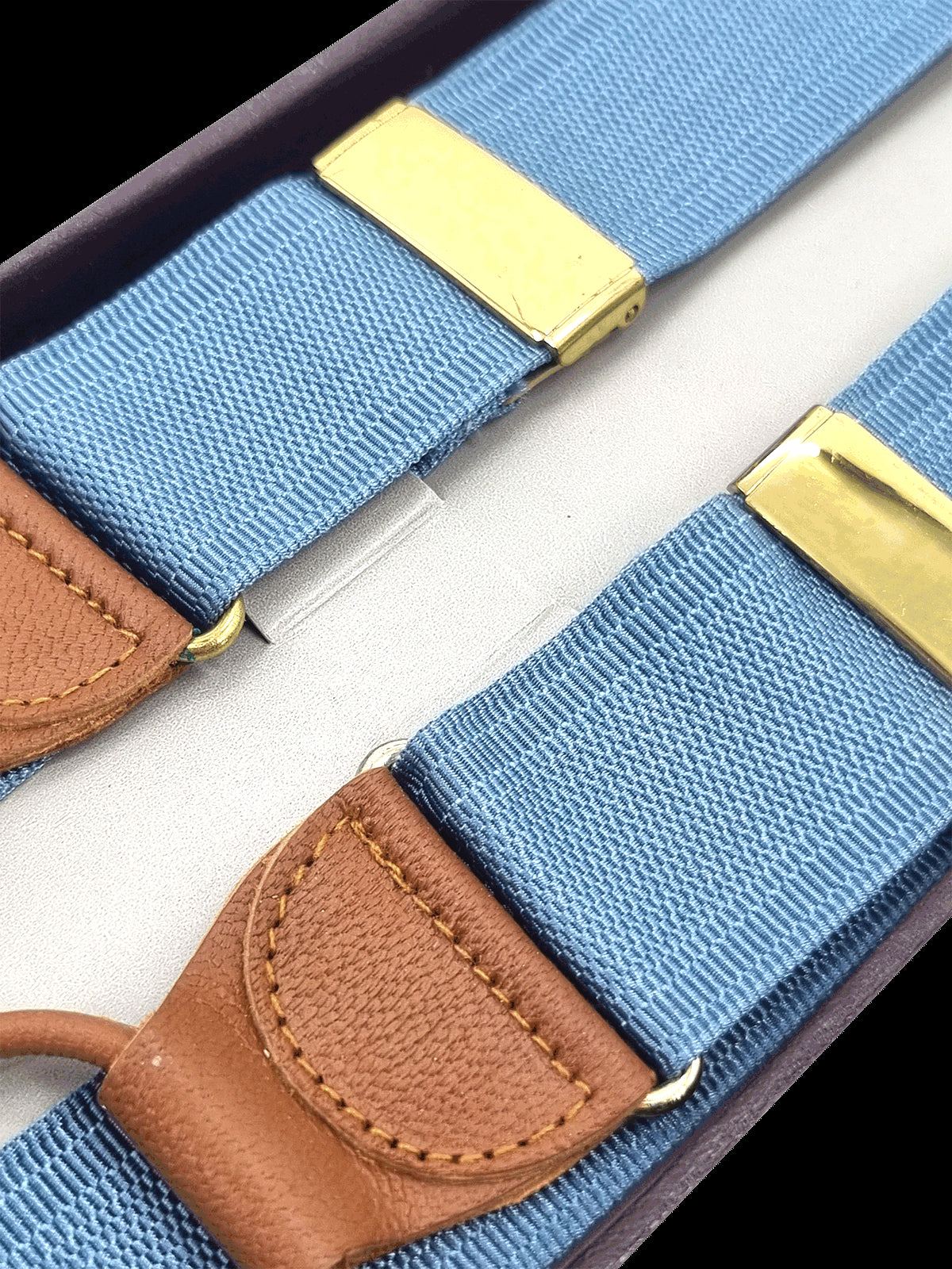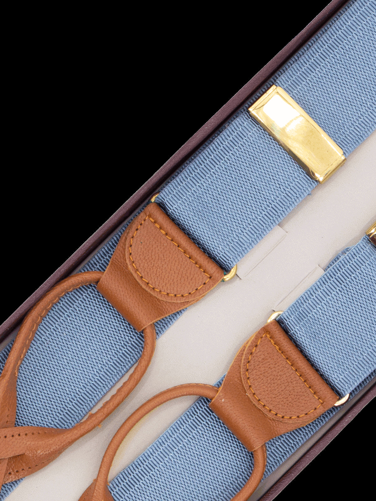 Handcrafted deadstock trouser braces in a classic light blue plain woven fabric, finished with sleek tan leather loops for fastening to trouser waist buttons. Expertly handmade and fitted with adjustable brass fittings for a refined, comfortable fit, they feature a classic ‘Y’ back construction.