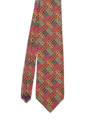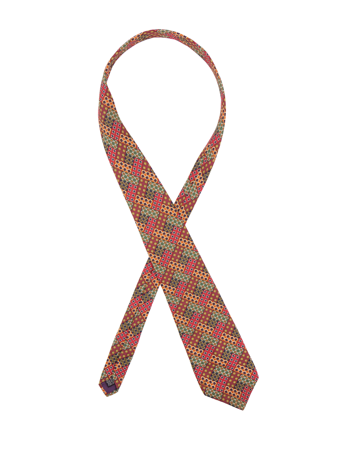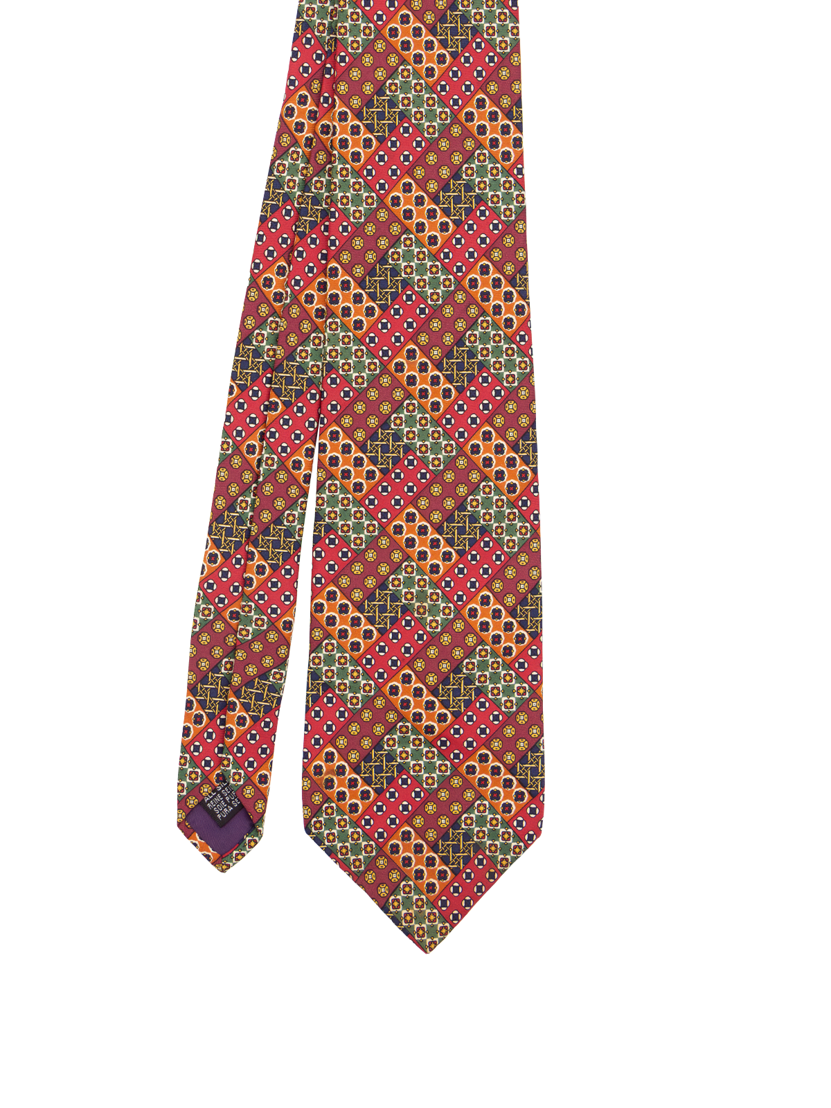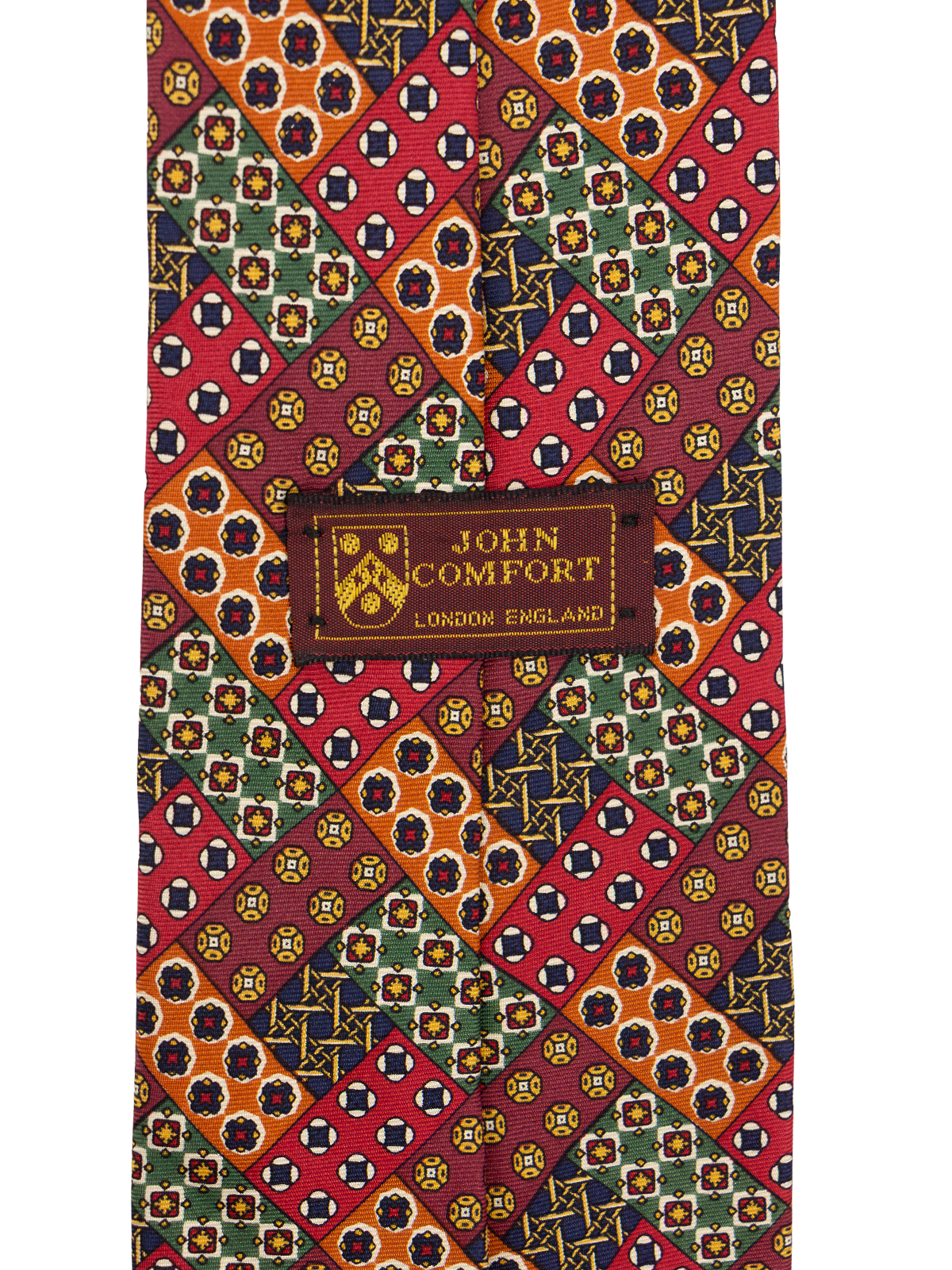 True vintage all-silk tie by John Comfort of London. Features a multicolour tile pattern in a domino style design, combining burgundy, red, navy, orange, yellow, and green for a bold yet balanced look. There is a small pull approximately 15 inches up the tie, visible on close inspection.