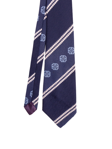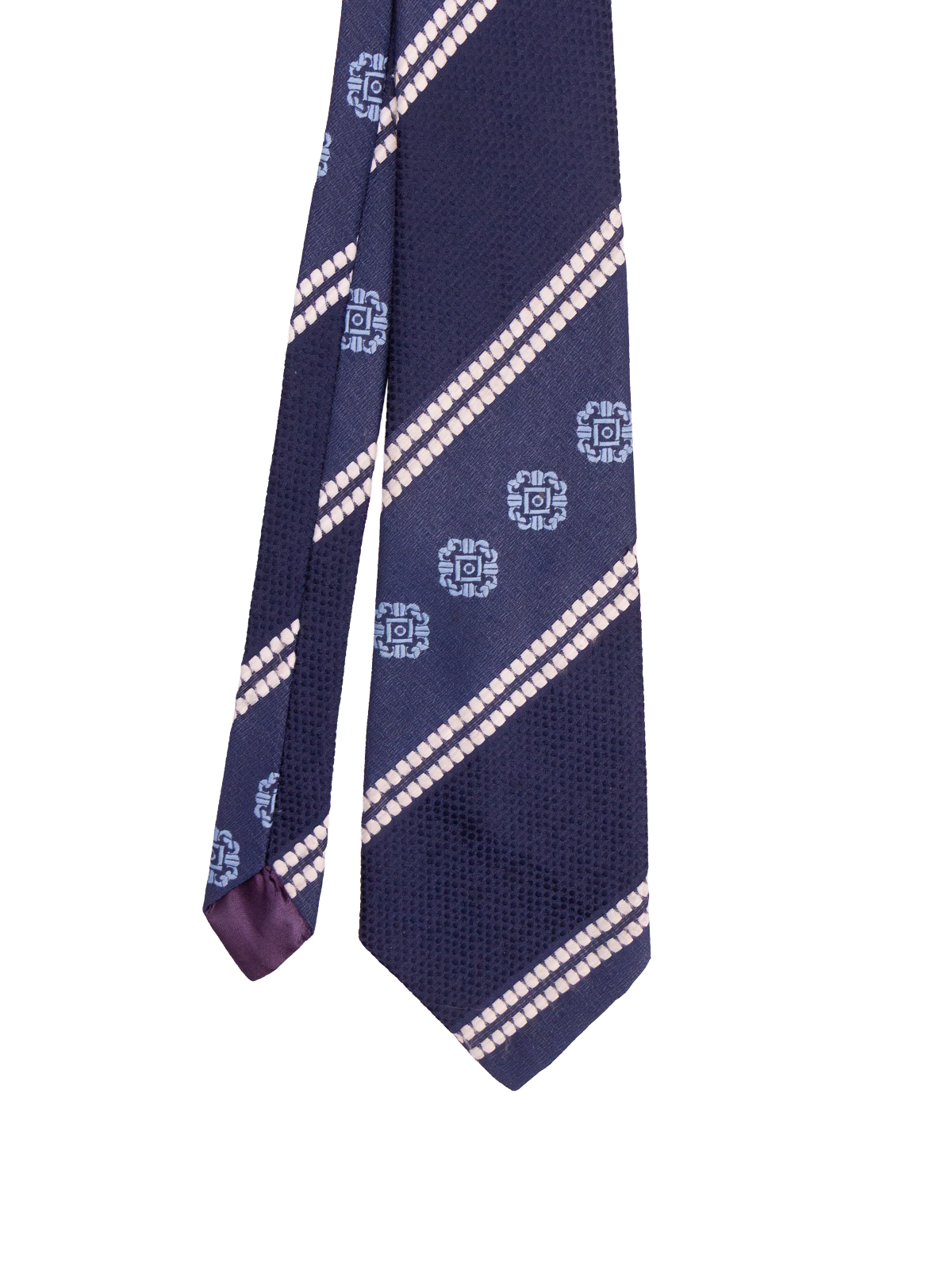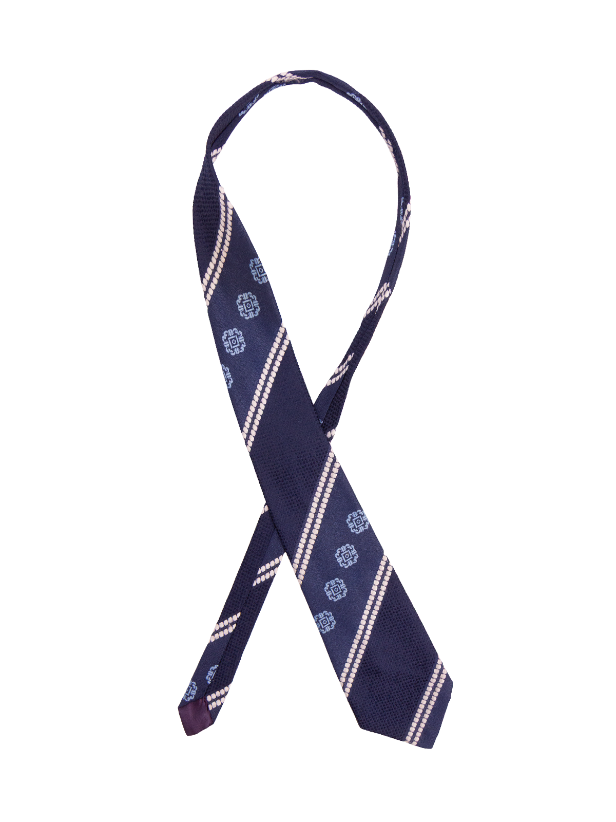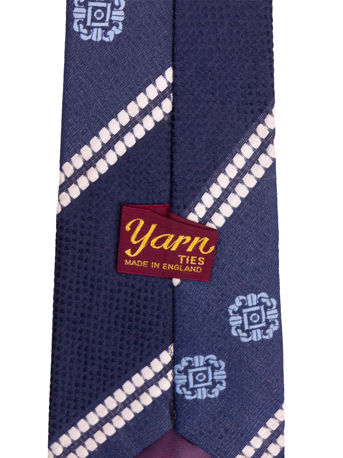 True vintage polyester tie by Yarn Ties. Features a classic white diagonal stripe design accented by light blue geometric emblems on a navy textured background. A bold statement piece with distinctive vintage character.
