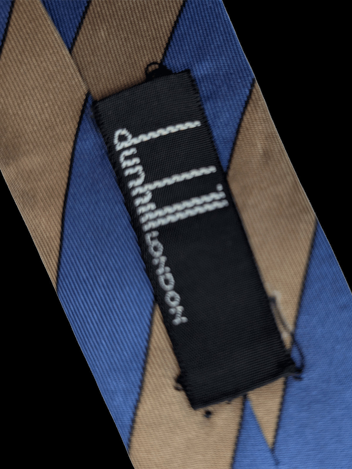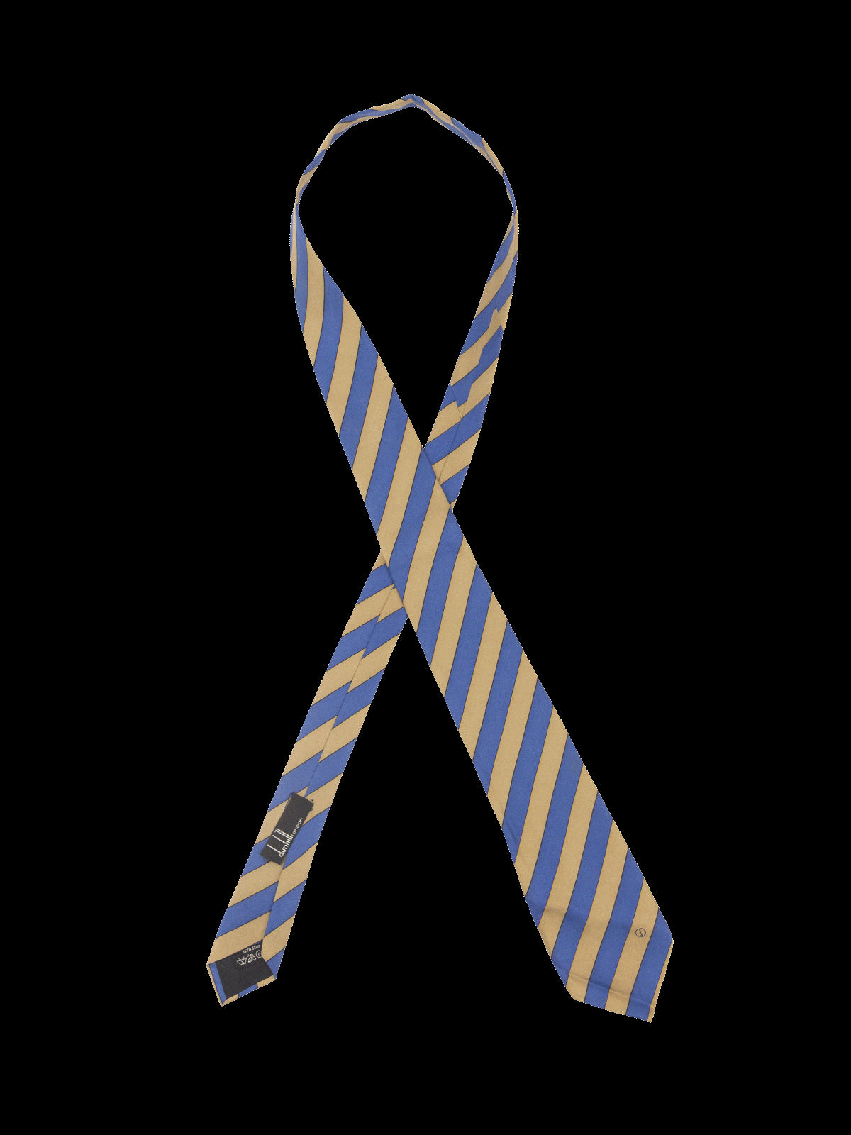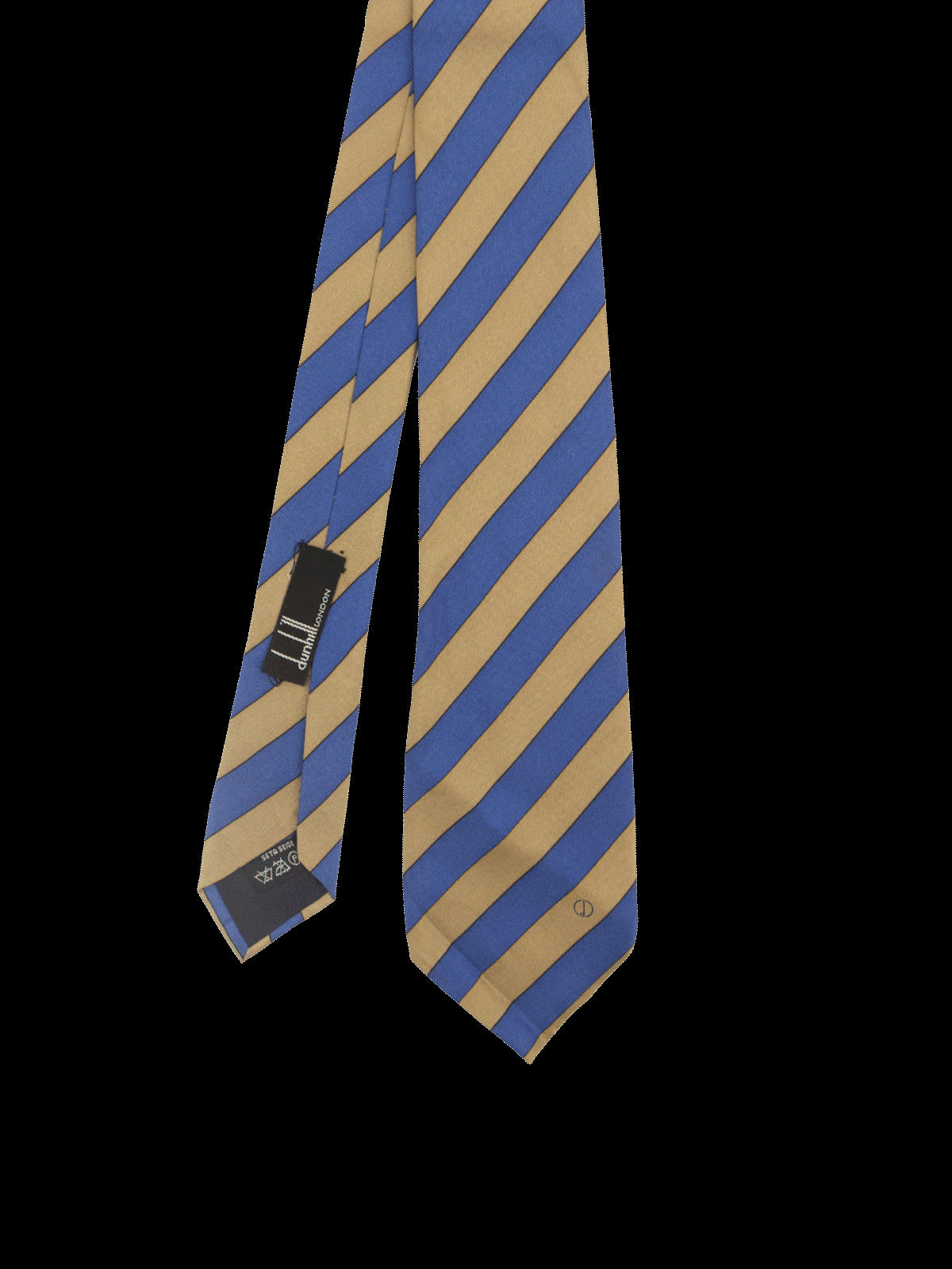 A designer tie with the quality you would expect from Dunhill London label. Featuring a classic college stripe design in a striking combination of blue and gold. Add a colourful pop to your vintage outfit with this statement accessory.