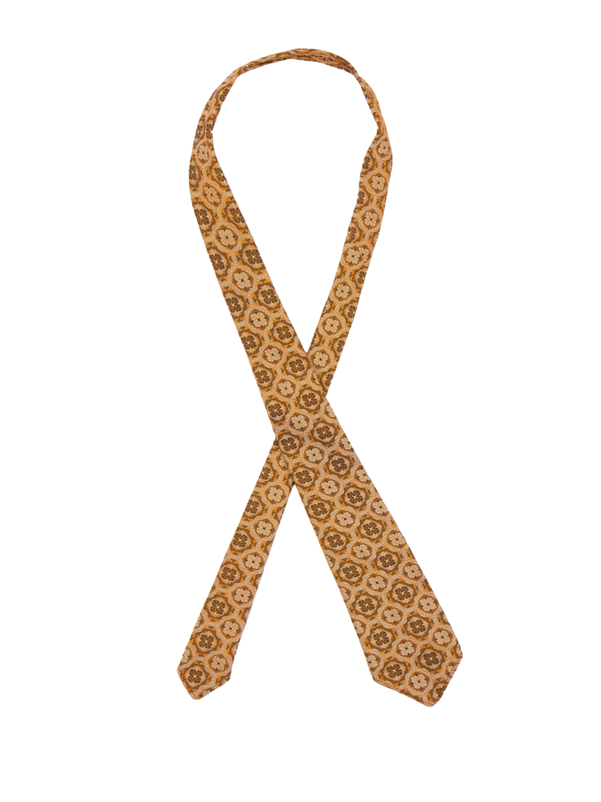 An eye catching true vintage tie featuring an opulent tonal gold tile pattern with striking black and white highlights. Cut in a skinny tie style, a bold statement piece that brings vintage glamour to tailored looks.