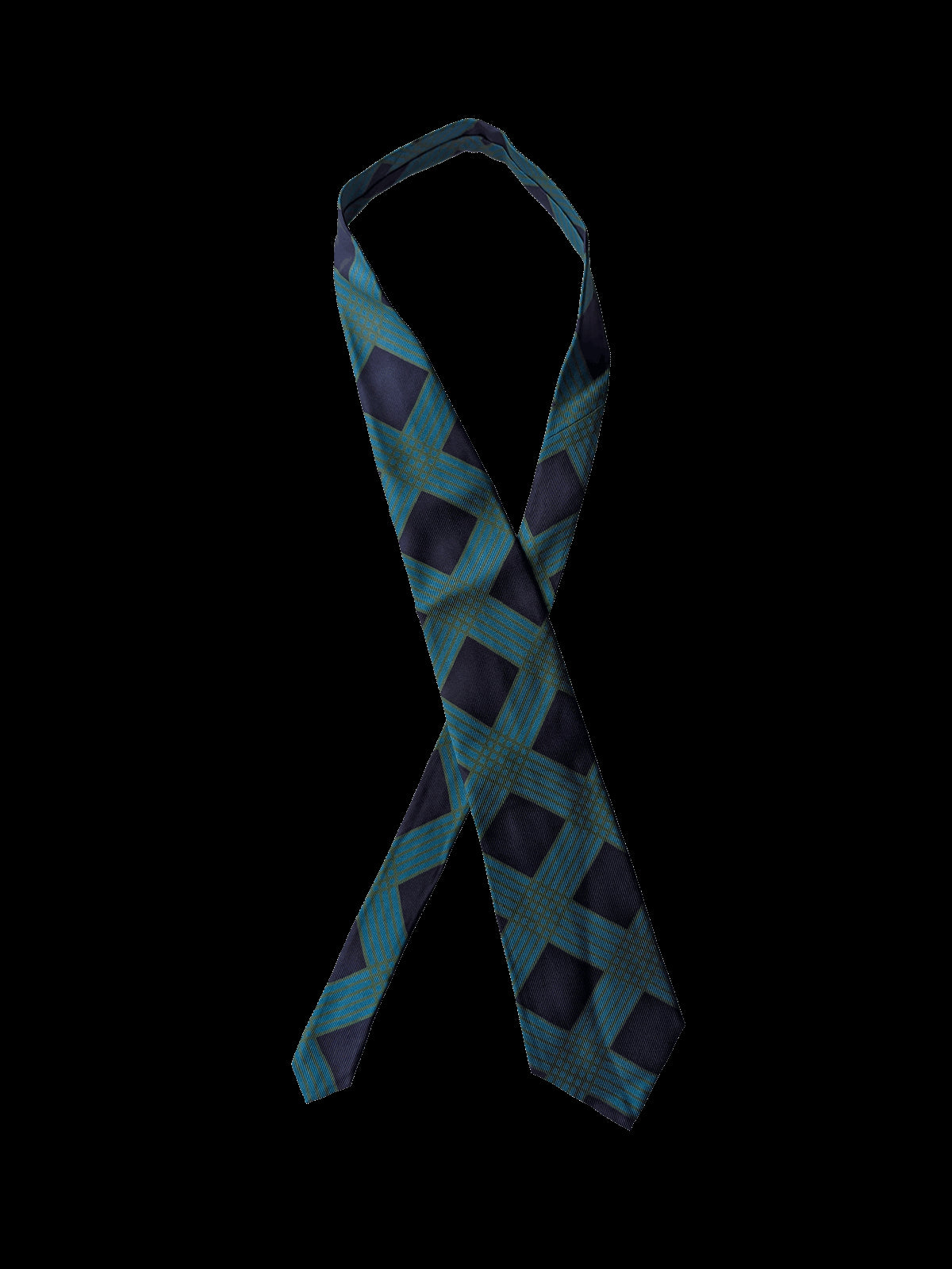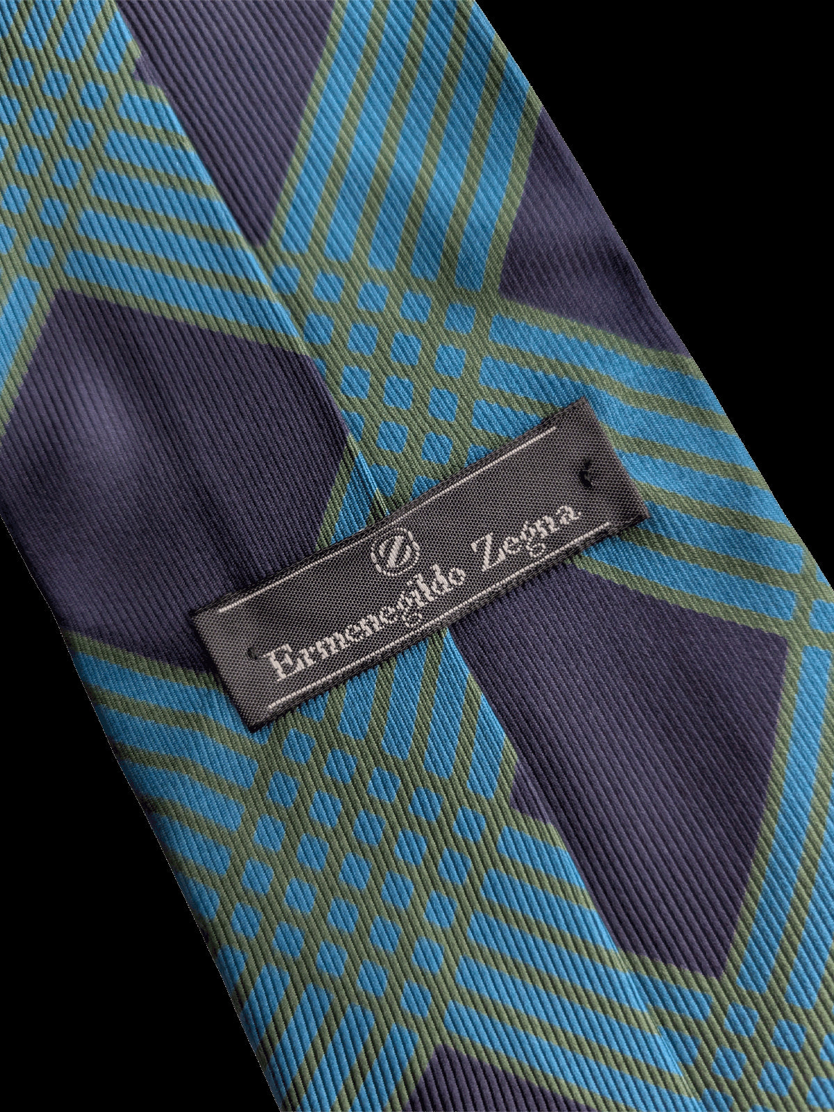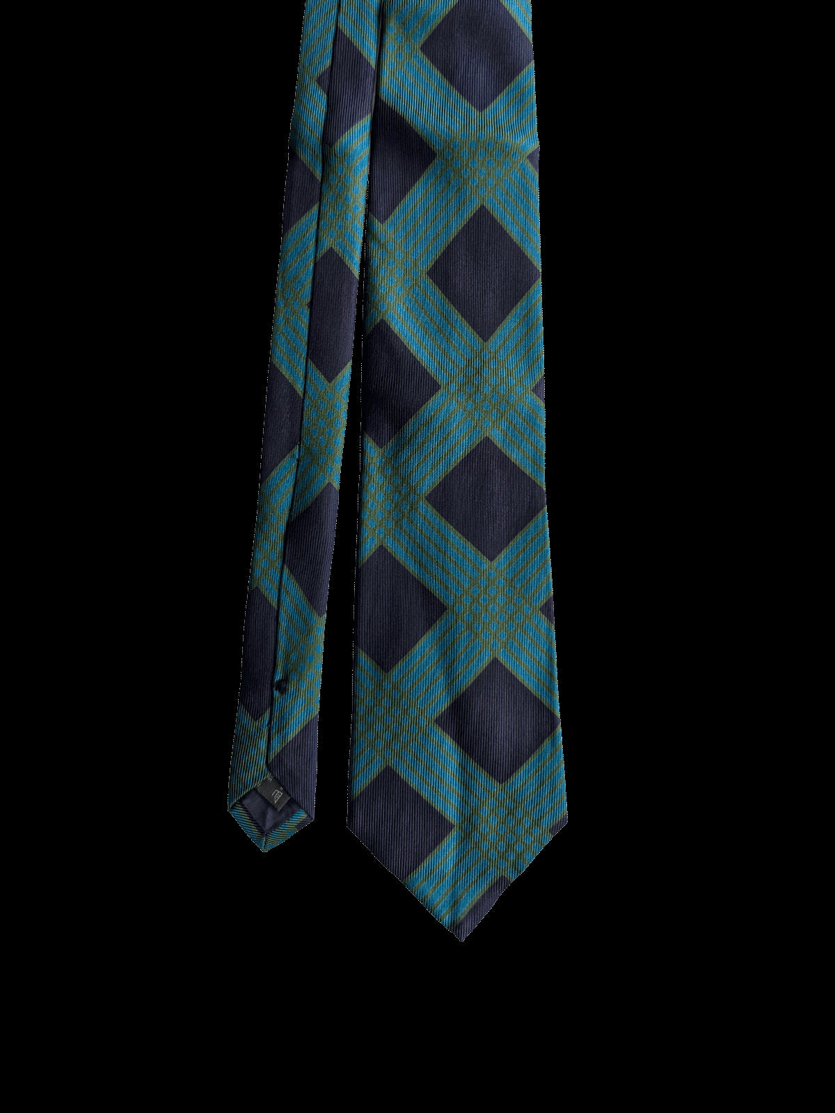 A designer tie with the quality you would expect from Ermenegildo Zegna label. Highest quality silk in a bold finish. Featuring an eye catching geometric repeat pattern of overlapping diamonds in navy blue, teal blue and green. An eye catching neck tie for the discerning Gentleman.
